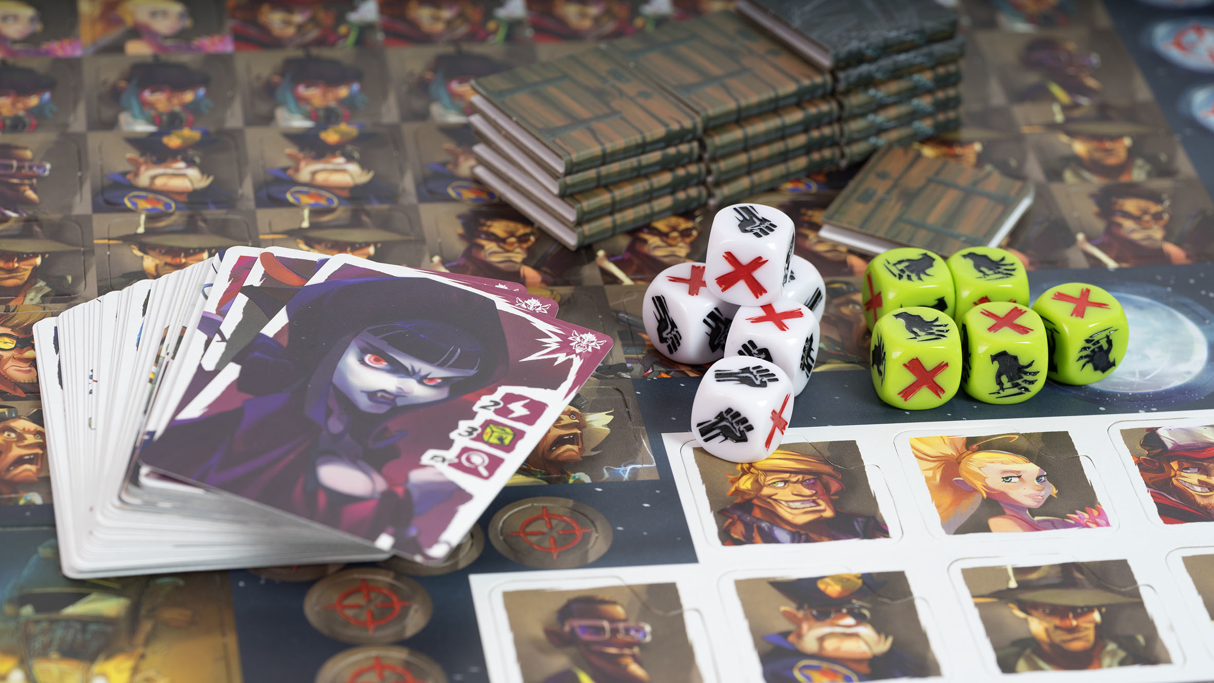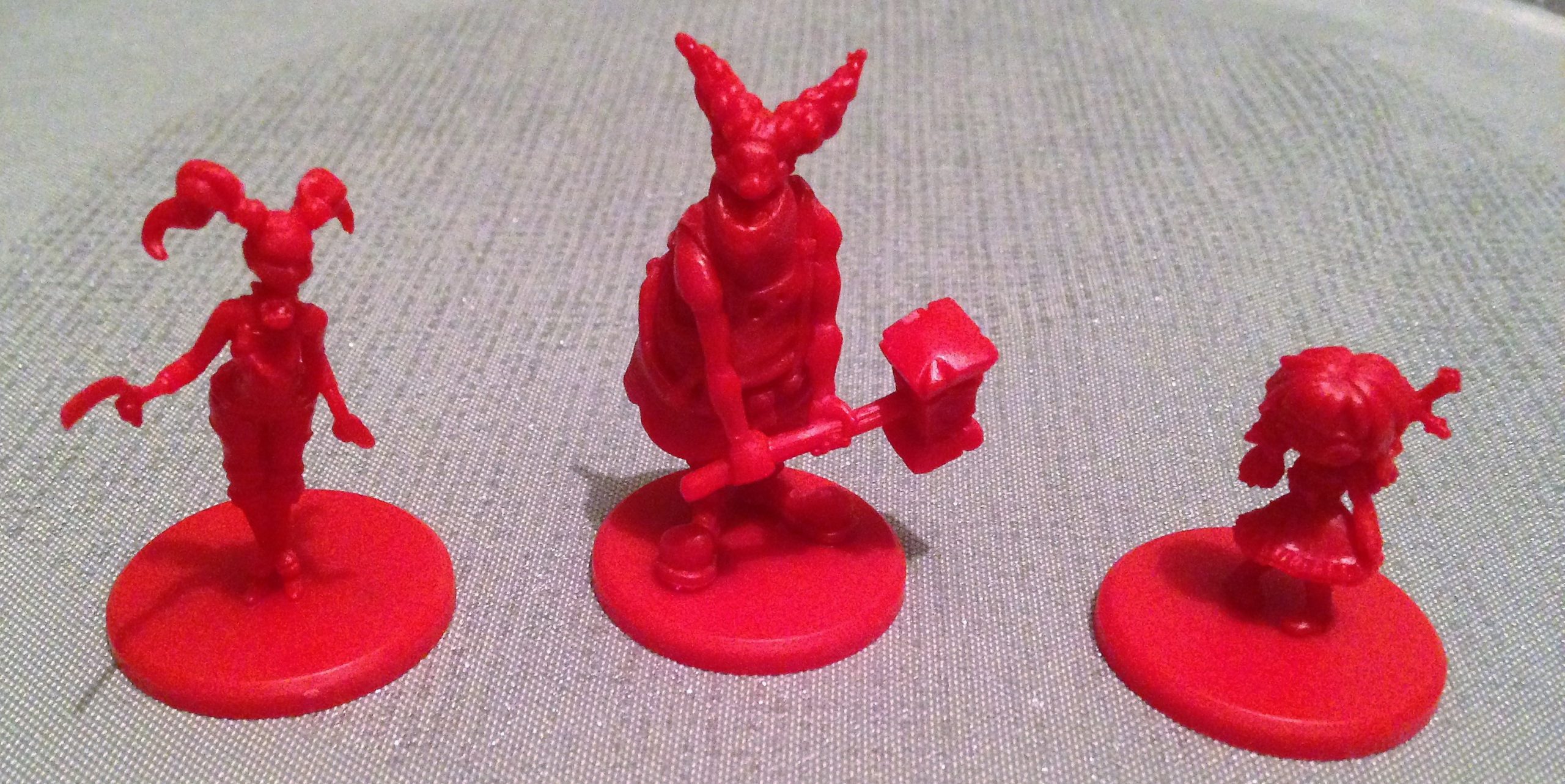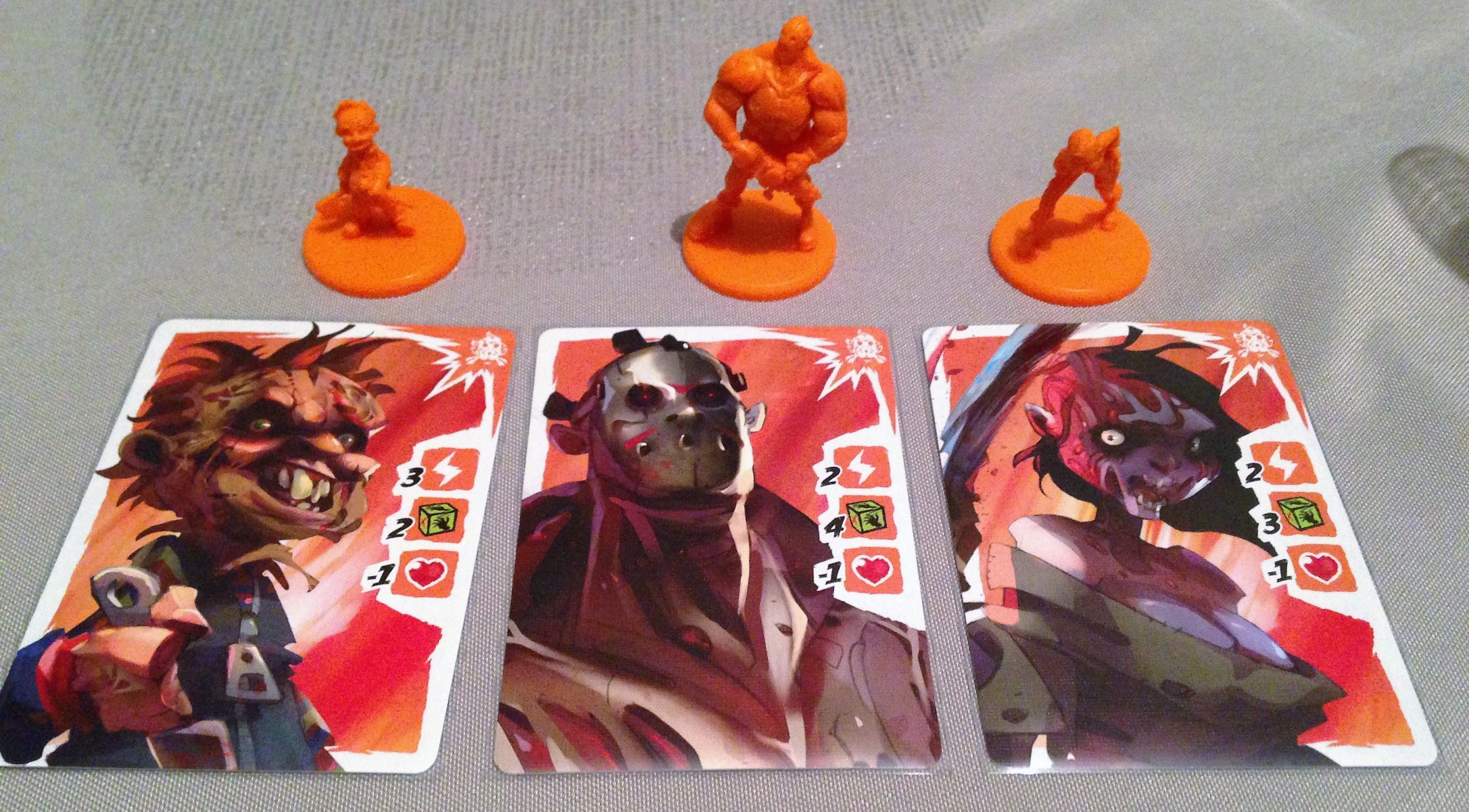 En tant que famille de tueurs/monstres à la recherche de votre prochain repas, vous avez à votre disposition 3 personnages, le papa, la maman et le rejeton. Ils se différencient à peine dans leurs capacités – le père aura + de dés à lancer, la mère + d’actions possibles etc – et ils se différencient à peine des autres familles – chaque famille a un pouvoir spécial, sinon tous les rejetons ont le même nombre d’actions, les papas les mêmes dés à lancer etc… .