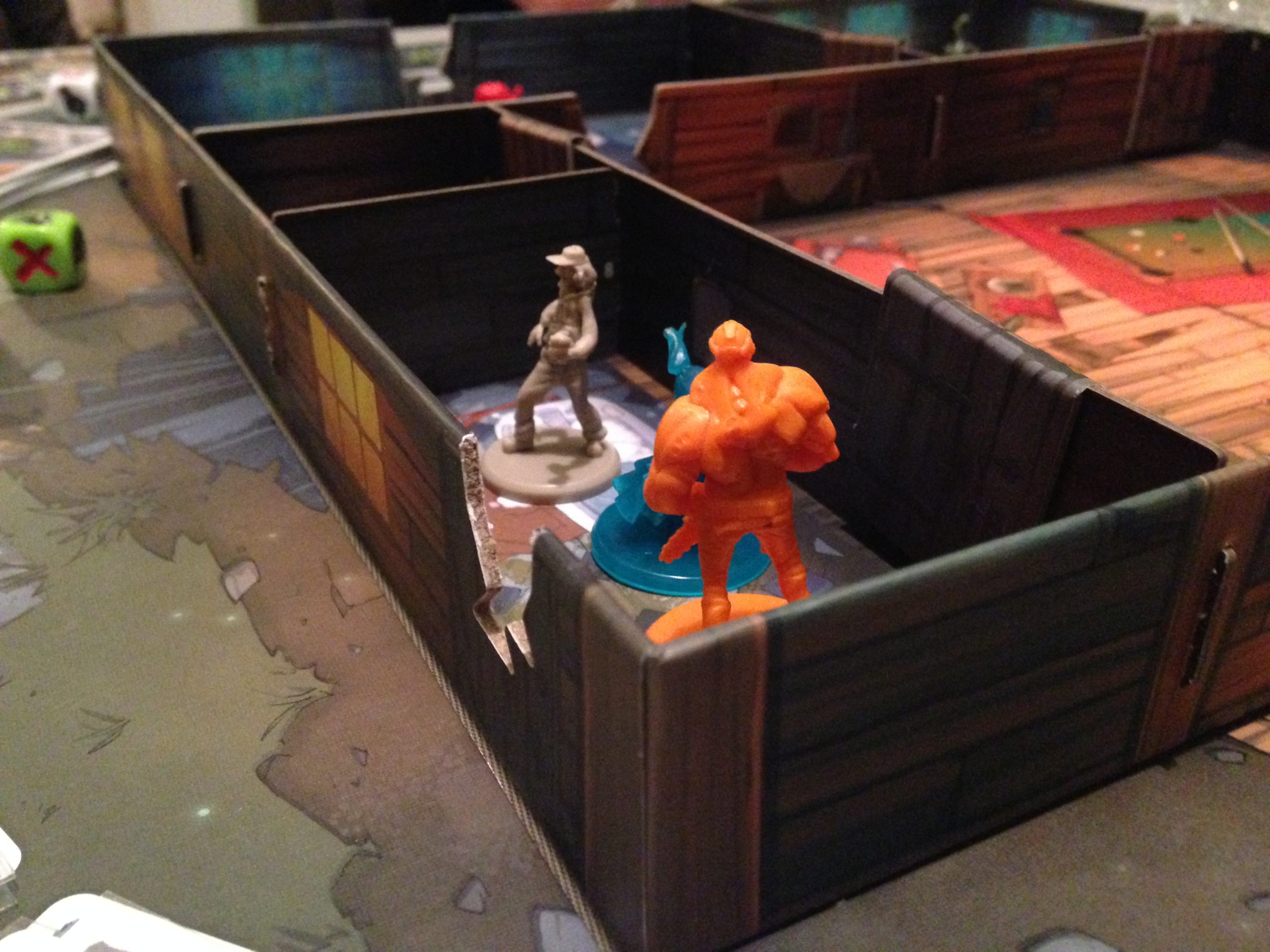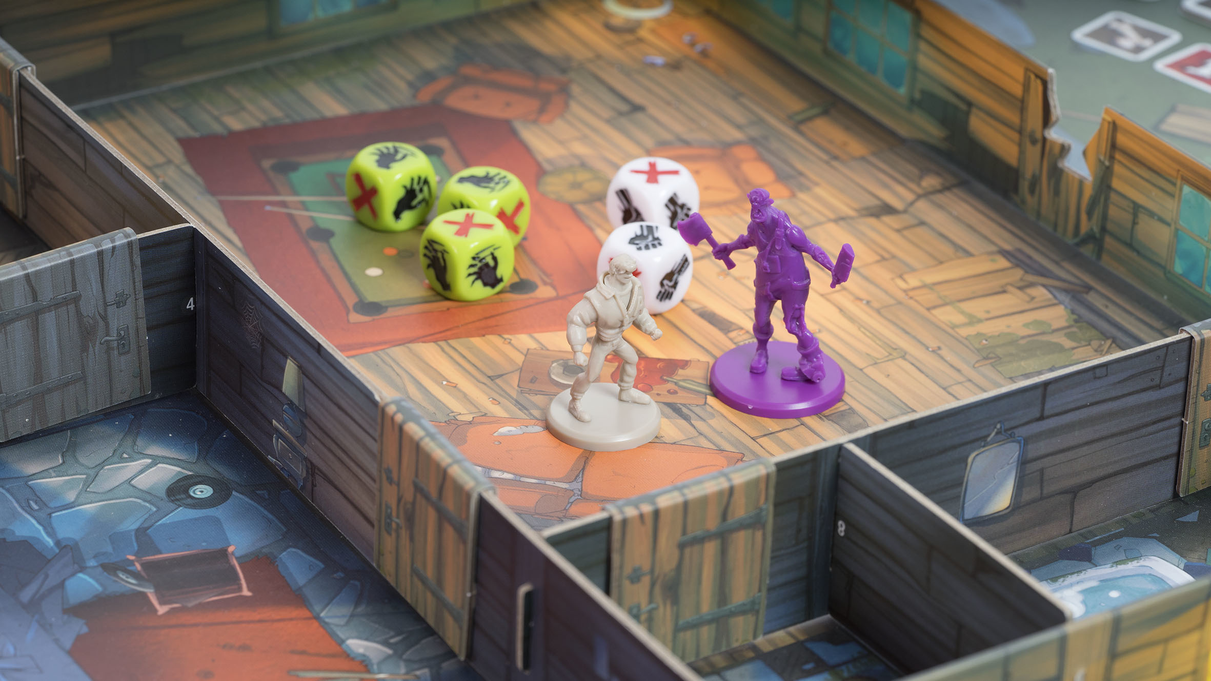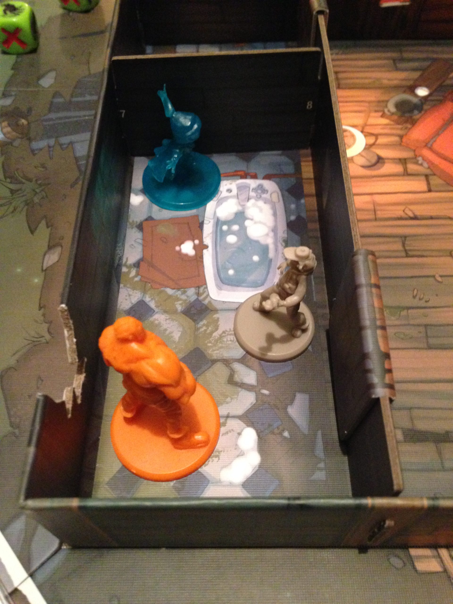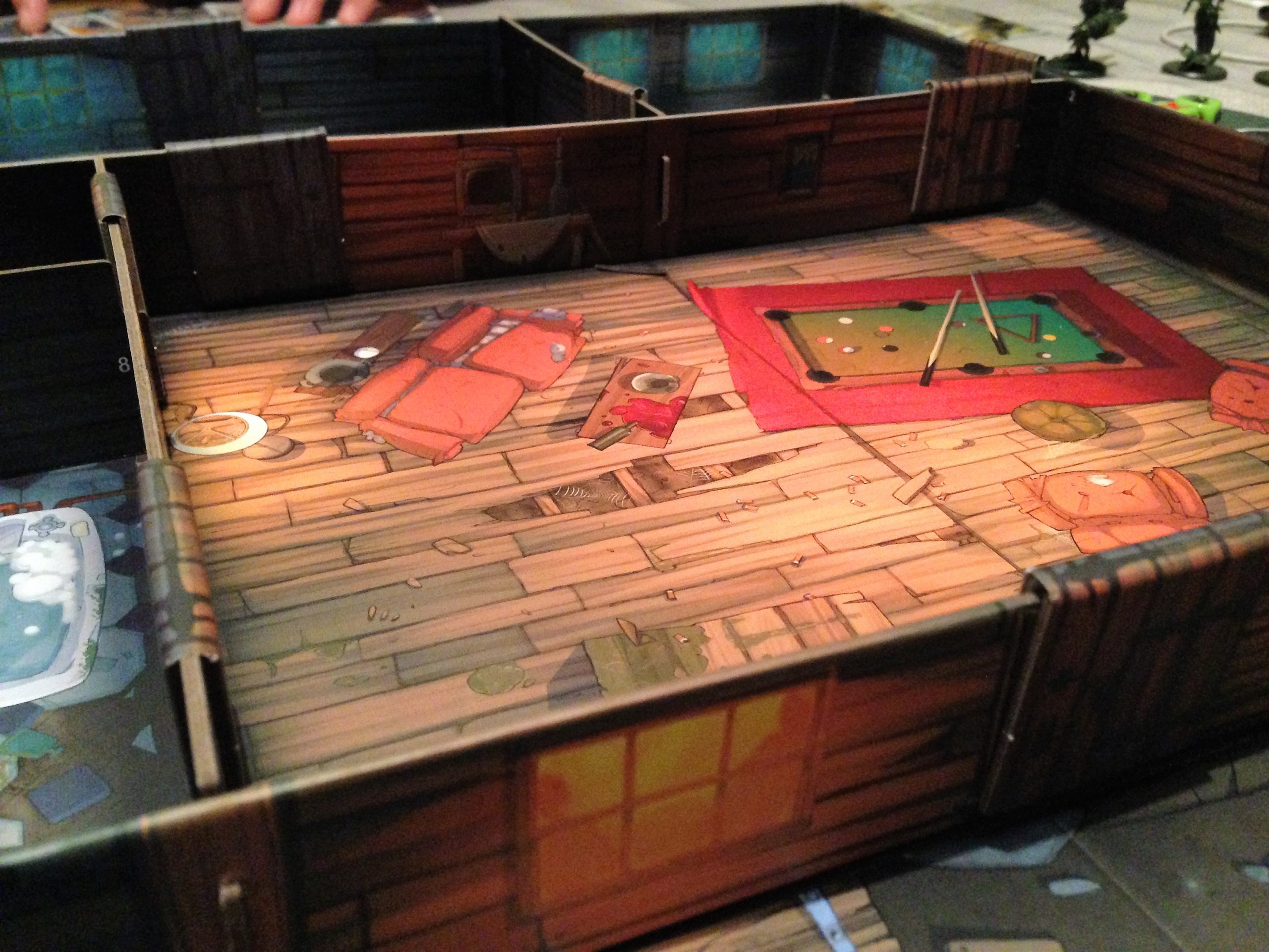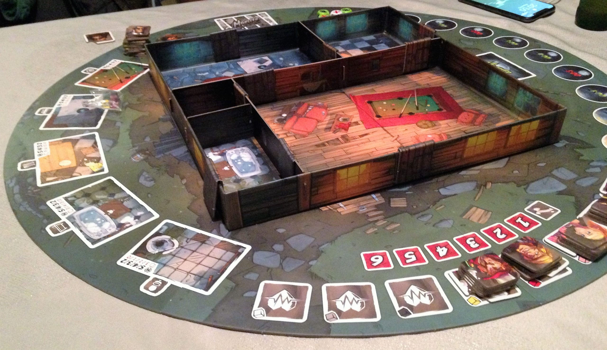 Mention spéciale au matériel de très bonne facture avec une très bonne idées d’utilisation de la boite de rangement. Le fond de la boite fait office aussi de murs pour la maison qui est l’élément central du plateau. Les figurines sont bien détaillées et les illustrations de jeu sont vraiment plaisantes et participent à l’immersion dans le thème! Une vraie réussite visuelle.