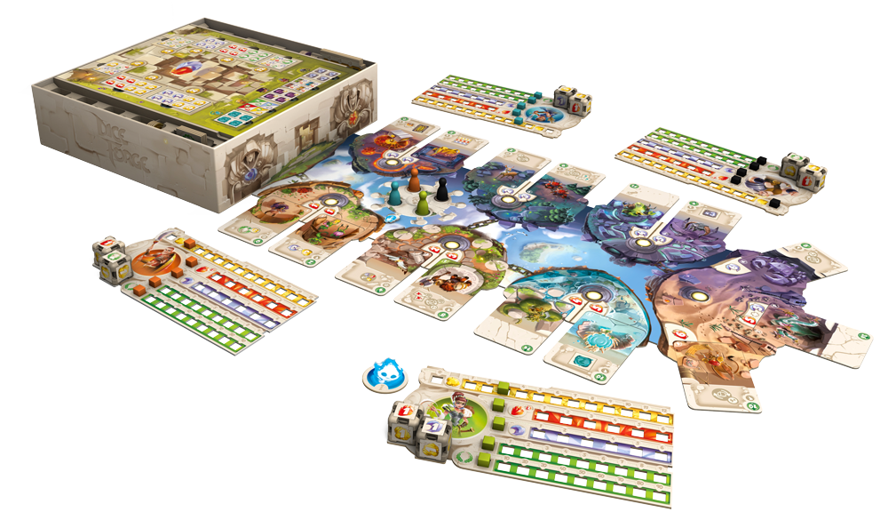 Jeu familial qui pourra plaire à tout le monde, Dice Forge n’en oublie pas pour autant les joueurs avides de parties + corsées et permet ,en modifiant les sets de cartes de départ, d’augmenter cette profondeur et richesse de jeu. Le matériel est superbe, les illustrations très colorées et très dynamiques, et le thermo de rangement de la boîte est à vous faire pâlir + d’un éditeur, la plupart ne sachant même pas que ça peut exister, et se contentent de vous fournir une boîte sans rangements, avec quelques sachets zip si c’est un bon jour. 😉
