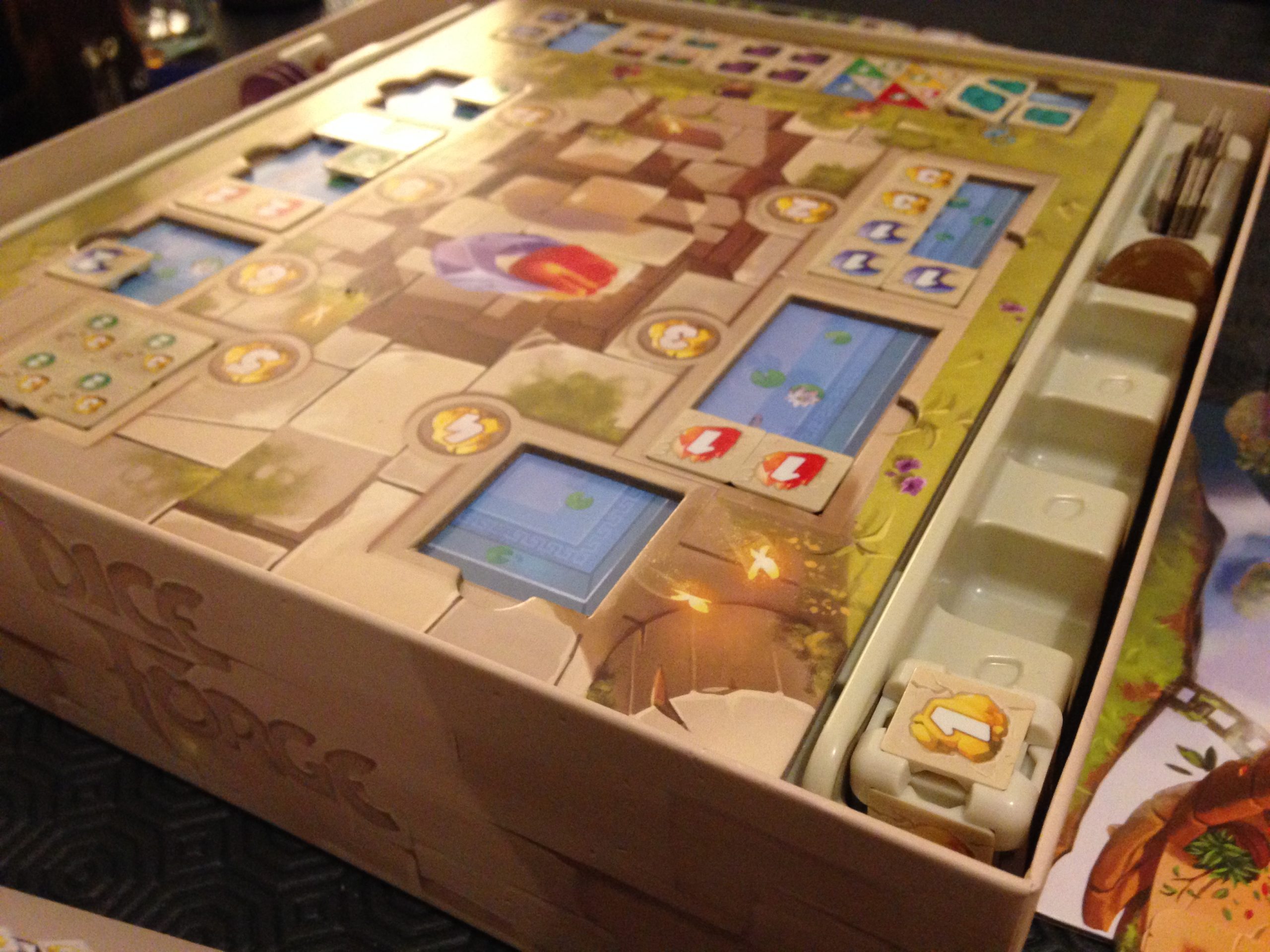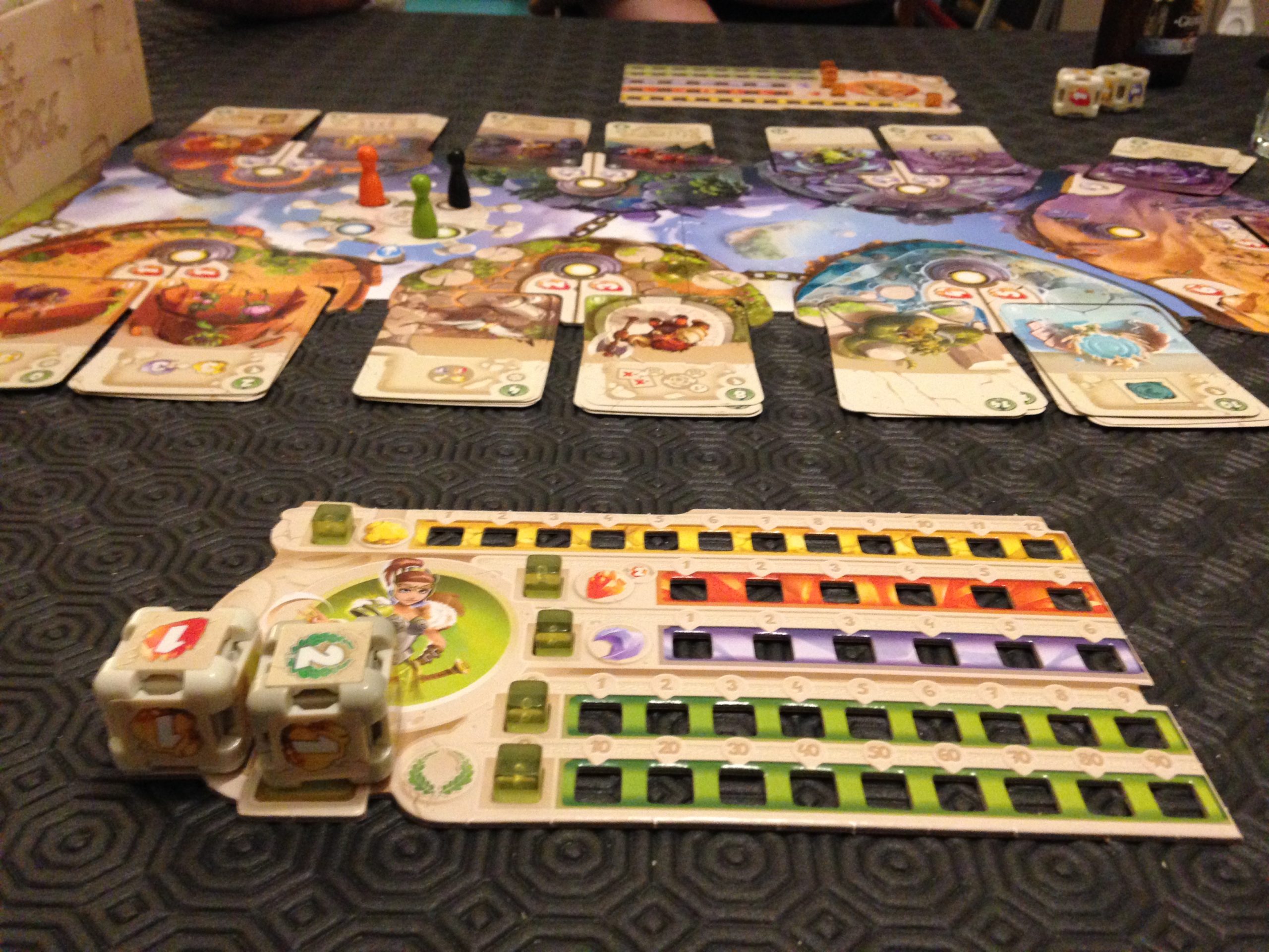 Le plateau central représente les îles des différents Dieux, avec des portails pour y accéder. Des cartes exploits y sont positionnées, et pour les accomplir (les acheter), les joueurs se déplaceront sur les îles concernées.