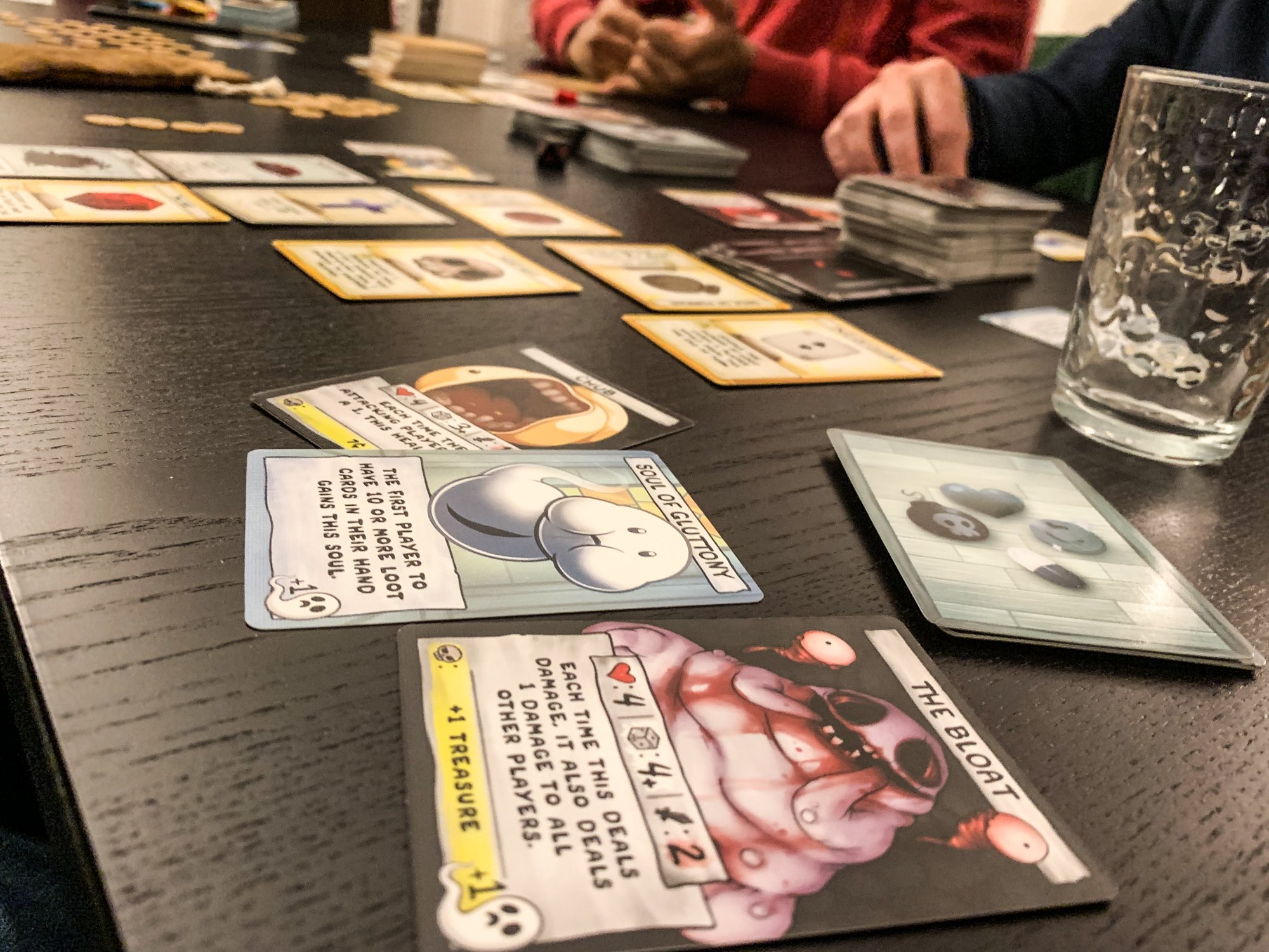 Pour ce qui est de la mise en place, trois pioches sont réparties sur la table : le loot, les trésors et les monstres. Dans le cas de ces deux derniers paquets, les deux premières cartes de chacun sont dévoilées et posées faces visibles sur la table. Chaque joueur reçoit au hasard l’un des 15 personnages proposés, le trésor attaché au personnage reçu (on retrouve là Isaac et son D6, Judas et son Book of Belial… les joueurs ayant poncé la version vidéoludique du jeu ne seront pas dépaysés), trois cartes loot et trois pennys.