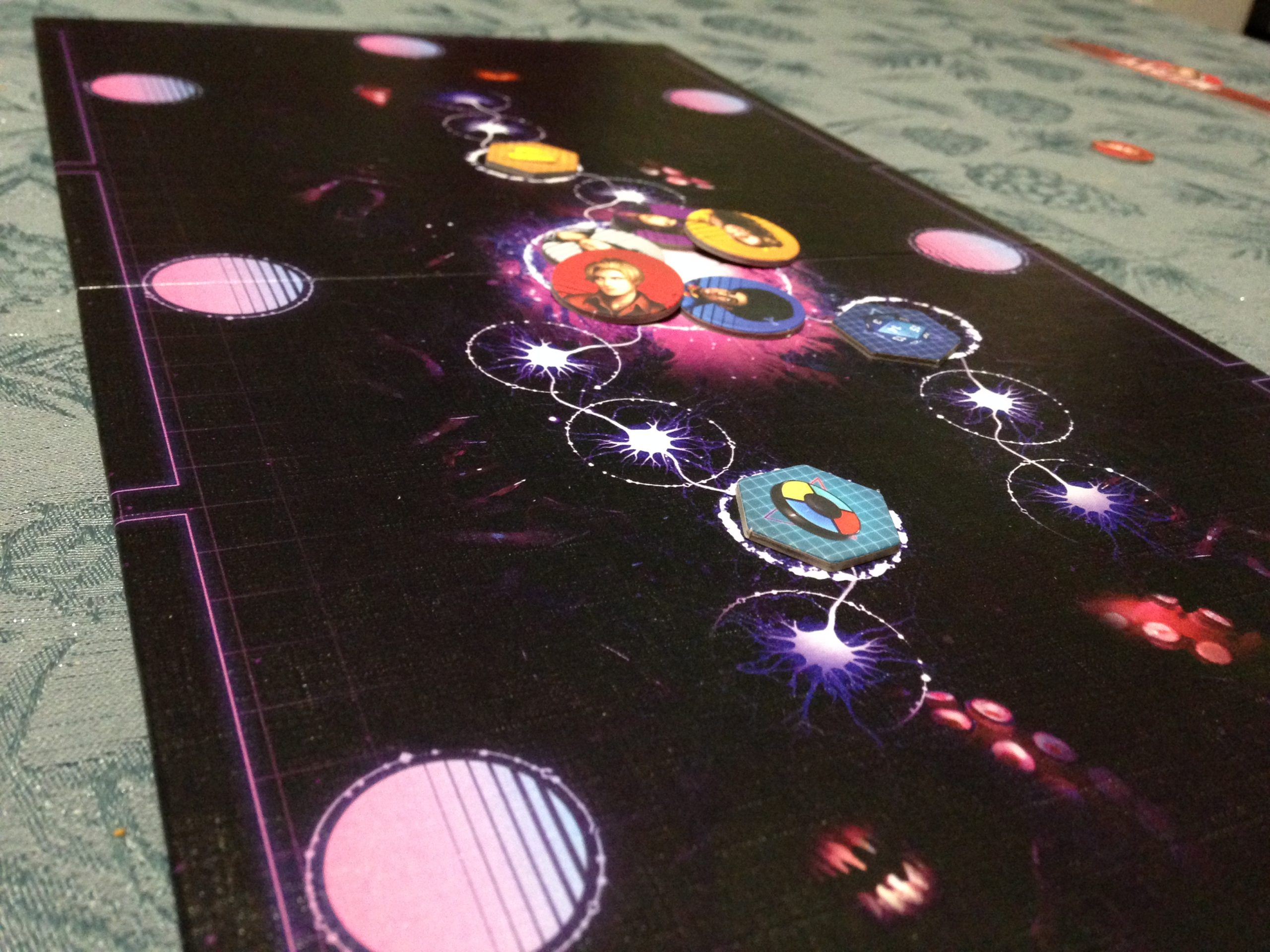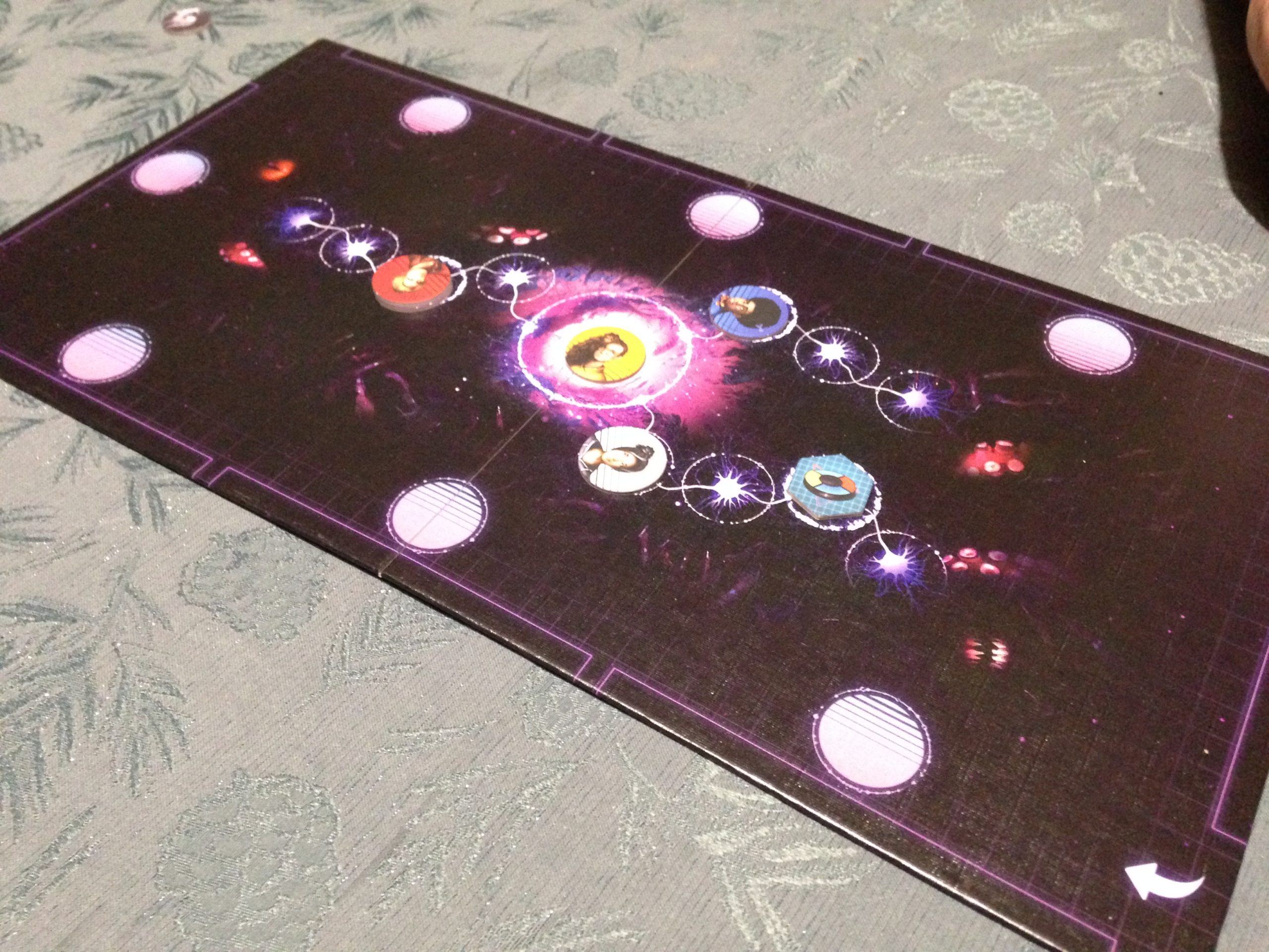 Le plateau central représente les passages vers l’Autre Monde. On y place les jetons personnages au centre du plateau, et en fonction des résultats des différentes manches, les personnages dériveront vers la fin des routes tracées sur le plateau, et donc vers la défaite de toute l’équipe, ou bien au contraire, approcherons du point de rendez-vous et de la victoire.