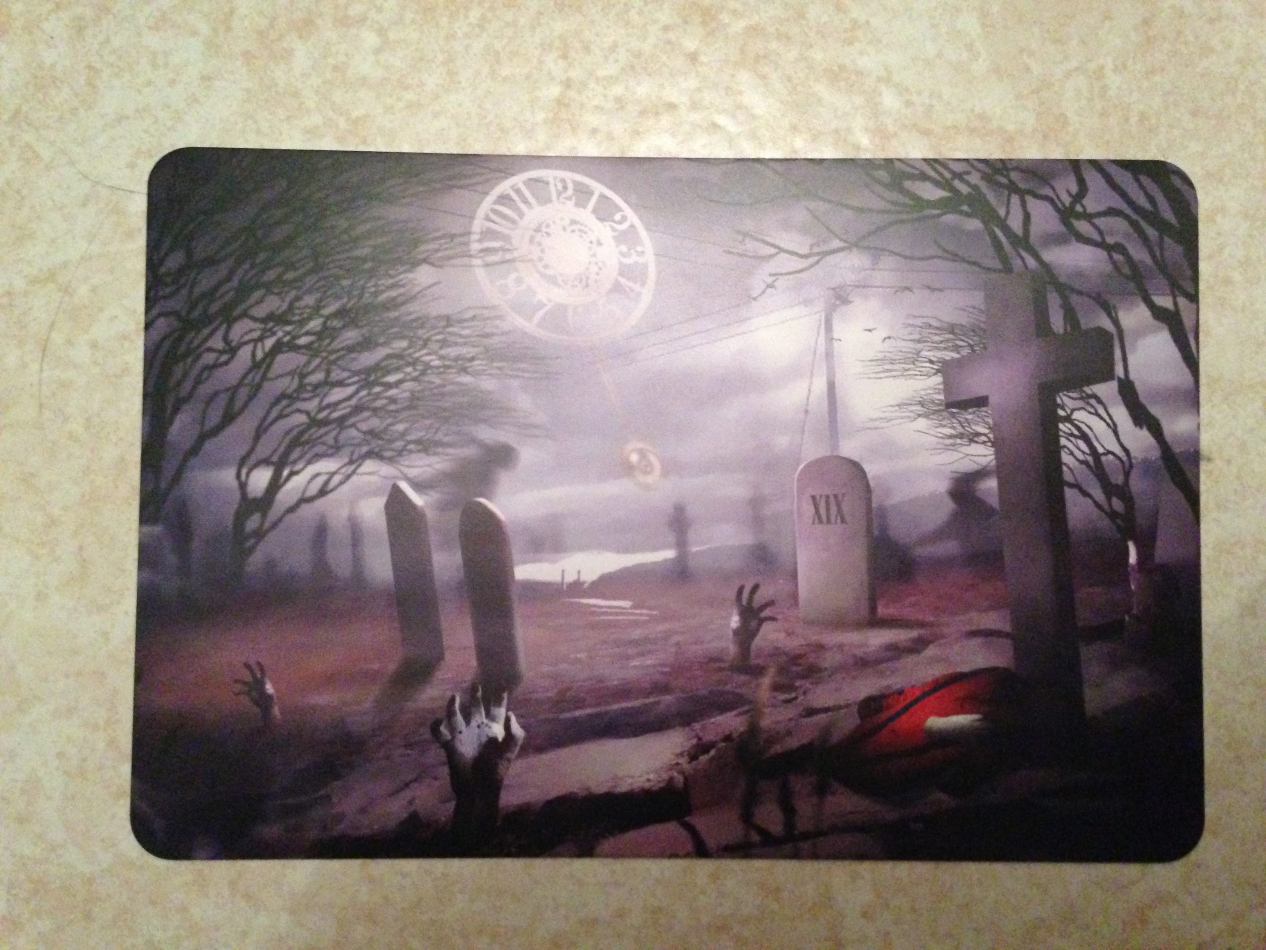 - Phase de narration: Chaque joueur décrit sa carte, mais aussi les intentions de son personnage (fuir, se battre, chercher un véhicule etc…). Par exemple je me retrouve avec la carte ci-dessous devant moi, je vais alors la décrire « Je suis dans un diner américain où je suis le seul client, il y a un chapeau laissé sur une table, une lumière rouge intrigante fend l’air. Il pleut dehors. Le mur du fond est décrépit et je vois même à travers une partie du mur qui est tombé. Une espèce de vapeur rouge tel du sang recouvre un carrelage en sale état, cassé à de nombreux endroits. Le pire ce sont les énormes vers de terre qui rampent le long des murs. » Je décris ensuite mes intentions: « Je me barre! Je mangerais pas ici ça c’est sûr! Pas non plus envie de me faire boulotter par un ver, je sors de cet endroit flippant! ».