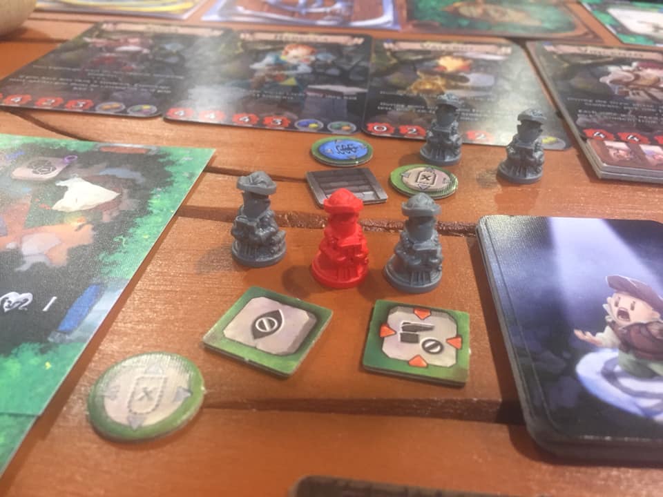 Un peu d’aléatoire en tirant les zones du donjon au fur et à mesure de l’exploration, en tirant des cartes ruses qui alimenteront les mains des joueurs pour les jouer durant leurs actions, ou en réaction aux événements. La pioche des étudiants dans un sac opaque et la possibilité de piocher les étudiants maudits qui vont apporter leur lot d’embûches avant d’éventuellement déclenche la fin de partie.
