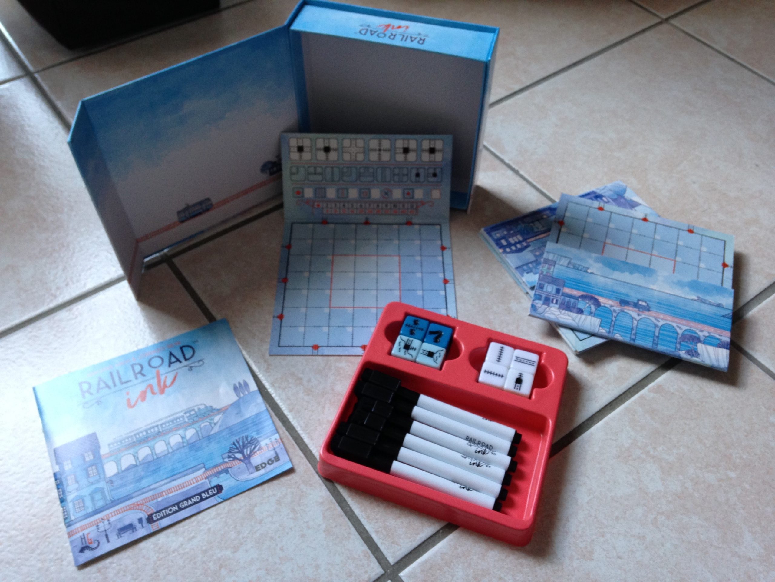Sympathique Roll&Write, Railroad Ink brille par son superbe matériel. Plateaux effaçables et feutres avec embouts tampons pour effacer les tracés après chaque partie (ou en cours de jeu lorsque vous voulez changer votre tracé), le jeu est très classe dans sa boîte à fermeture aimantée, et son thermo pour tout ranger une fois la partie finie.