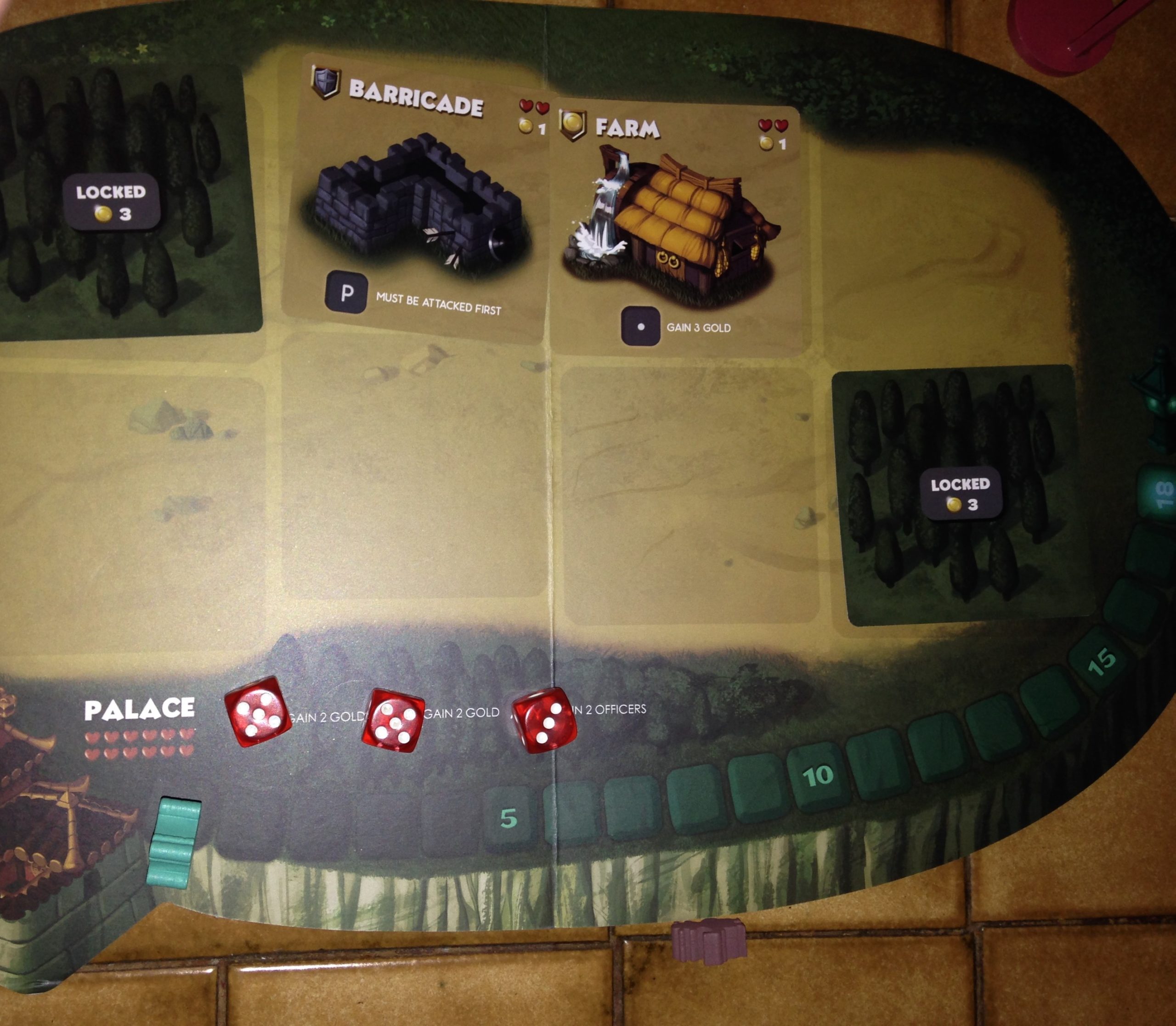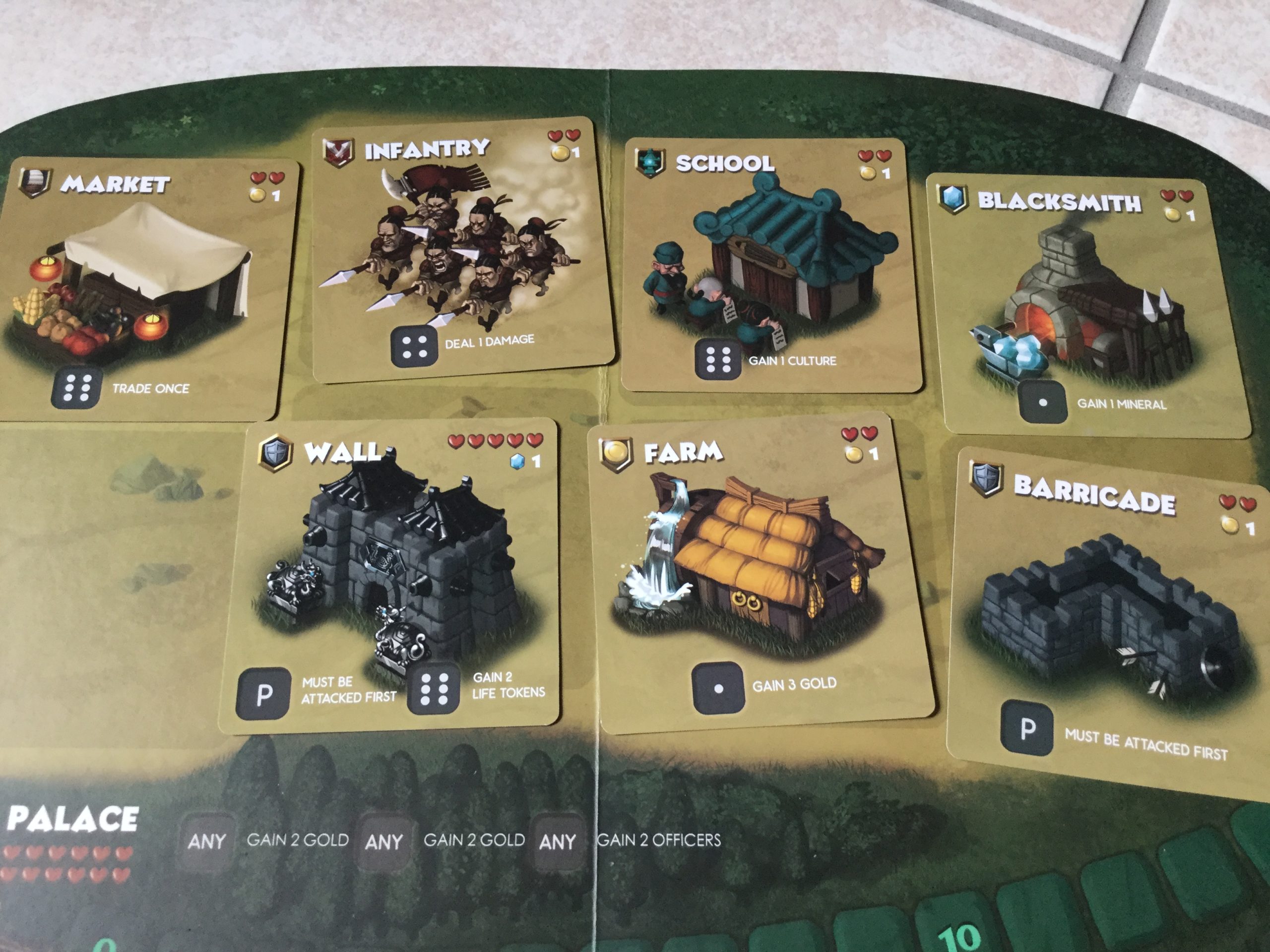 • Phase d’action. Le joueur lance 3 dés (ou + s’il en a acheté lors de la phase d’achat) et va placer les dés sur les emplacements d’actions de ces cartes bâtiments, ou de son palace. Par exemple, la bâtiment forgeron permet au joueur de gagner 1 minerai s’il place un dé avec le chiffre 5 sur son emplacement d’action. Les officiers permettent de modifier le résultat d’un dé.