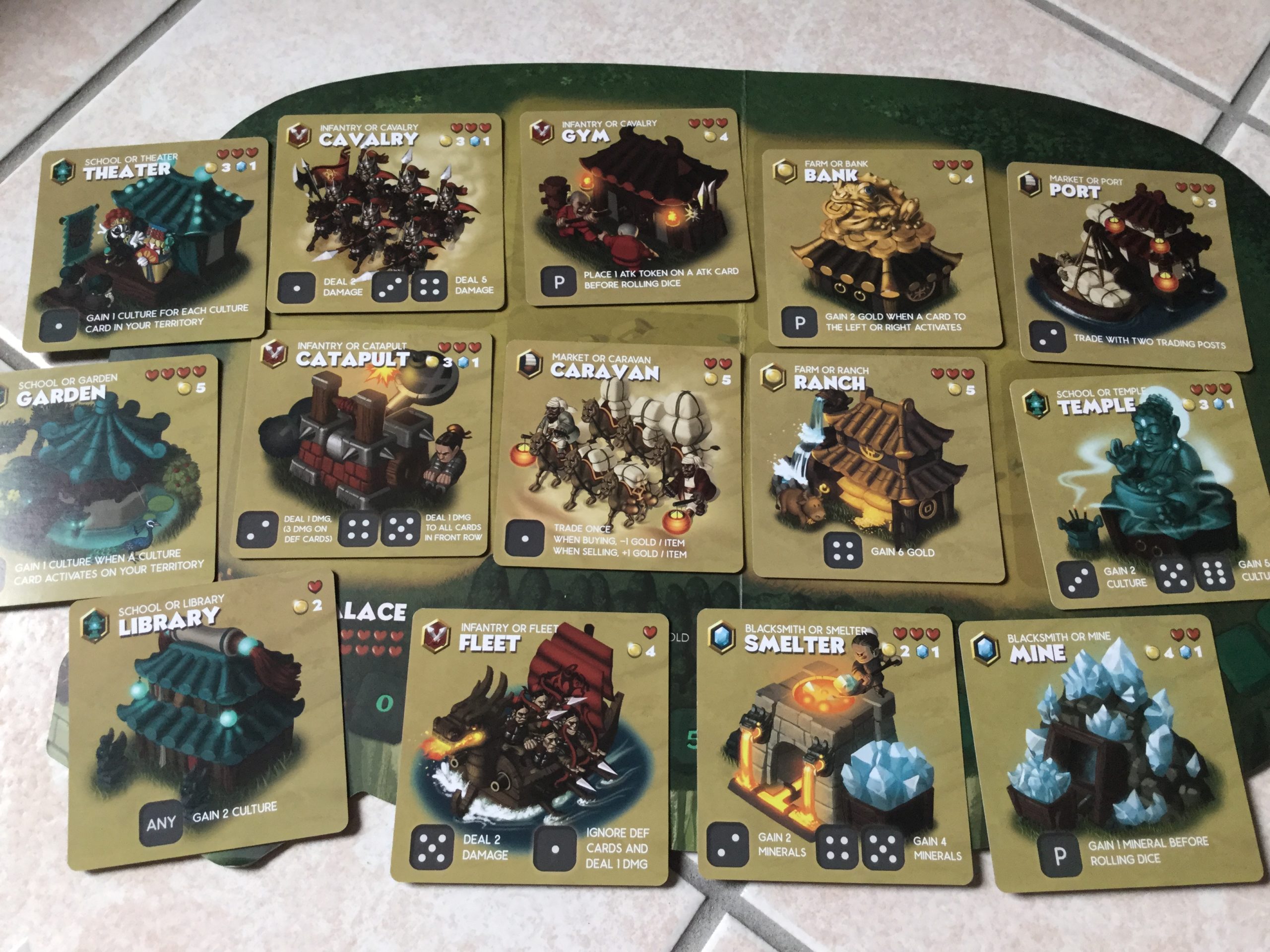 En piochant des cartes bâtiments, et en les construisant sur son royaume, le joueur va potentiellement générer des ressources (or, minerai), de la culture, des points d’attaque et de défense.