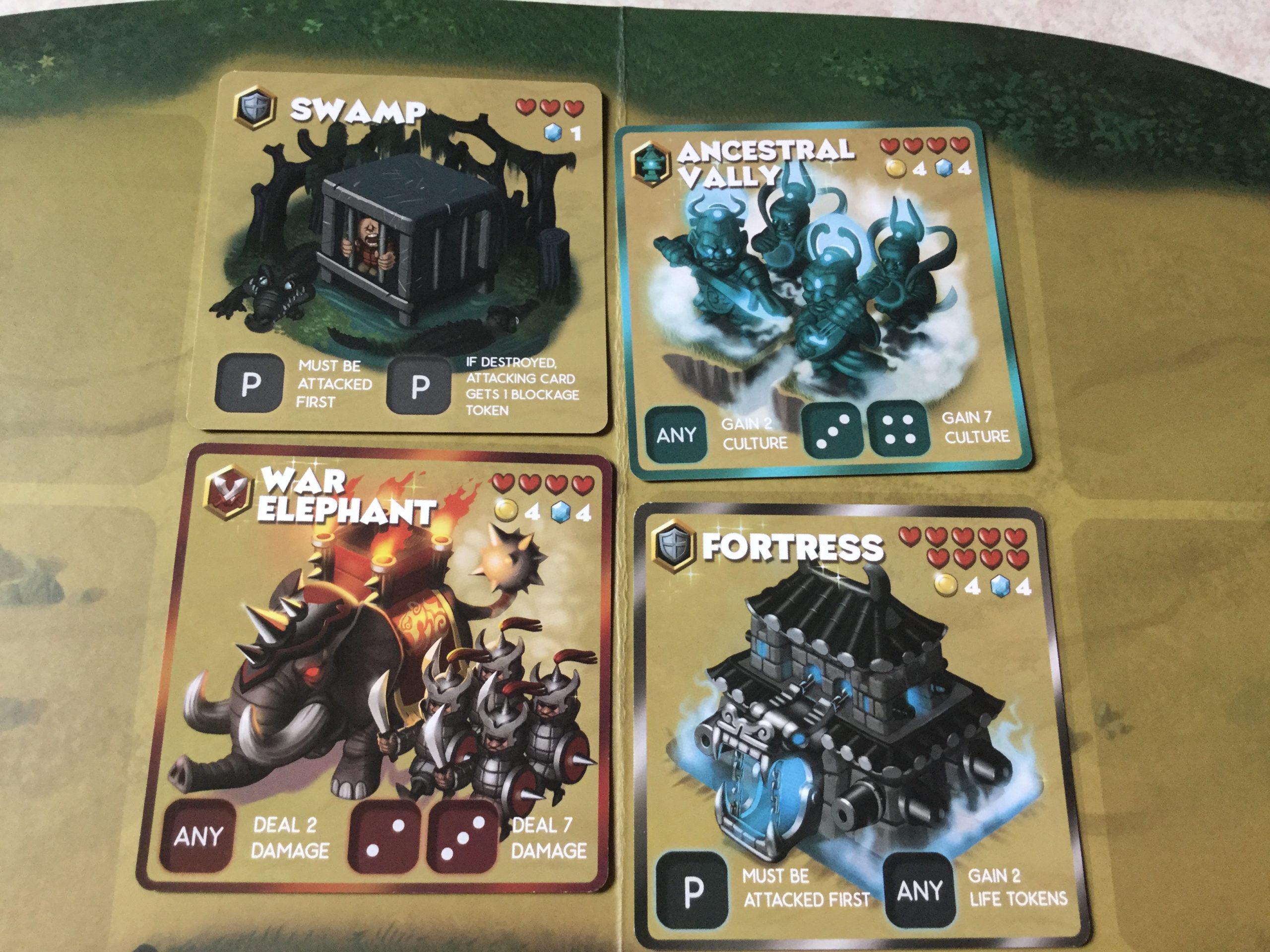 Soit vous l’emporterez en détruisant le palace de votre adversaire (12 points de vie), soit en augmentant votre culture à 18 points. Au cours de nos parties, la culture l’emporta à chaque fois. Après en avoir discuté avec l’auteur il nous a confirmé qu’un léger déséquilibre existait, et qu’il travaillait dessus.