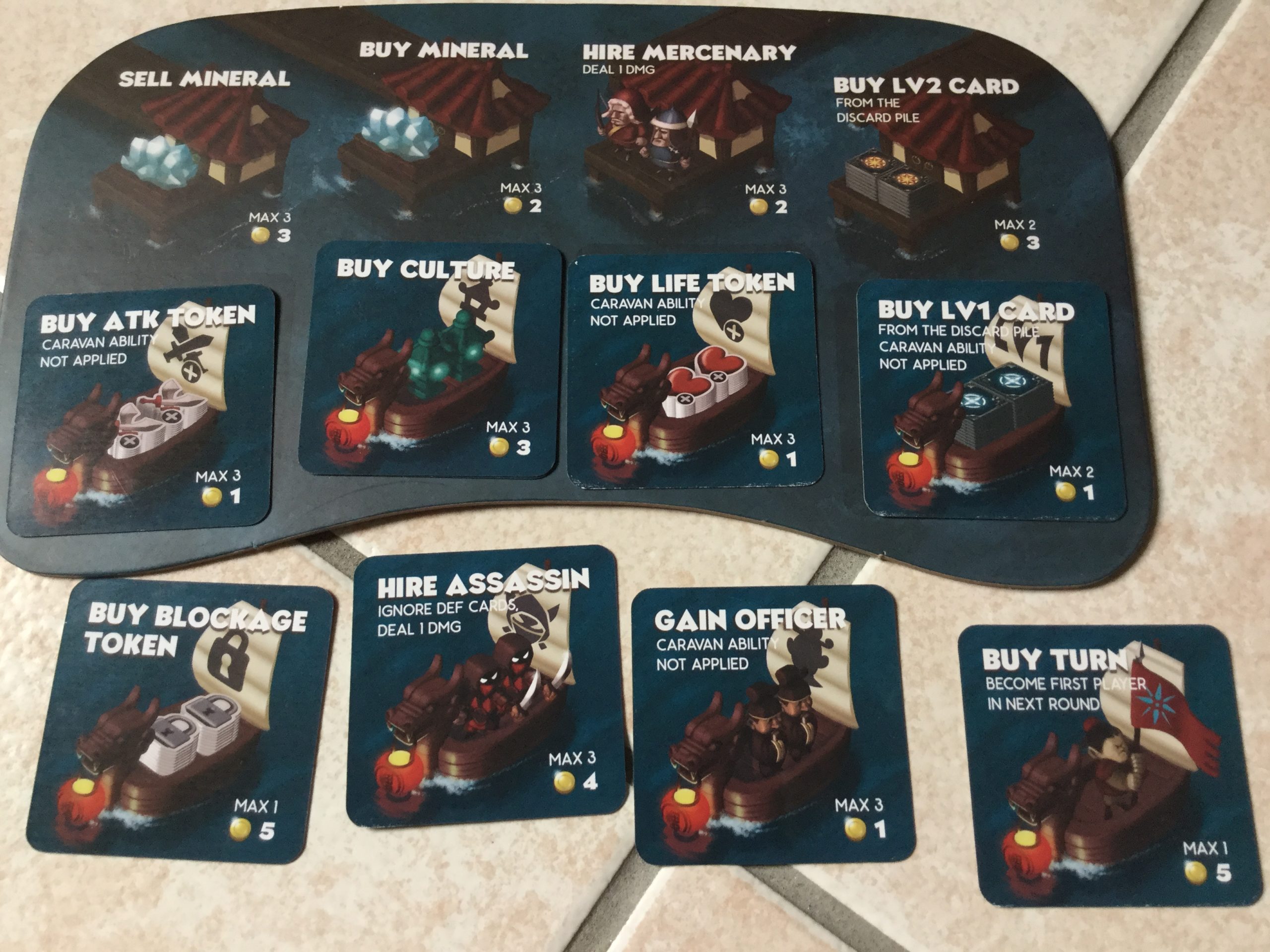 • Phase d’achat. Le joueur va pouvoir acheter des cartes niveau 1 pour 1 or par carte, 1 carte niveau 2 en défaussant 3 cartes niveau 1, un dé supplémentaire à utiliser lors de la prochaine phase, ou un officier qui lui permettra de modifier le résultat d’un dé lors de la phase d’action.