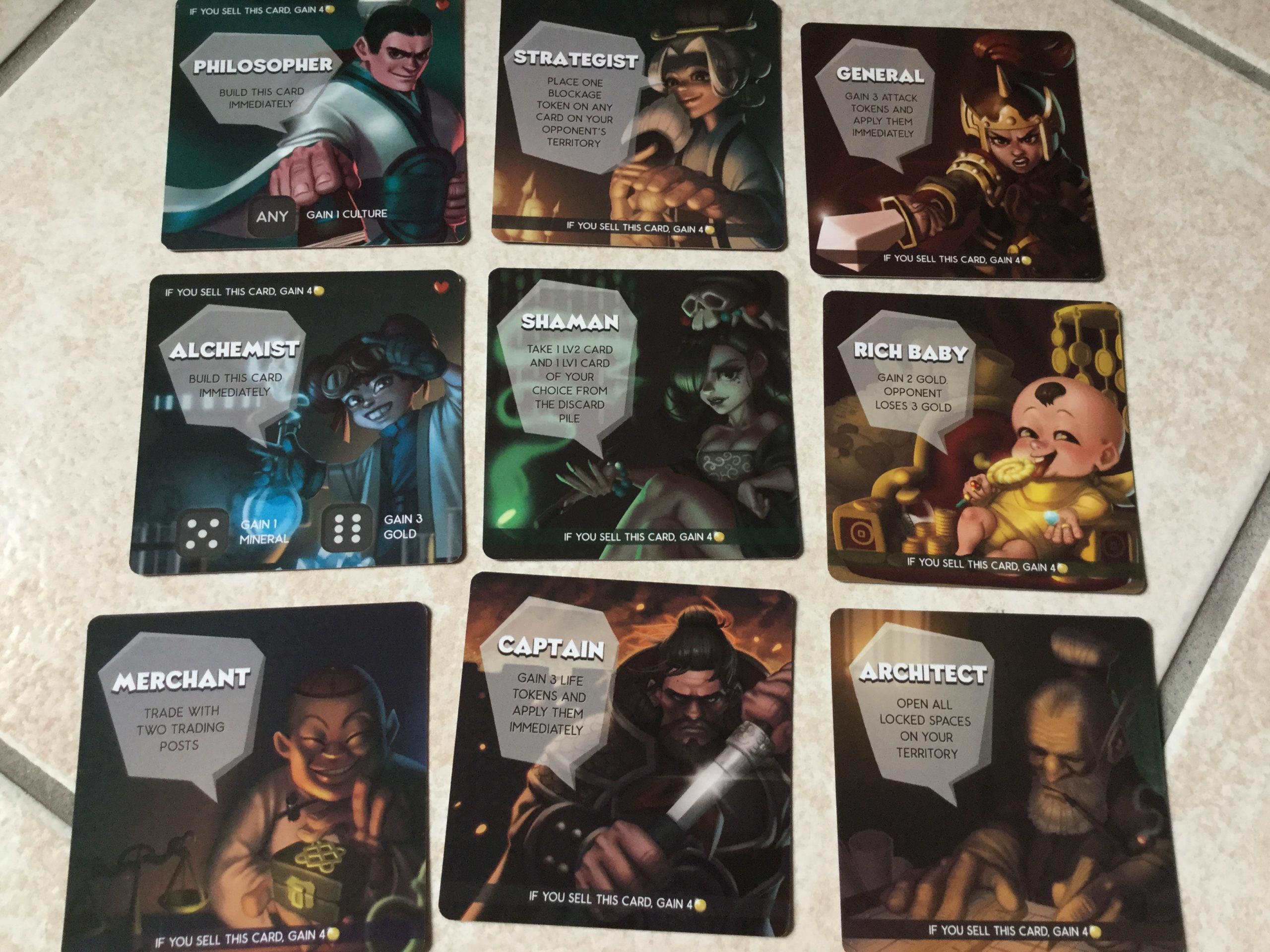 Après quelques parties, on peut piocher au hasard une carte personnage, et la garder secret jusqu’à son utilisation. Certaines ont un effet immédiat, d’autres doivent être construites sur un emplacement bâtiment de votre royaume.