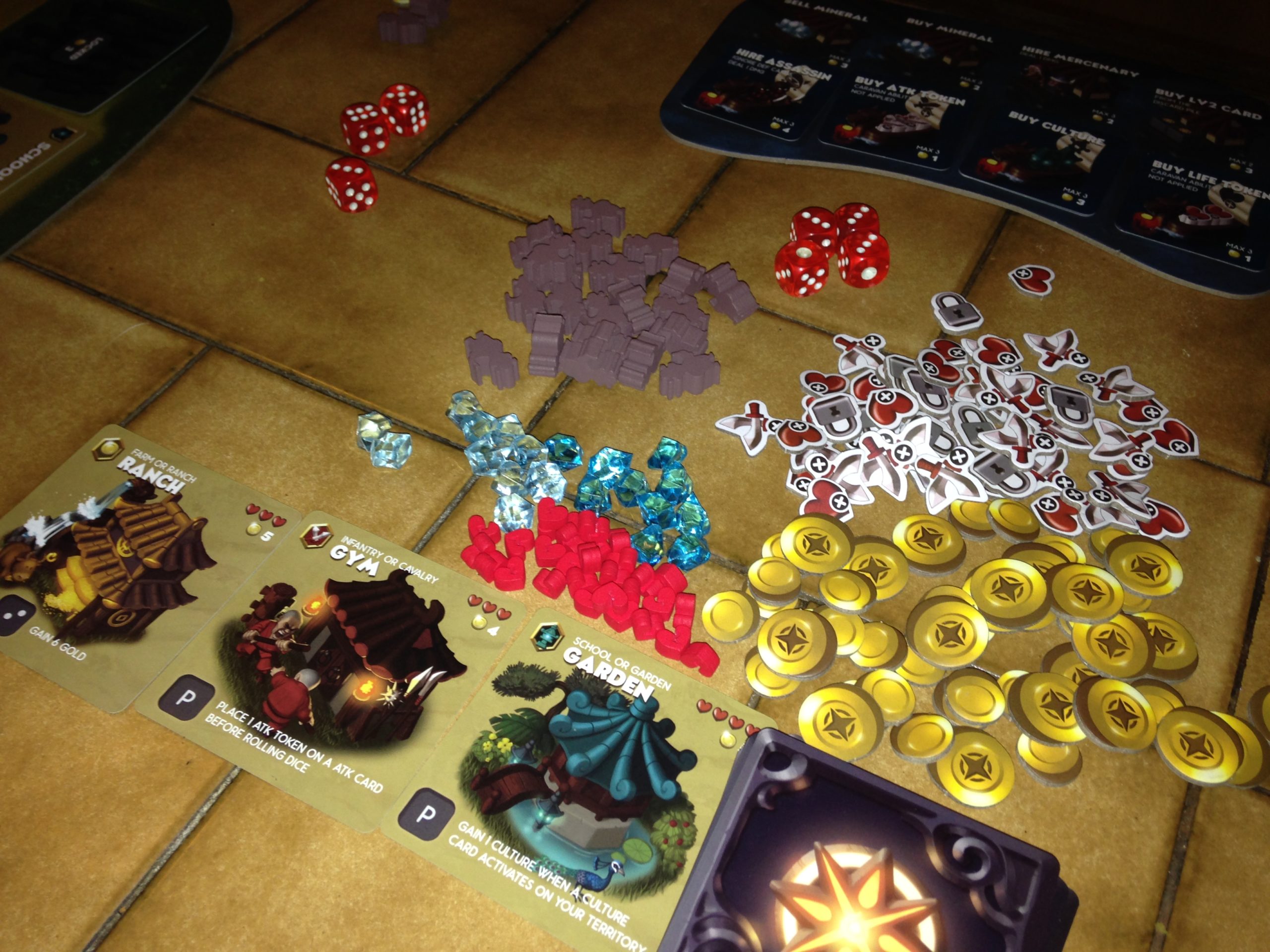 Chaque joueur peut aussi accéder au marché en construisant le bâtiment sur son plateau personnel. Quand on l’active, on peut aller échanger des ressources sur le mini plateau dédié. A chaque partie, les éléments qui le constituent peuvent aussi être modifiés, pour ne pas retrouver les mêmes possibilités d’échange à chaque partie. Par exemple, on peut acheter du minerai, ou en vendre, acheter des mercenaires (pour effectuer un dommage à un bâtiment adverse), acheter une carte niveau 2, acheter un jeton Vie, un jeton Attaque, ou même acheter le jeton premier joueur pour le prochain tour!