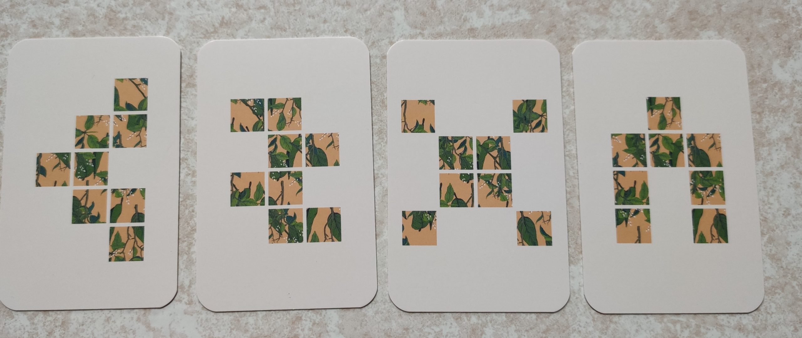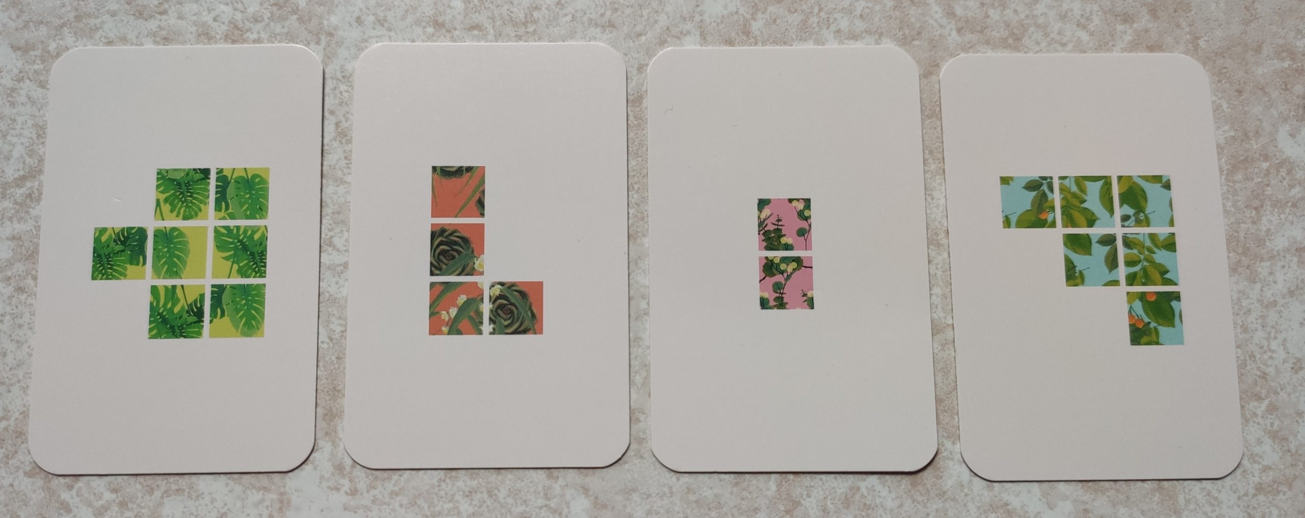 Ensuite, à chaque tour on va dévoiler 2 cartes Forme. Chaque joueur choisit librement l’une des 2 formes, qu’il colorie dans sa grille.