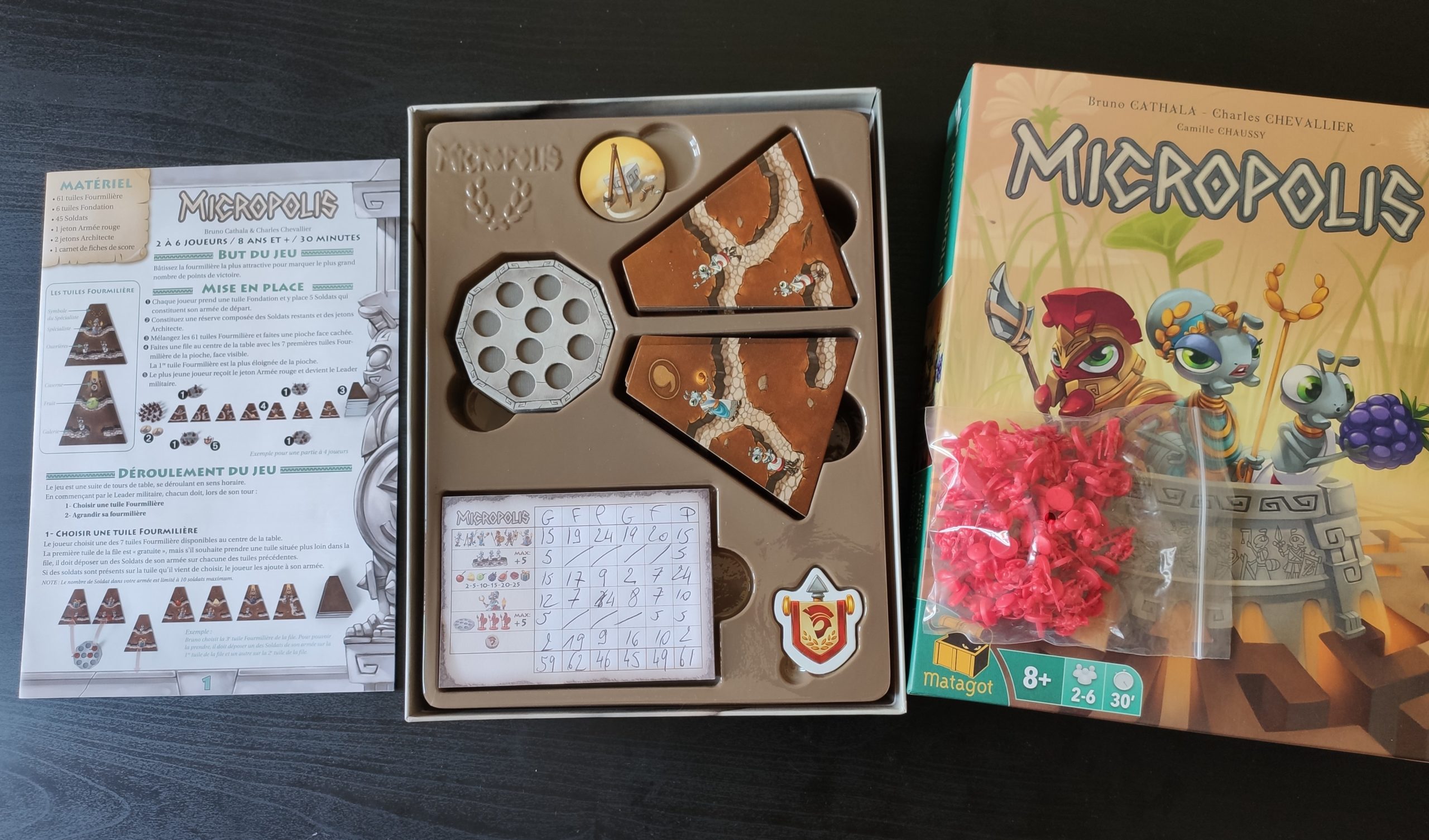 Le matériel est de très bonne qualité, on apprécie les petites figurines de fourmis guerrières, les illustrations de Camille Chaussy font mouche comme toujours, et participent à l’immersion dans le thème. Un vrai beau boulot d’édition pour un jeu plaisant et qui attire l’œil.