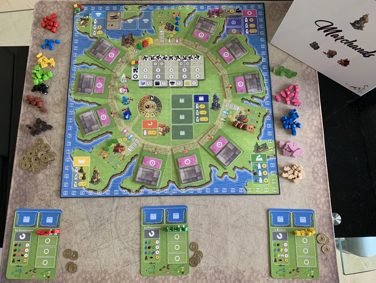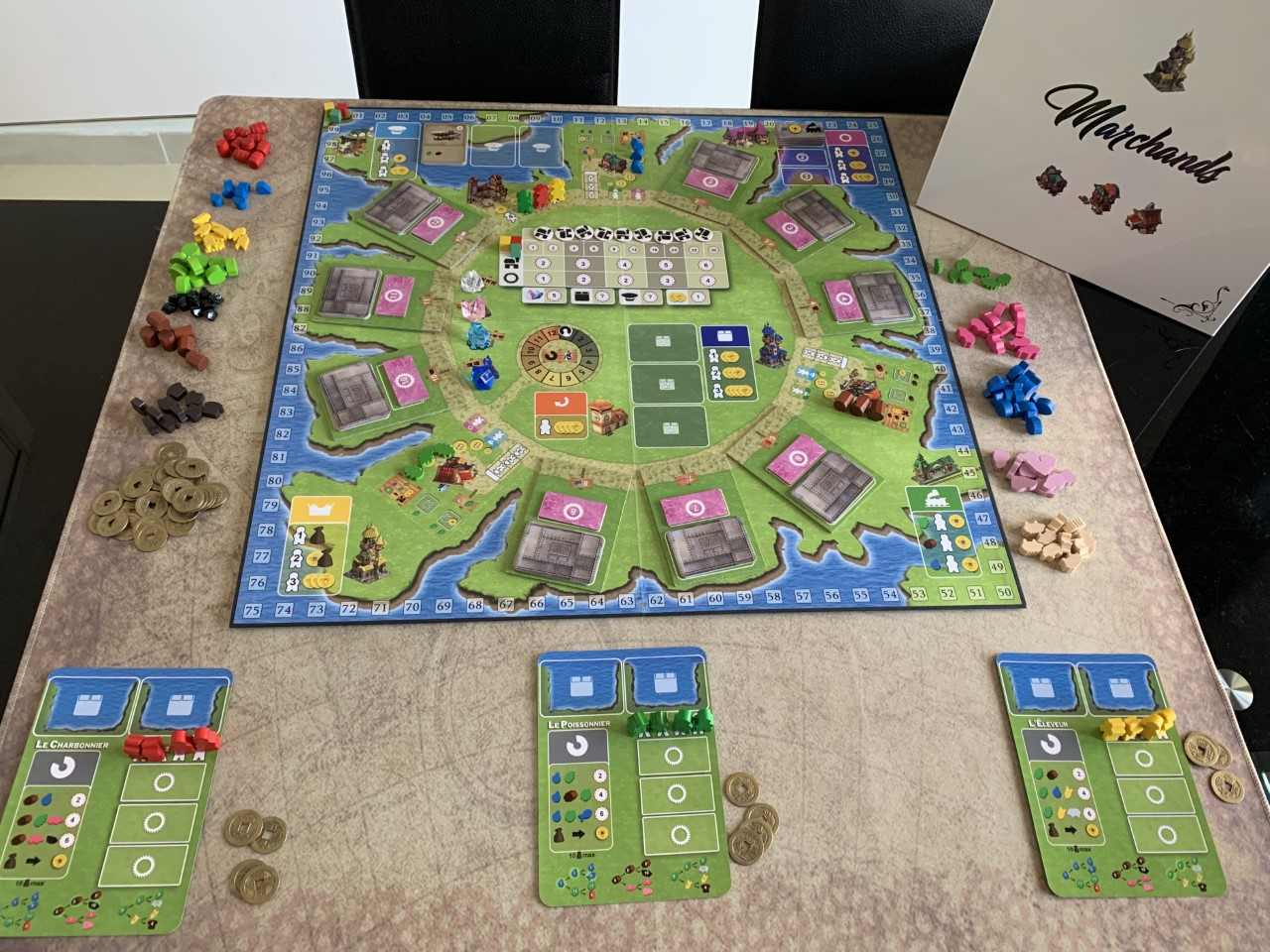 Mais attention! Là où Tokaïdo est une invitation au zen et aux petites actions rapprochées, marchands est un sprint! Avancer le moins possible pour avoir le plus d’actions possibles n’est clairement pas la bonne stratégie! Mieux vaut aller aux actions critiques même si cela demande un demi-tour de plateau d’un coup!