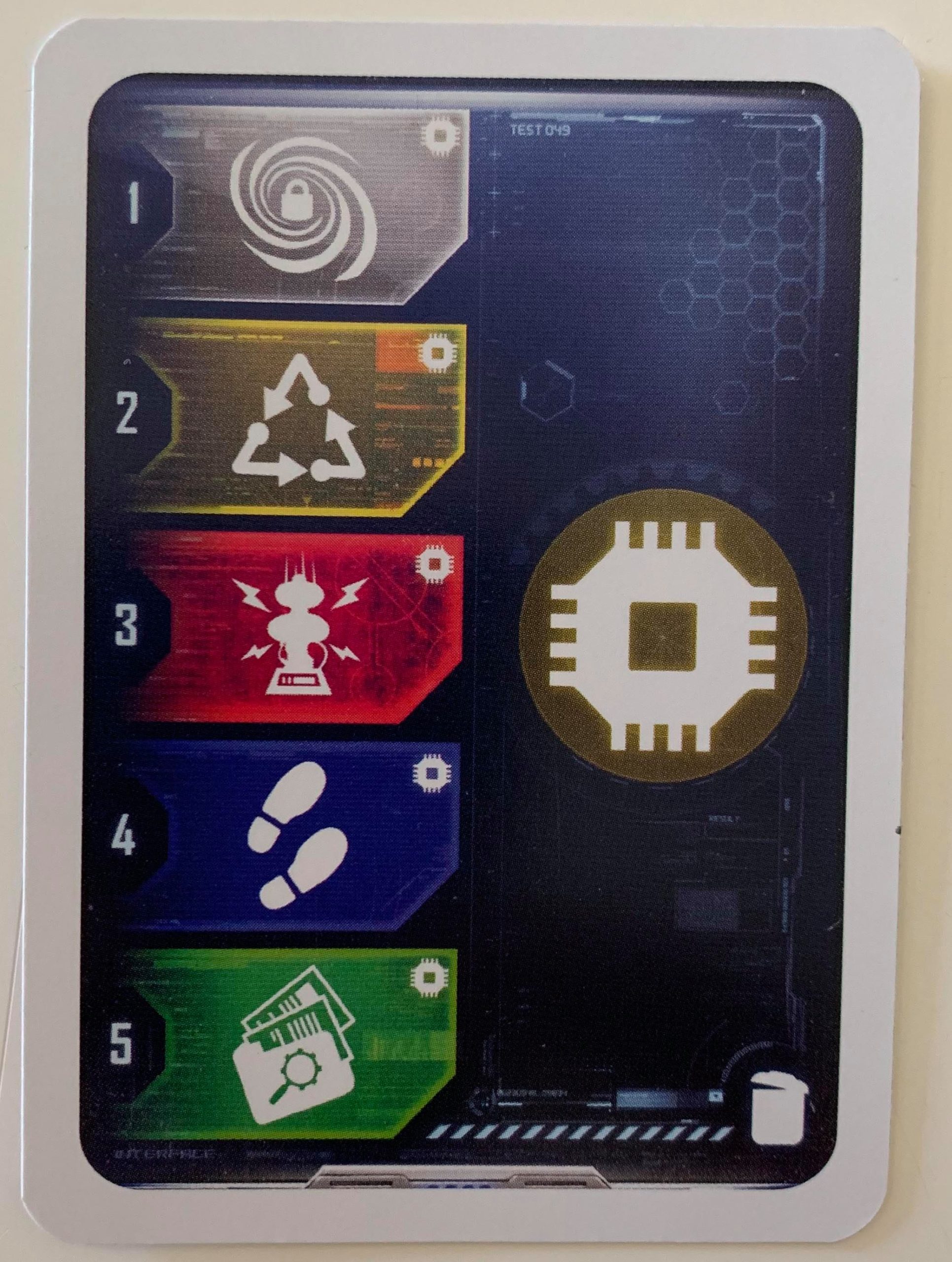 Les cartes action en proposent 5. La colonne de gauche propose une action différente pour chaque couleur de transformateur, ça peut paraître confus mais une fois l’iconographie comprise tout devient fluide.