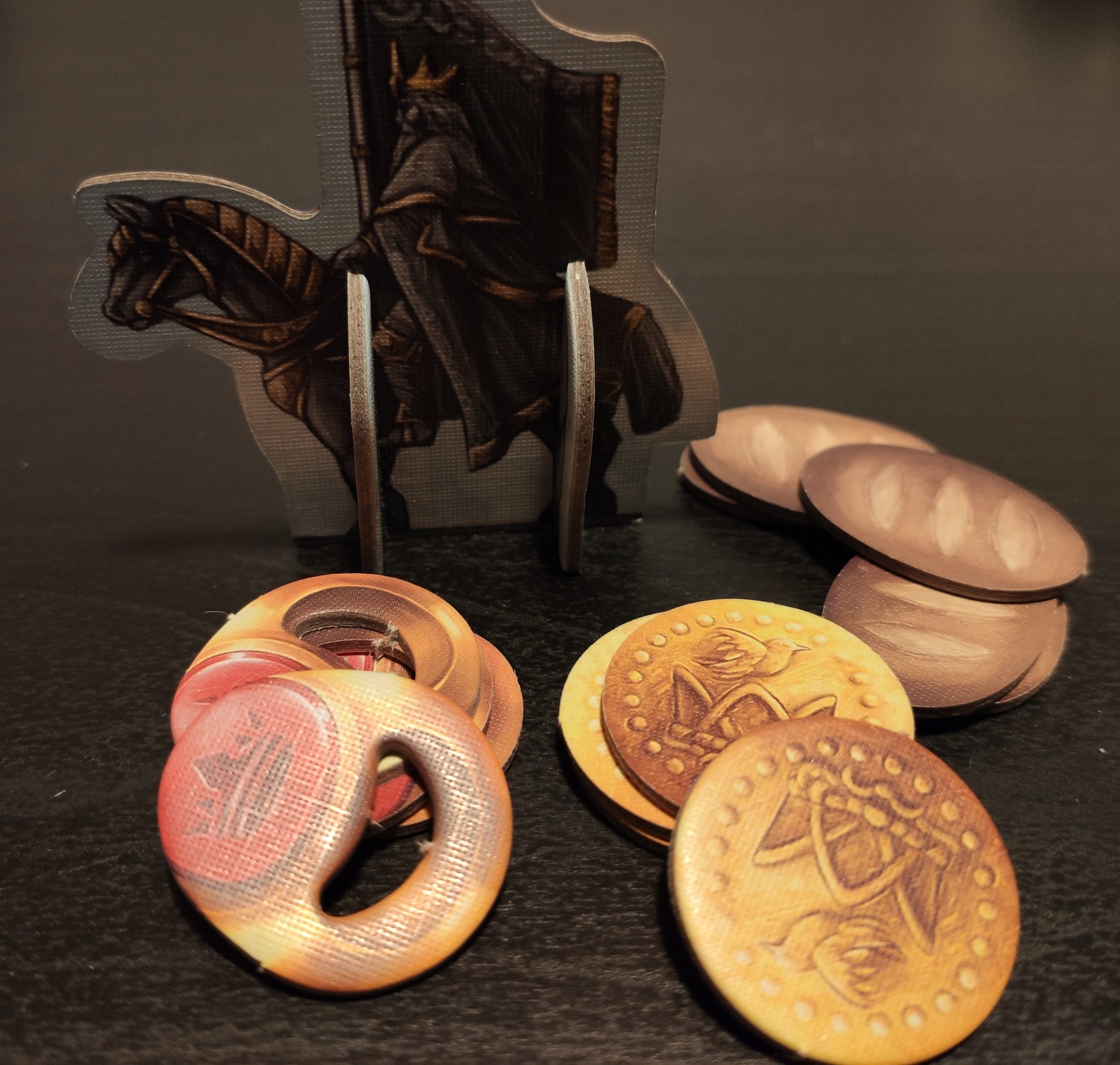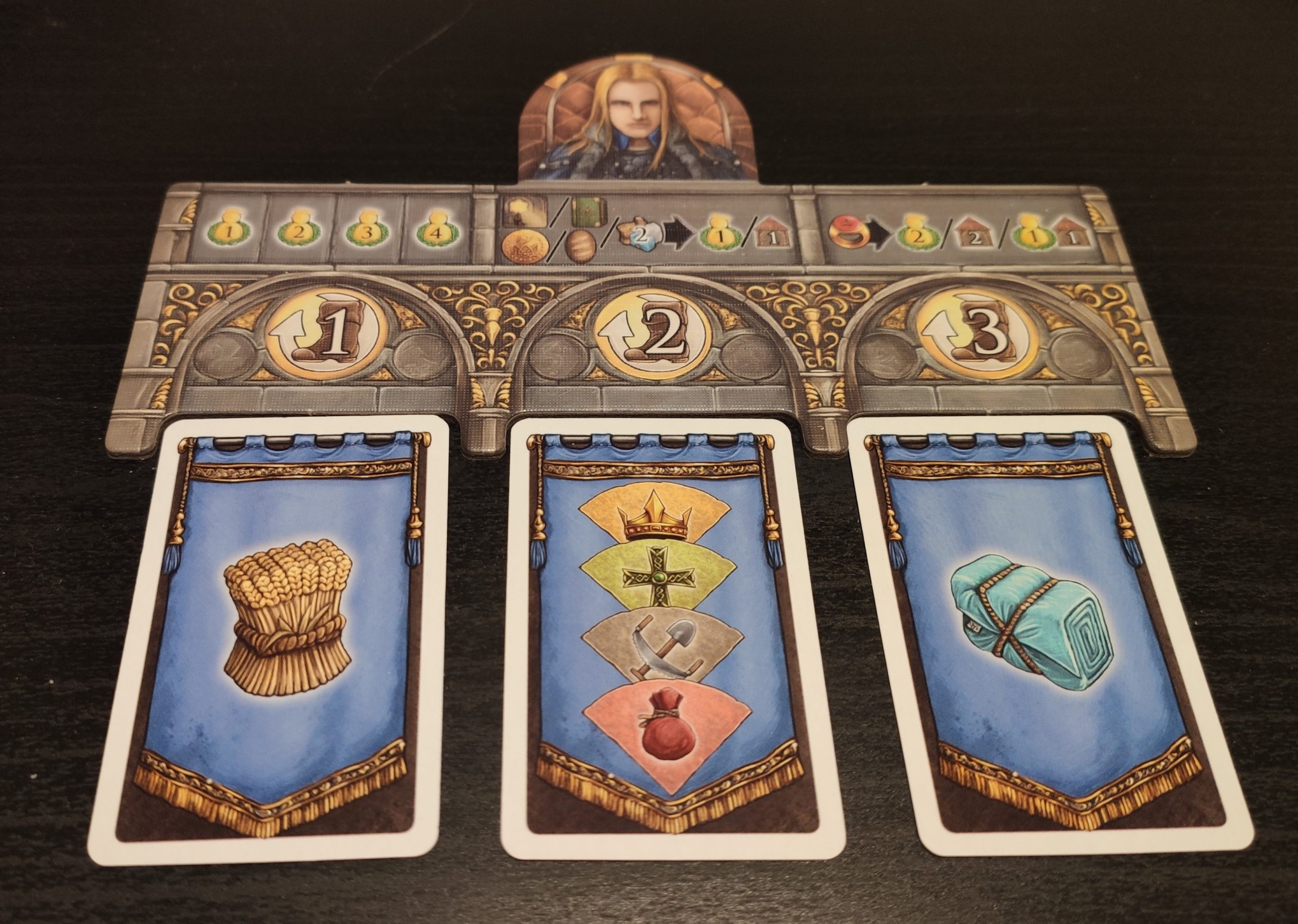 Une fois qu’un joueur réalise une action en ville (par exemple au château, faire un cadeau au roi pour récupérer 1 chevalière), un marqueur qui définit le coût de l’action va être pivoté, et augmenter ce coût pour les prochaines fois où cette action sera effectuée. Dans l’exemple du château, il faut échanger des ressources pour récupérer 1 chevalière. En début de partie, c’est 1 ressource pour 1 chevalière. Dès qu’un joueur effectue cette action, on pivote le marqueur, et pour le prochain joueur qui veut faire cette action, le coût est augmenté. 2 ressources pour 1 chevalière par exemple.