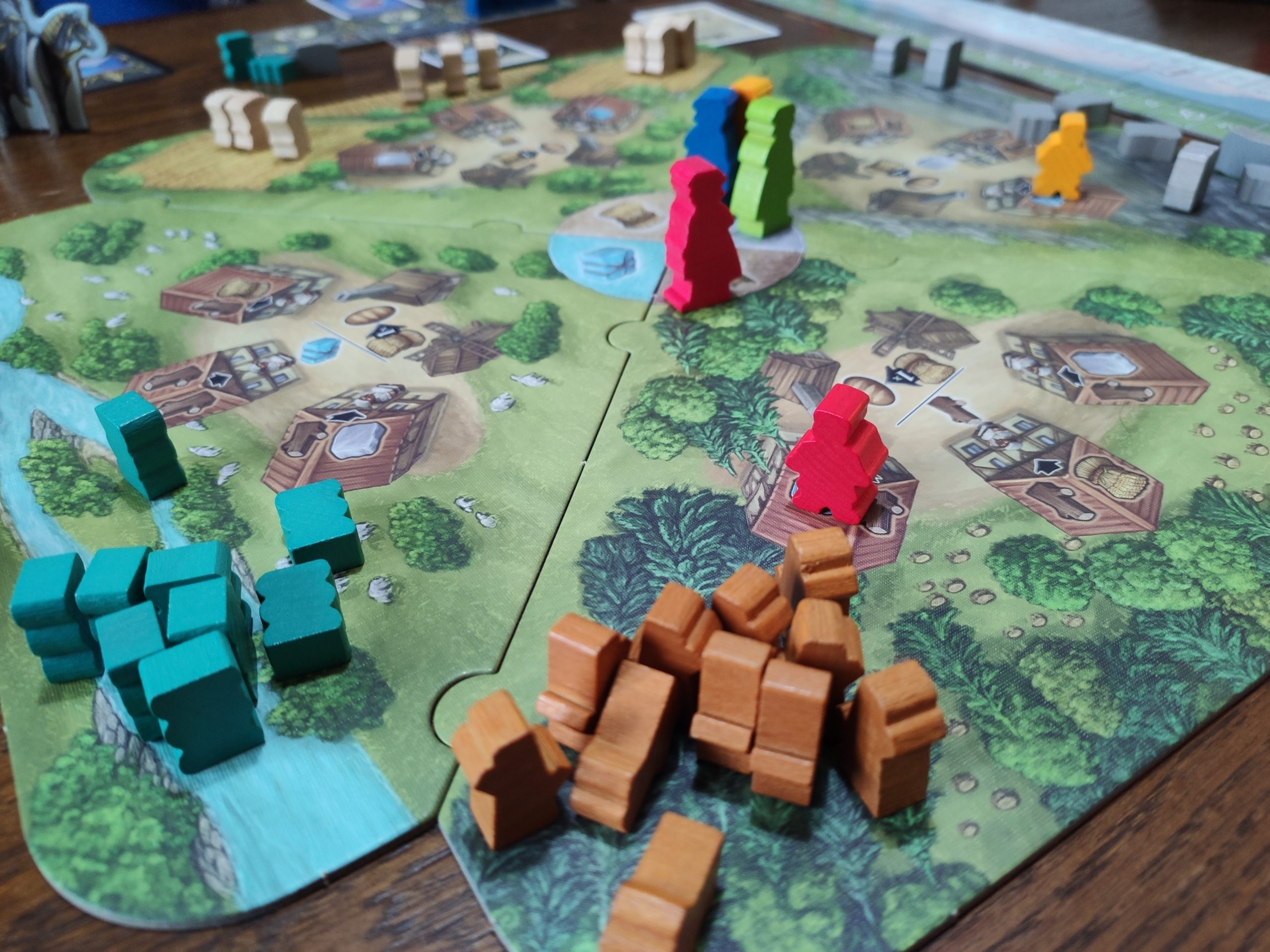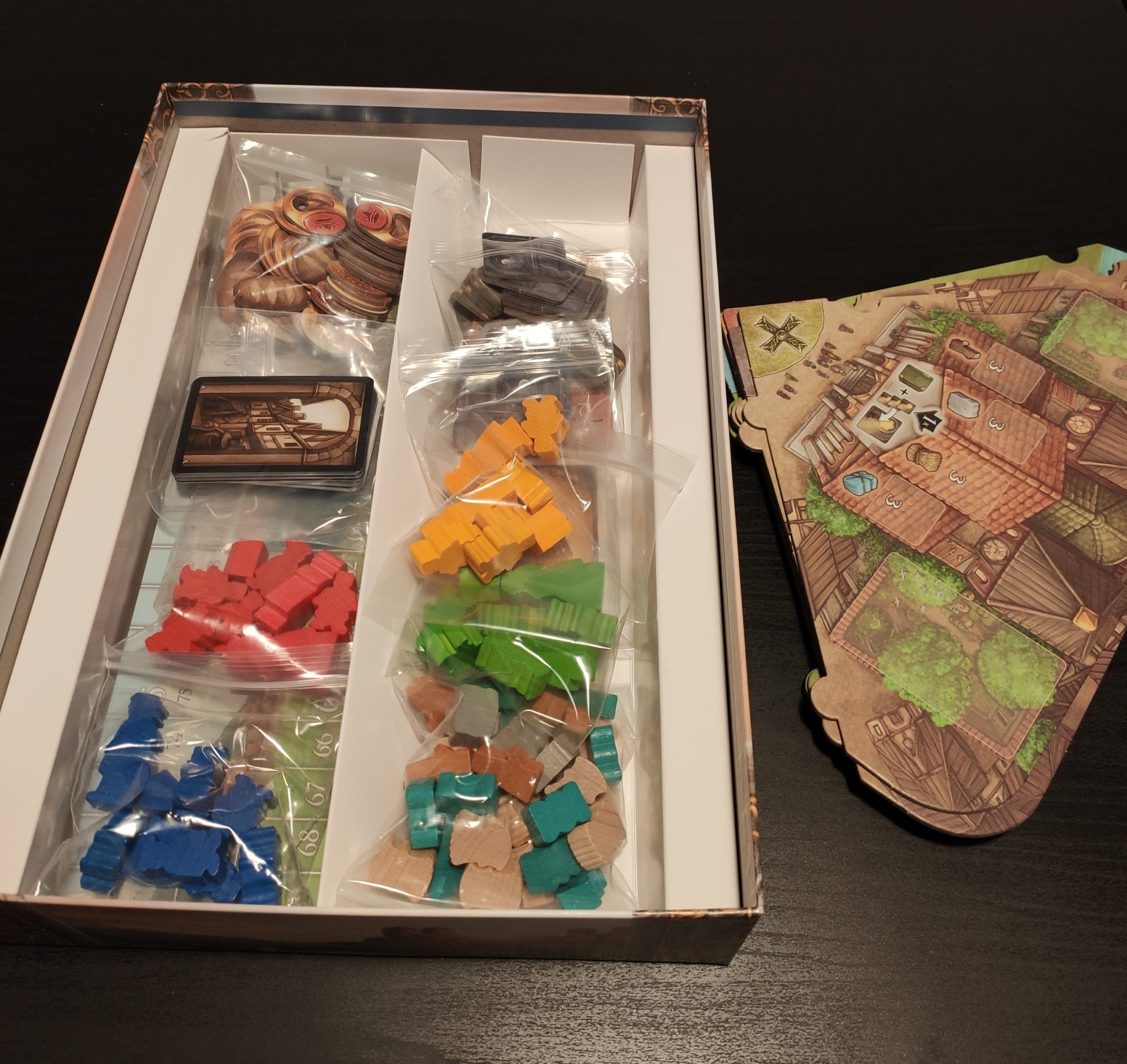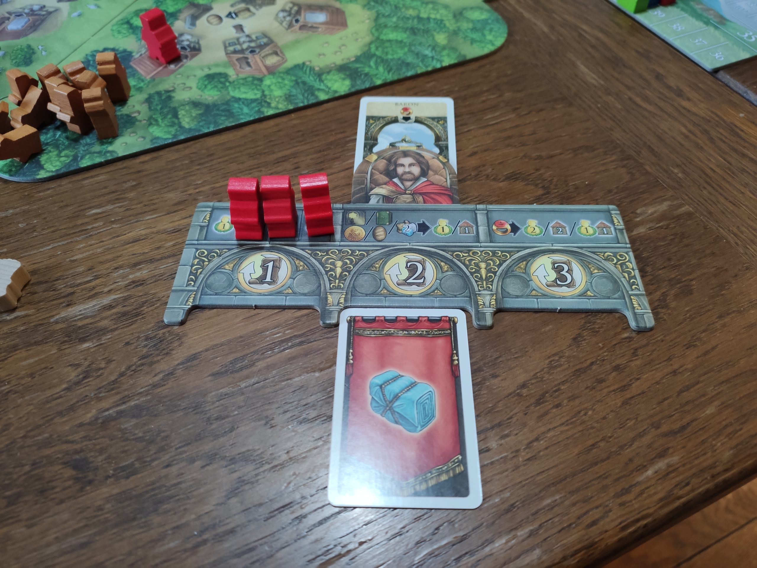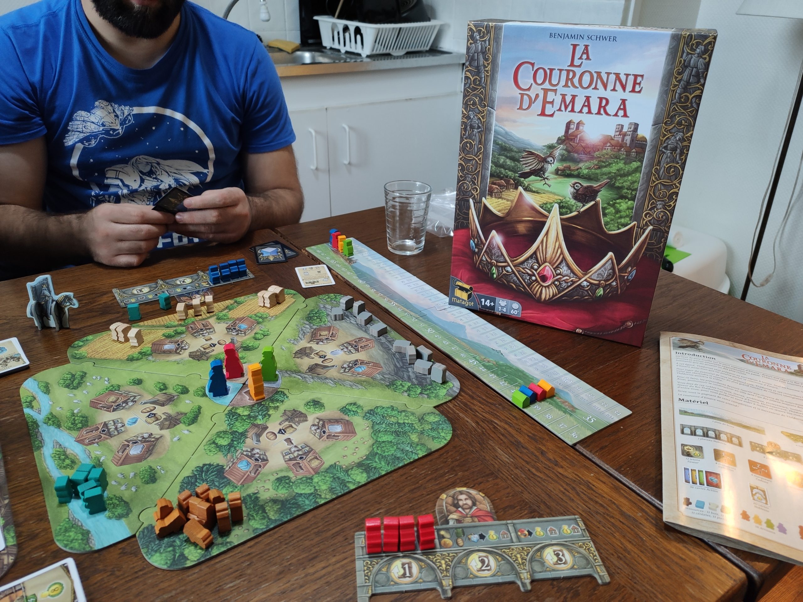 Bon après on est dans un jeu à l’allemande… Donc le thème sera pas forcément omniprésent, mais le matériel est de très belle facture et nous plonge (un peu) dans ce joli royaume d’Emara. Cartes, cubes, ressources, placement d’ouvriers.