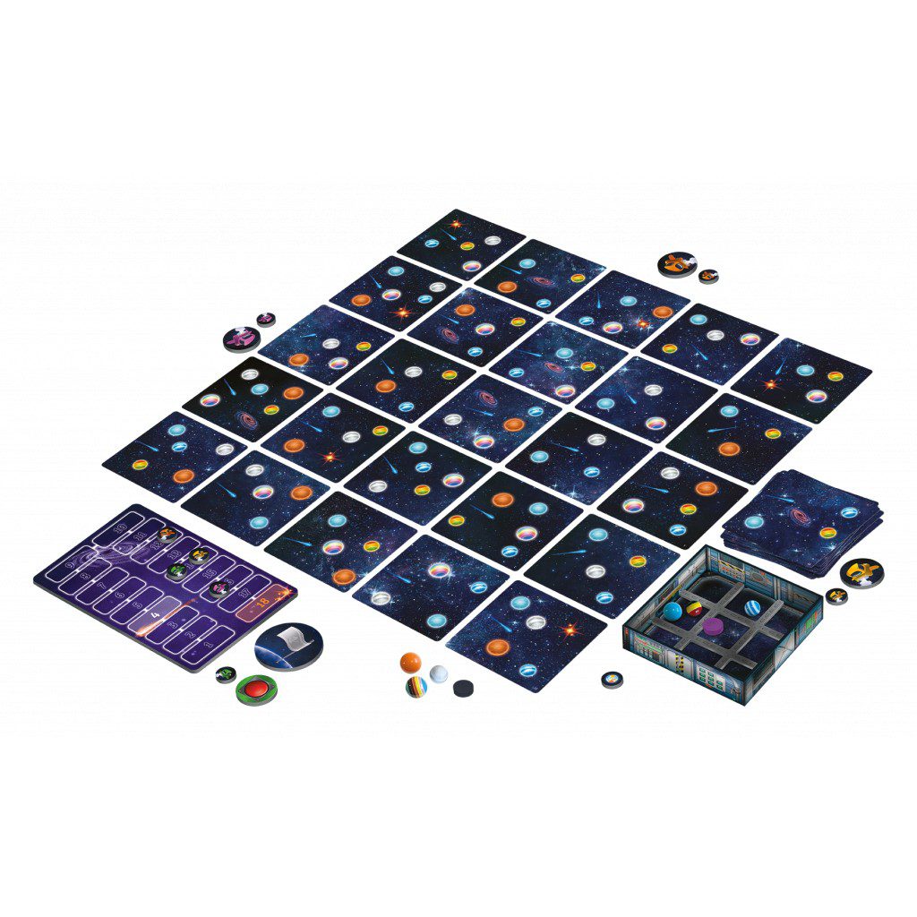 Après avoir distribué 3 jetons de couleur à chaque joueur, après avoir disposé un carré de 5×5 cartes (pour un total de 25 si vous suivez !) et après avoir désigné un joueur qui débute la partie et lui avoir distribué le jeton de capitaine, il vous faudra lire les coordonnées de l’ordinateur de bord pour savoir où vous rendre.