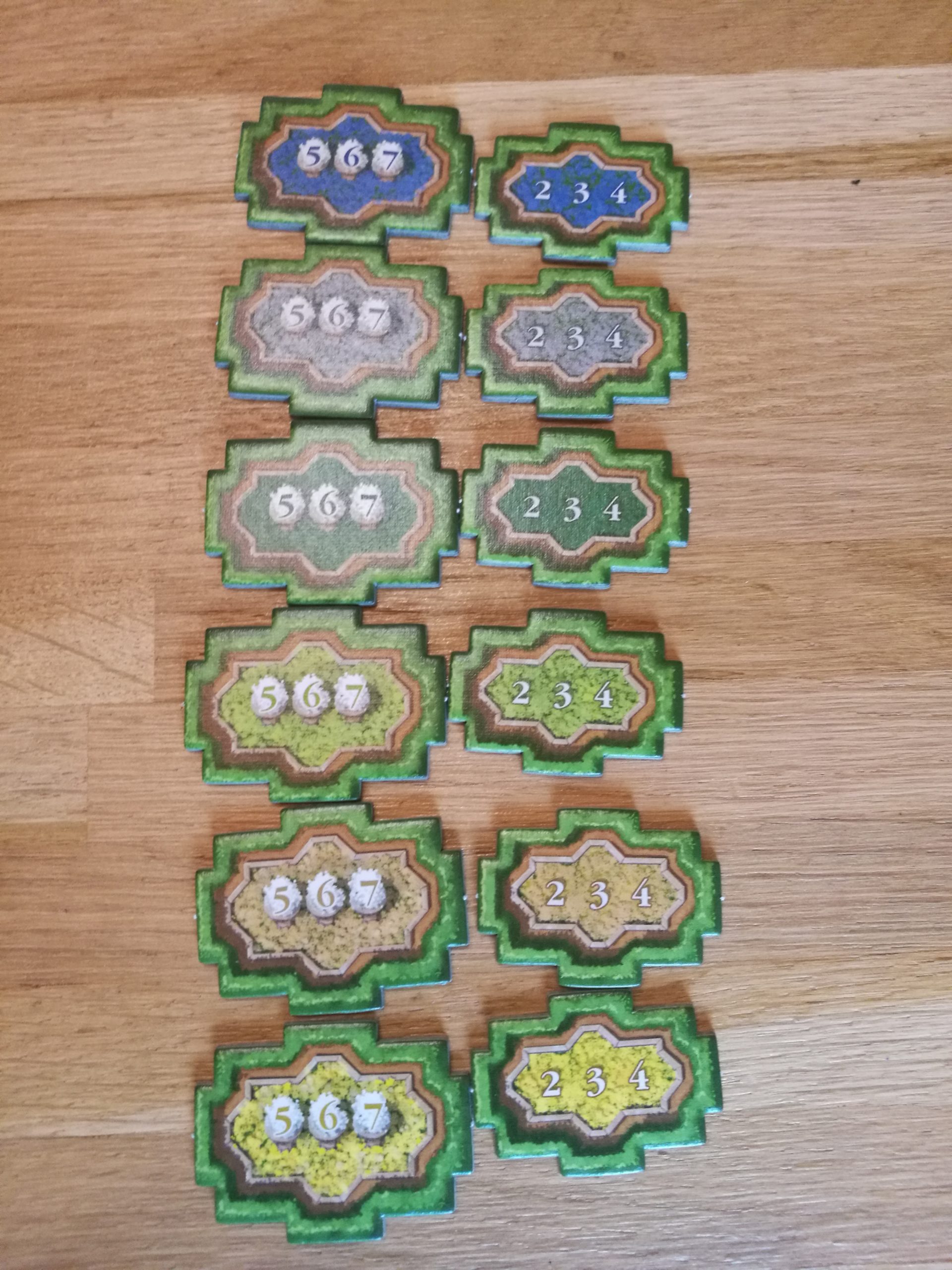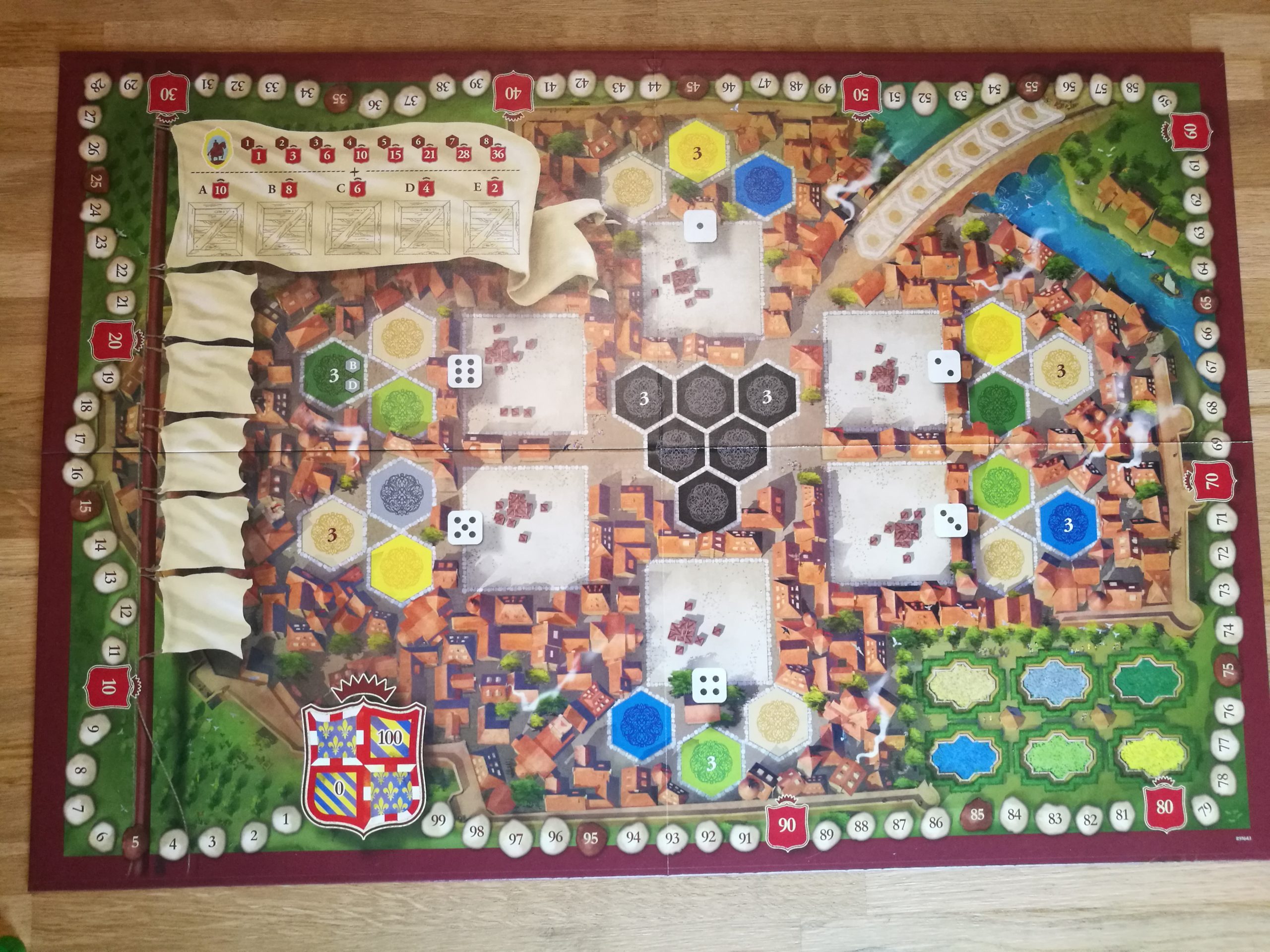 10 points pour la phase A du jeu, 8 points lors de la phase B (le tout en diminuant à chaque nouvelle phase) et ensuite on rajoute un score en fonction du nombre de tuiles que comprend ce district : 1 tuile seule = 1 point, 2 tuiles = 3 points etc etc…