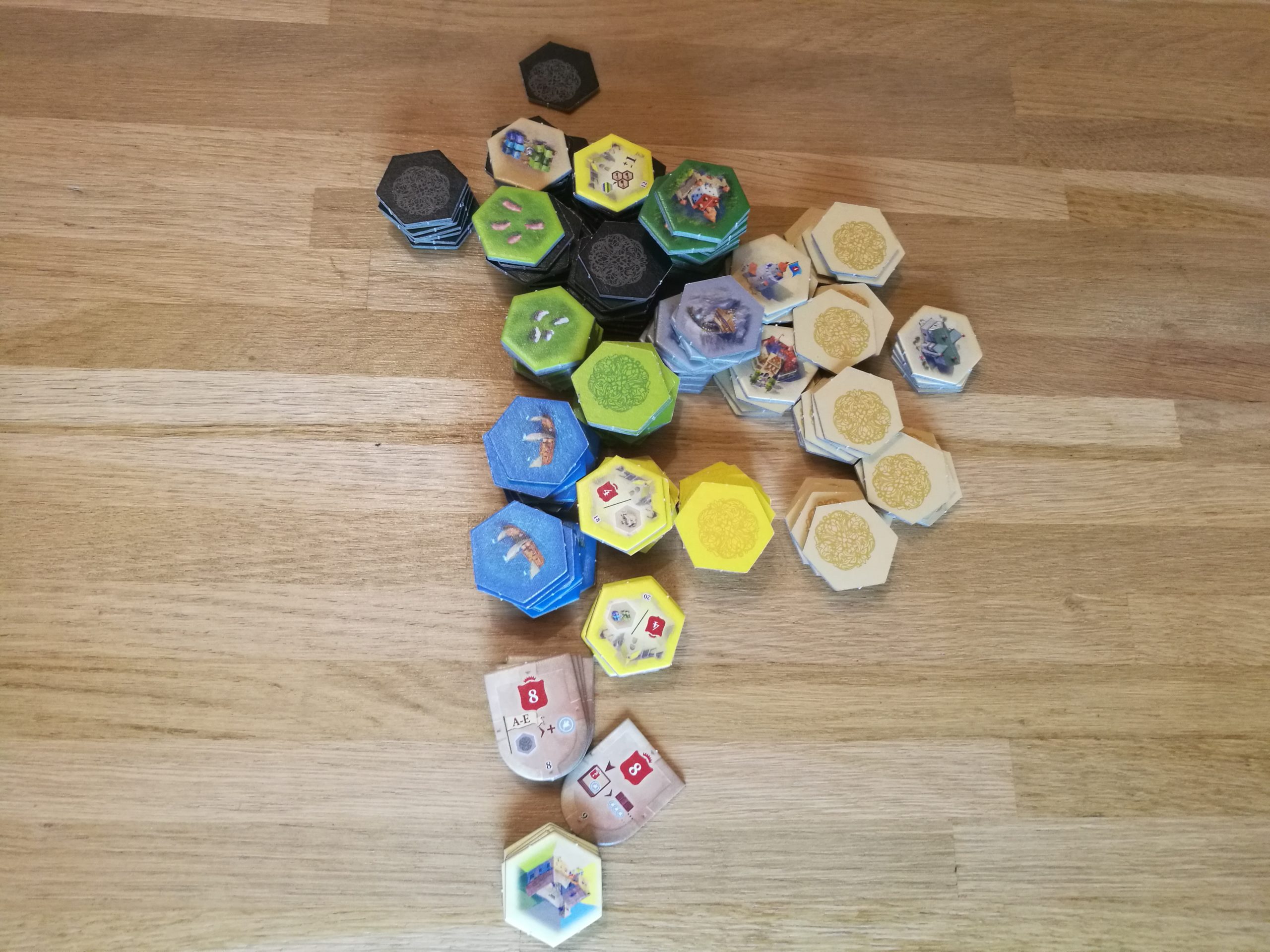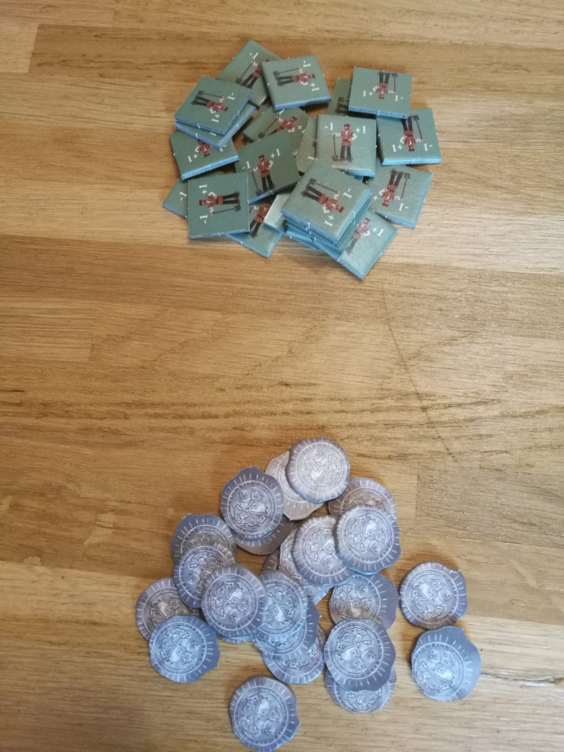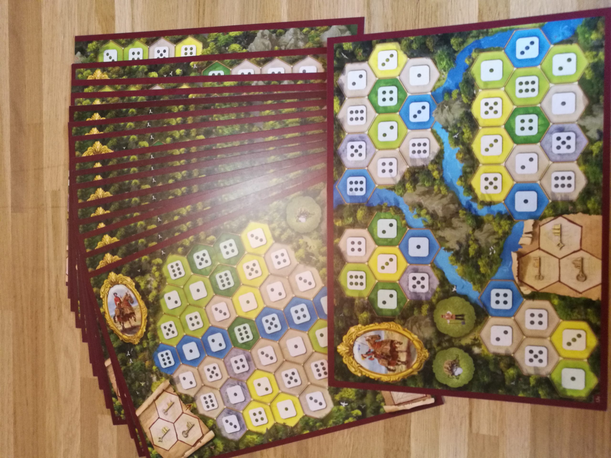 Le jeu est de super bonne qualité ! Les tokens sont épais, les dés sont très agréables, les aides de jeu sont aussi épaisses que le plateau, et les routes commerciales aussi !