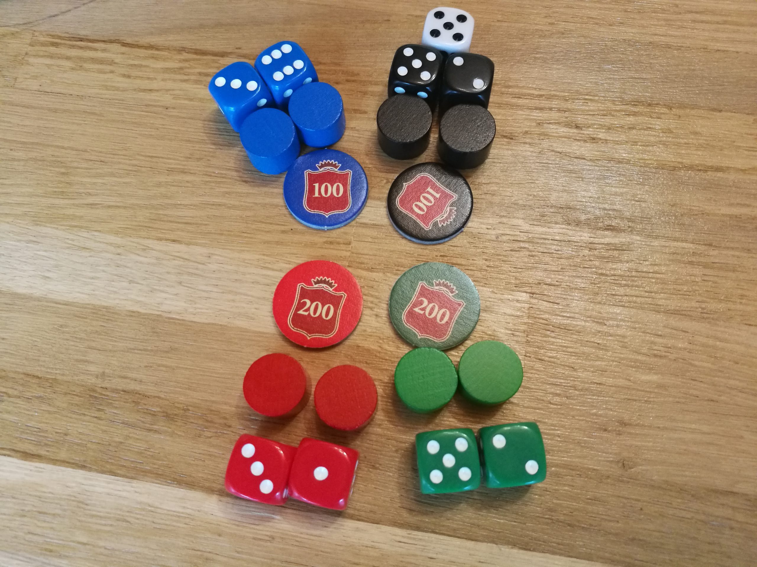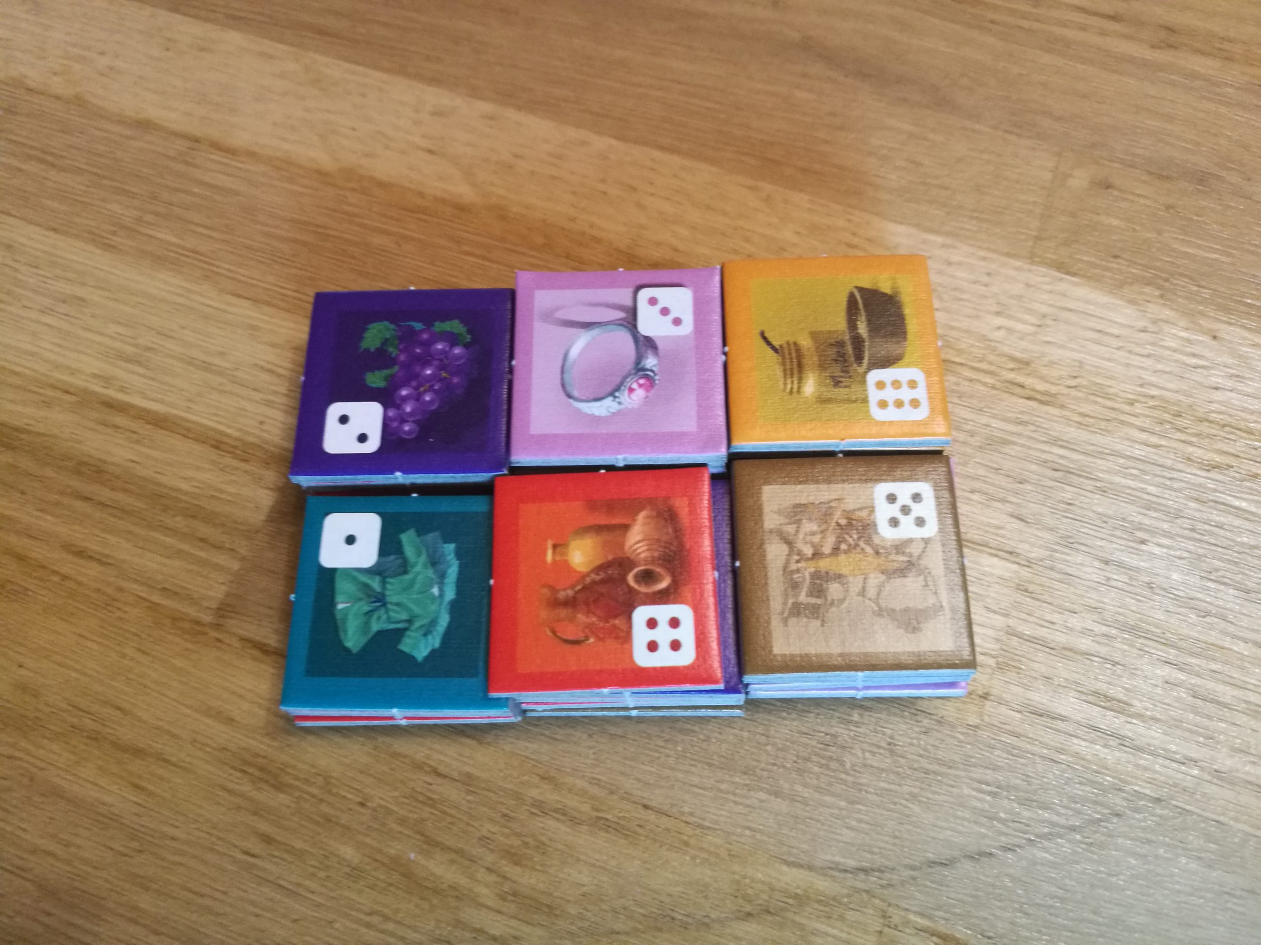 Chaque joueur reçoit deux dés de sa couleur, 3 tuiles de marchandises aléatoires et un nombre d’ouvriers compris entre 1 et 4 selon qu’on est le premier ou le 4ème joueur à commencer la partie.
