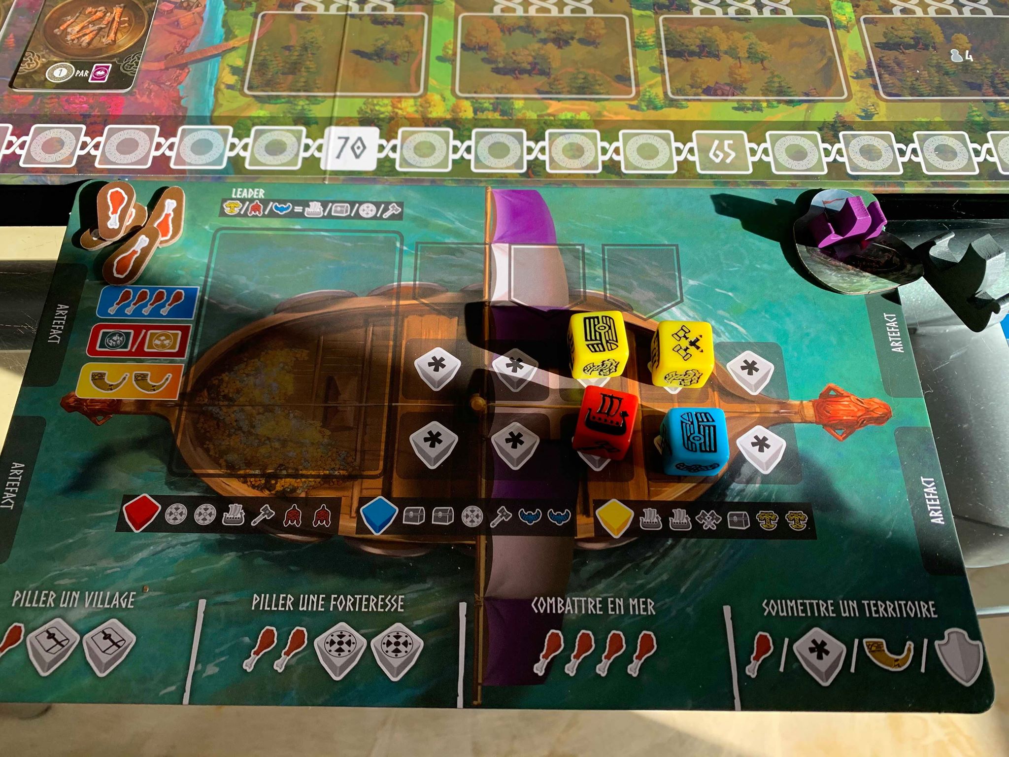 La troisième action est l’attaque d’un village (enfin de la bagarre !). Vous allez récupérer une paire de tuiles parmi celles disposées. Les tuiles sont associées par paires, ce qui limite vos choix et assure un certain équilibre (soumis au hasard de la sortie des tuiles). Elles vous offriront des bonus permanents qui remplacent un dé à chaque manche, de la nourriture et des jetons de majorité si vous choisissez de pousser le combat, la contrepartie étant un jeton de terreur qui vous fera perdre de plus en plus de points plus vous les accumulerez.