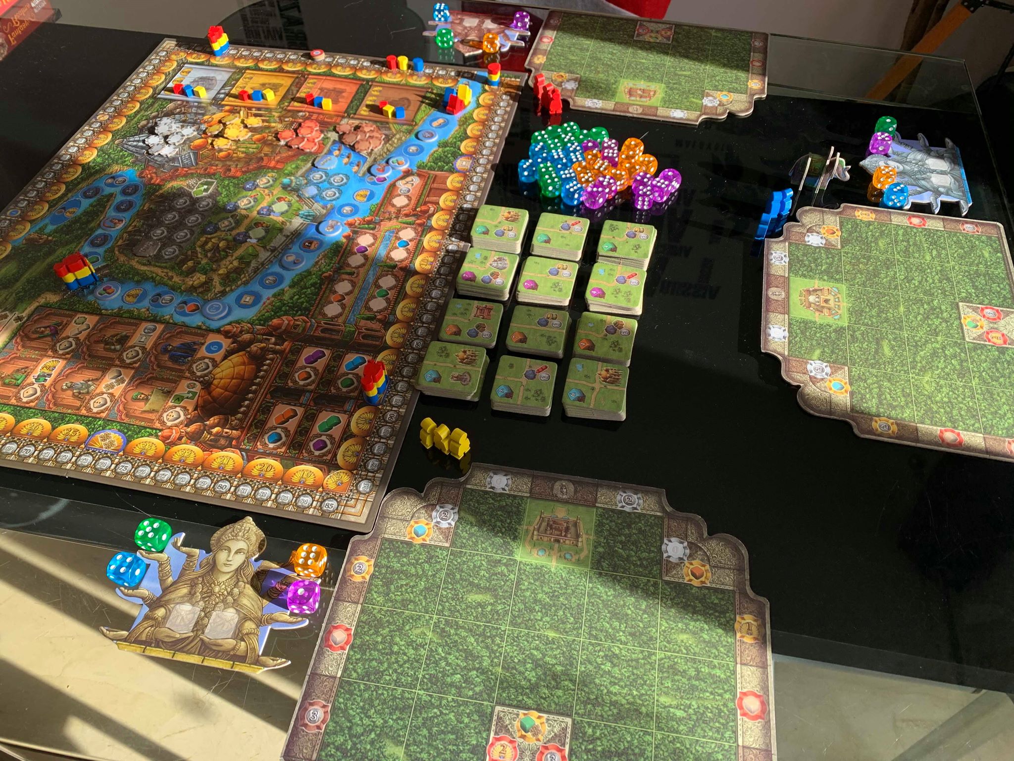 Chaque joueur dispose d’un plateau personnel représentant sa province sur lequel il viendra poser des tuiles et un plateau Kali pour stocker ses dés.