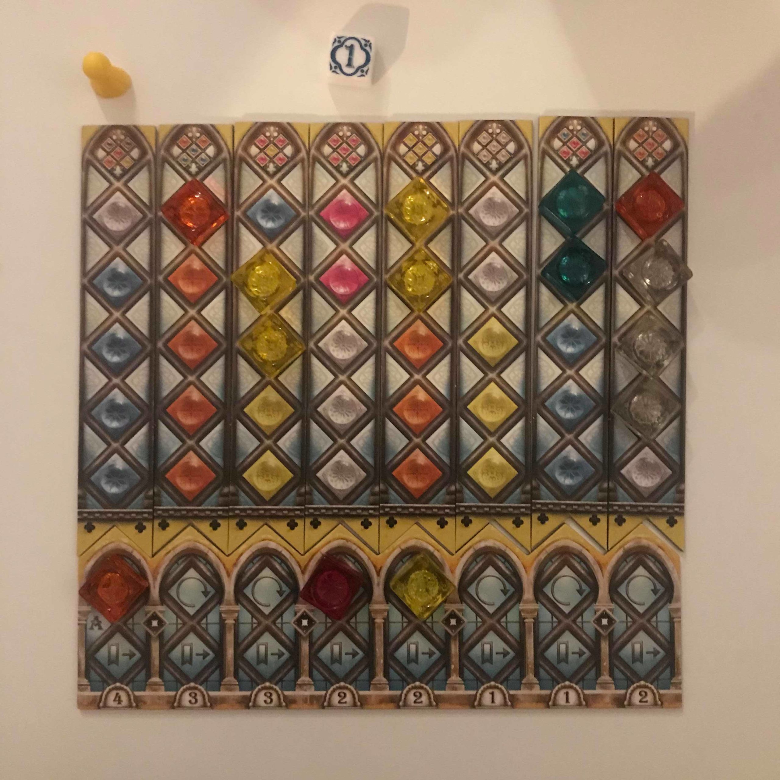 - Enfin, vous pouvez éventuellement valider un motif complété, c’est-à-dire que toutes les cases de la planche motif sont occupées. Dans ce cas, regardez la couleur de la pièce Vitrail la plus haute sur l’indicateur de manche. Ce sont des bonus de points – et ils sont non négligeables. Ils vous permettent de marquer un point par vitrail correspondant à la couleur de cette dite pièce. A cela, vous ajoutez la valeur de la fenêtre correspondante et les points de toutes les fenêtres, ayant au moins un vitrail, se trouvant à droite de celle-ci. C’est là que l’ordre dans lequel vous réalisez les motifs est primordial. En programmant au mieux vos manches, le nombre de points peut être très important. A savoir que la planche motif sera retournée sur son autre face si c’est la première fois qu’elle est réalisée, sinon elle sera retirée.