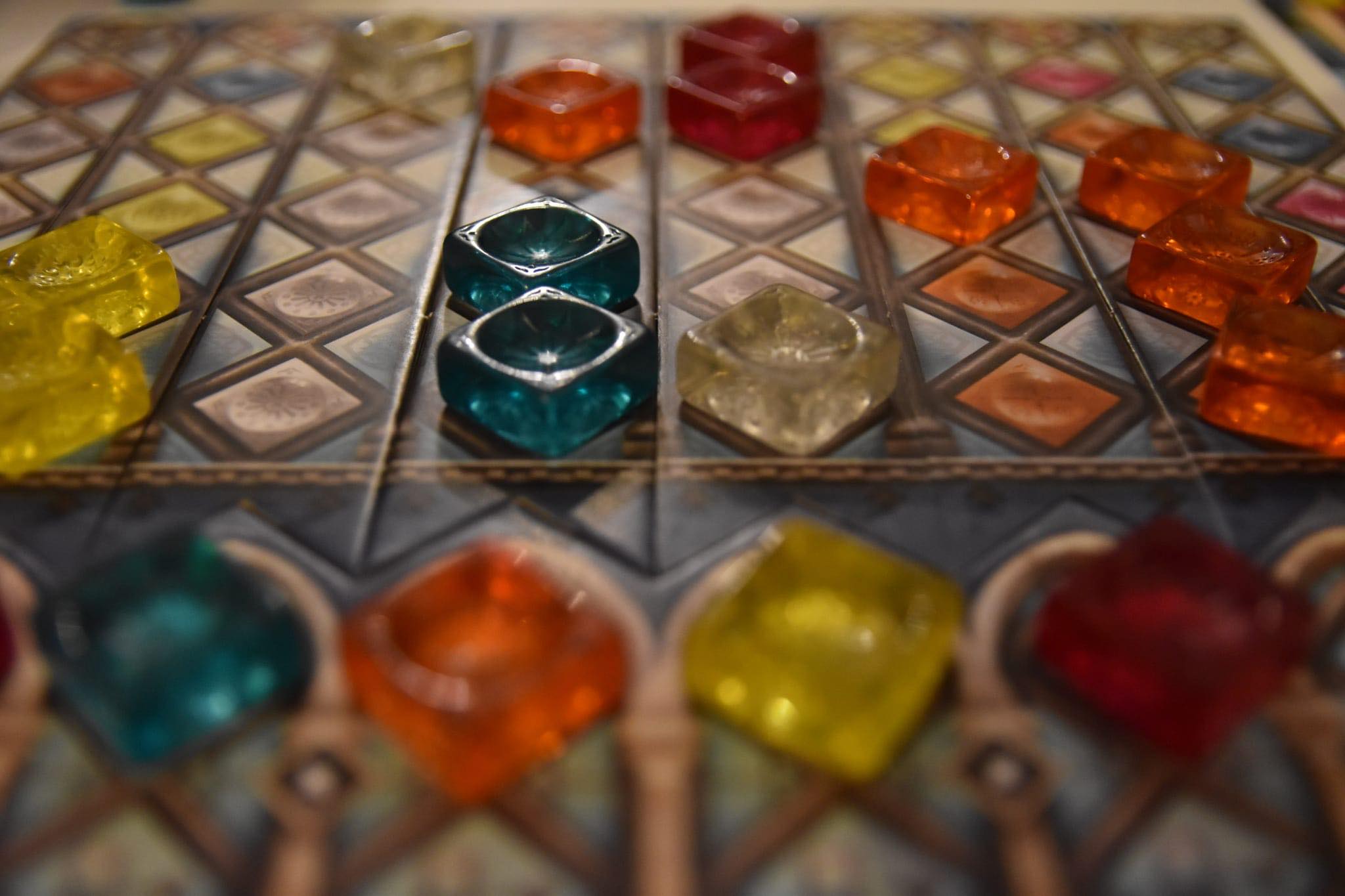 - Vous devrez alors, dans un premier temps, prendre toutes les pièces vitrail d’une même couleur, d’un cercle Fabrique ou du centre de la table. Comme dans la version originale, le premier à réaliser cette dernière action récupère la tuile premier joueur et la pénalité de descendre d’un cran sur la piste de Verre Brisé.