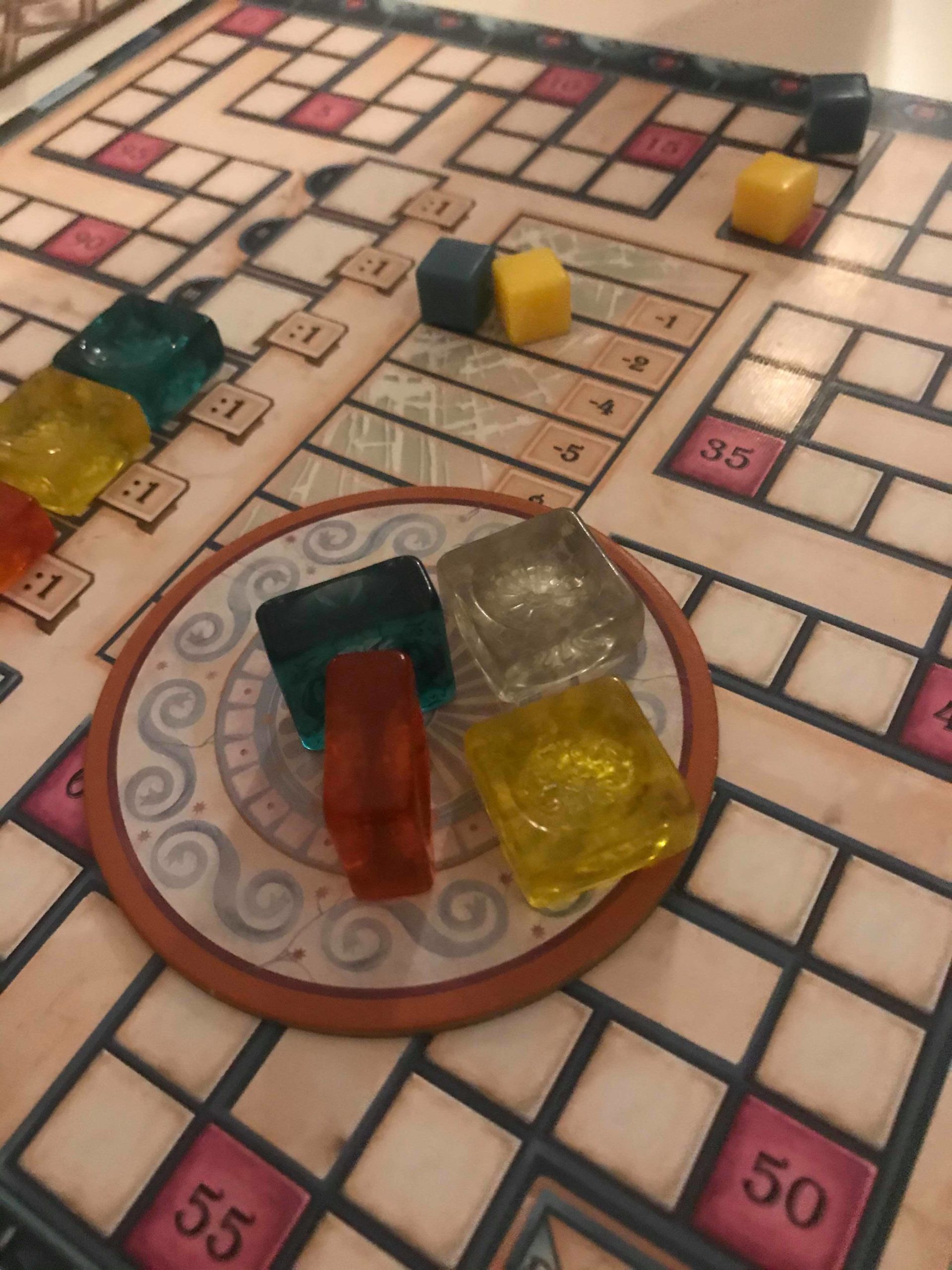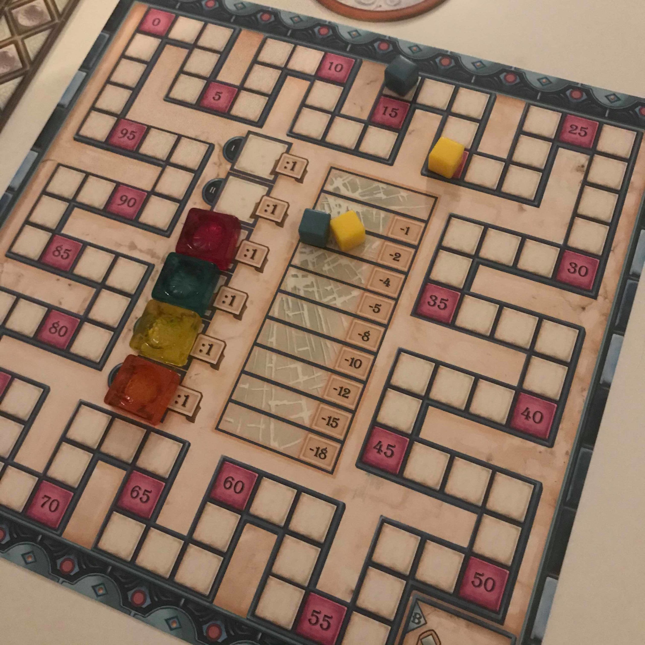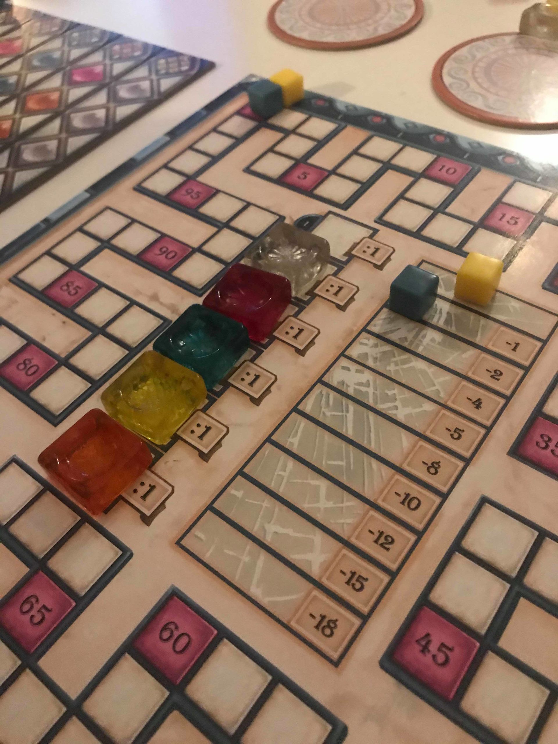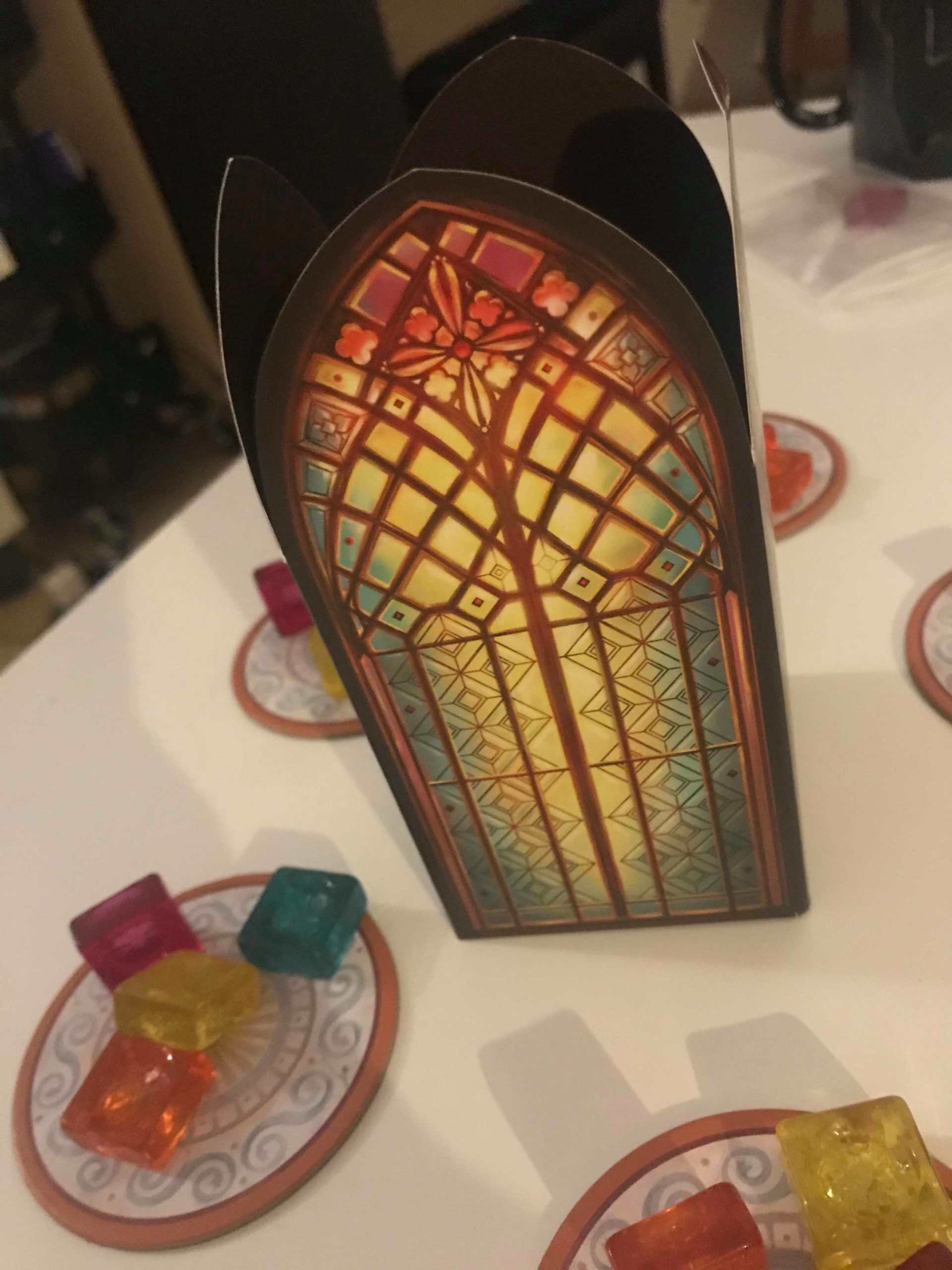 Chaque lot de 3 vitraux encore sur les planches motif rapporte 2 points. Il faut déduire des points en fonction de la position de votre marqueur sur la piste de verre brisé. Enfin, les points marqués dépendront de la face choisie. Pour la face A, plus vous aurez de vitraux autour des ornements, plus vous marquerez de points. En ce qui concerne la face B, il faudra multiplier le nombre de vitraux d’une couleur par le nombre de fenêtres complétées équivalant au nombre de planches motif que vous avez retiré.