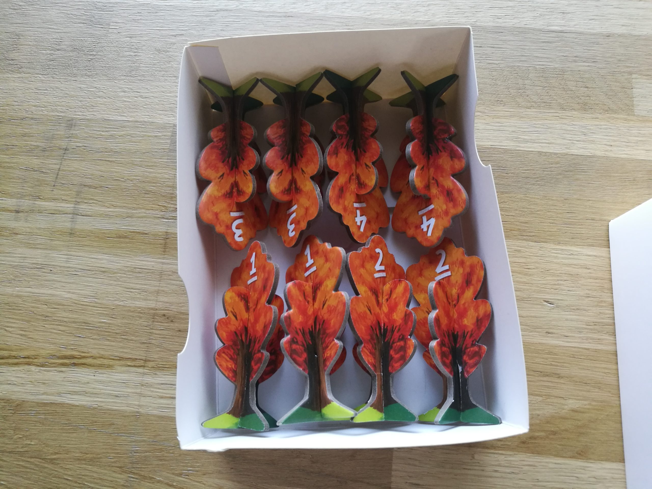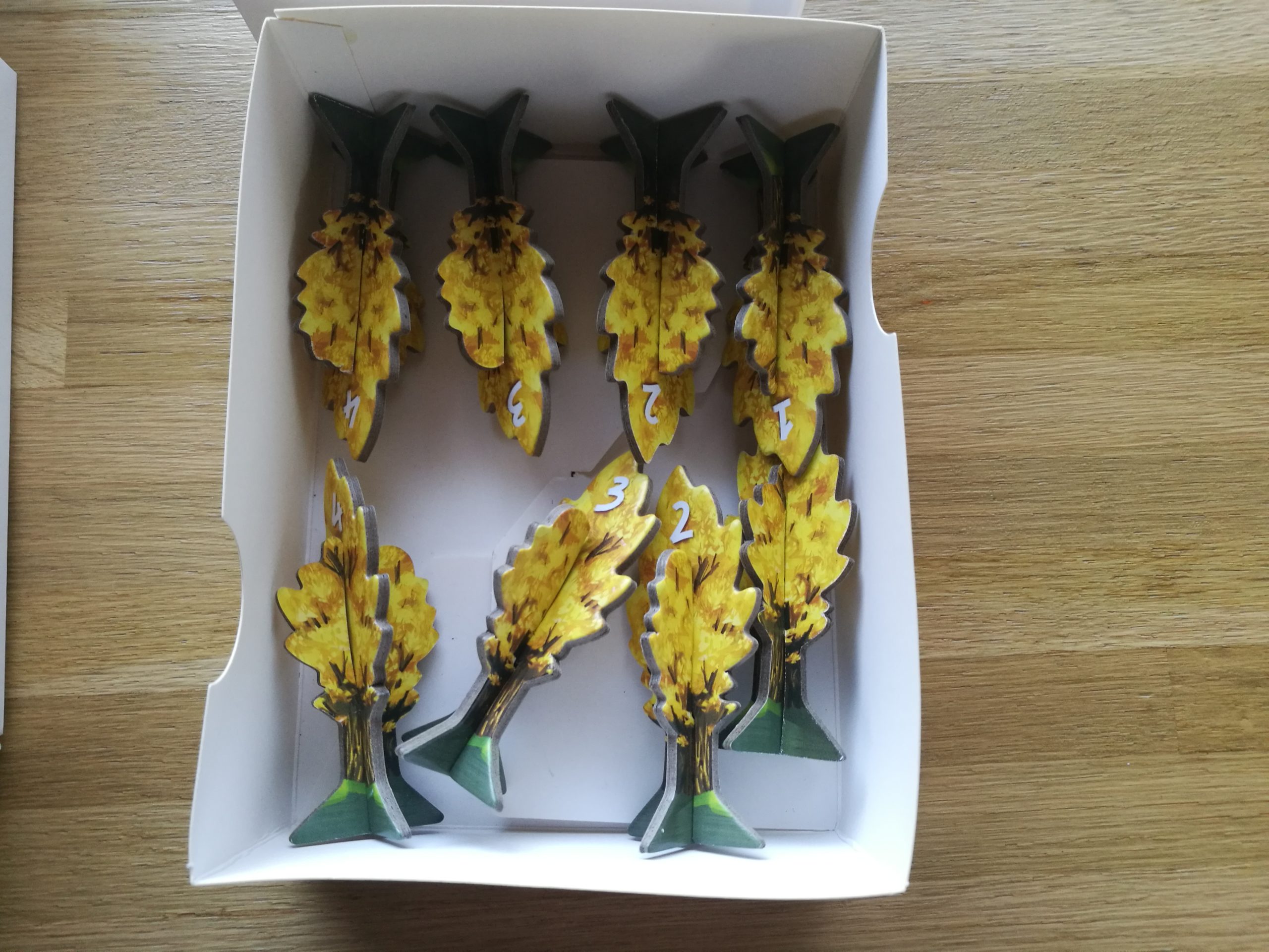 Une fois les feuilles tombées des 4 premiers arbres et lesdits arbres retirés du plateau, ça sera à vous de faire vos choix sur les arbres pour lesquels vous ferez tomber les feuilles, donc l’ordre ne sera plus imposé, calculez bien quel arbre choisir en fonction du nombre de feuilles qu’il vous reste et de leur placement sur le terrain !
