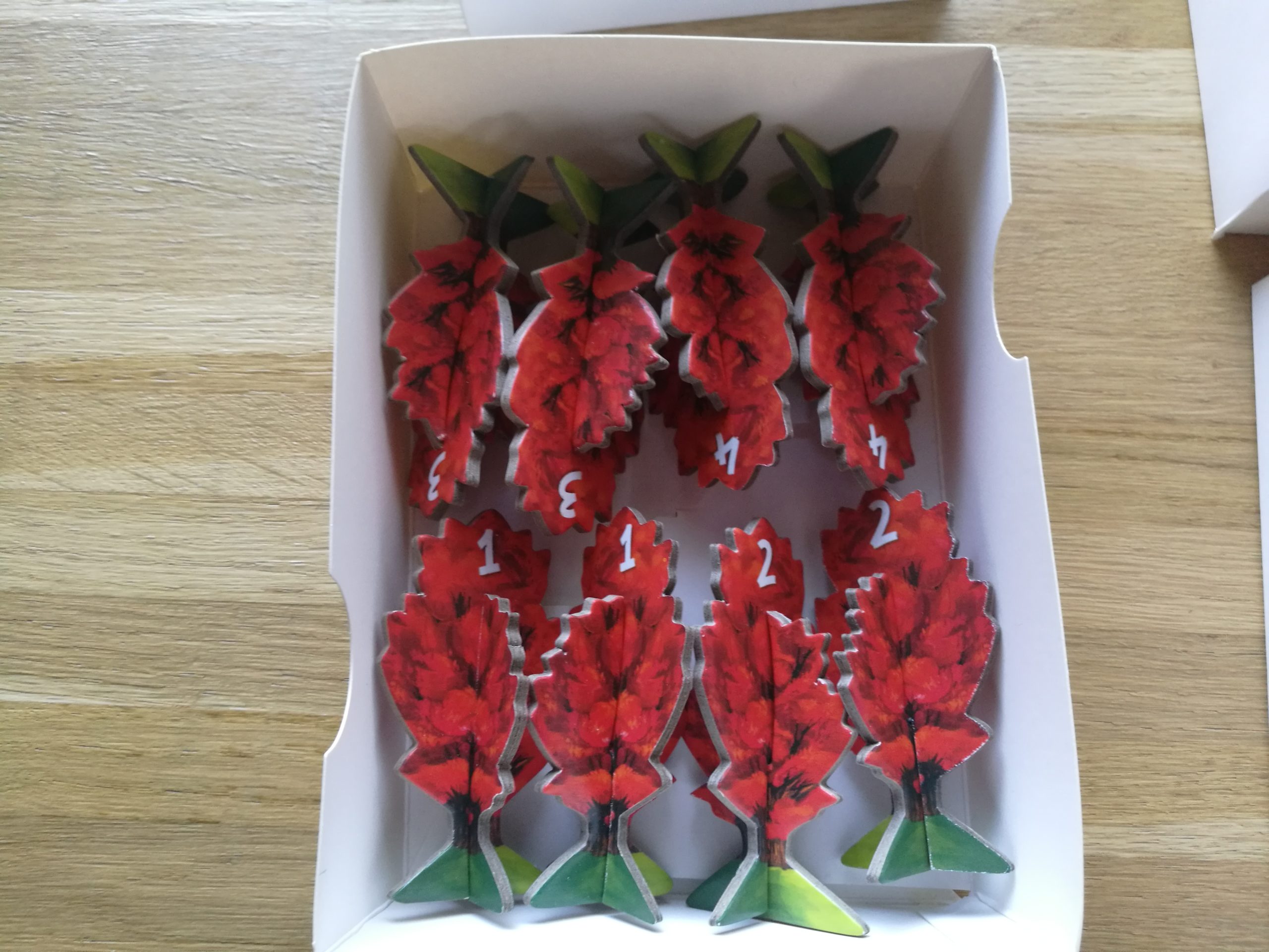 Le premier joueur va choisir une valeur de feuilles (en choisissant parmi les 8 grosses feuilles numérotées d’écureuil à 8, non ce n’est pas une erreur de frappe, vous verrez plus tard que ça a du sens) et va prendre le nombre de tokens feuilles souhaité pour les placer dans le sens du vent en partant du pied de l’arbre qu’il a sélectionné.
