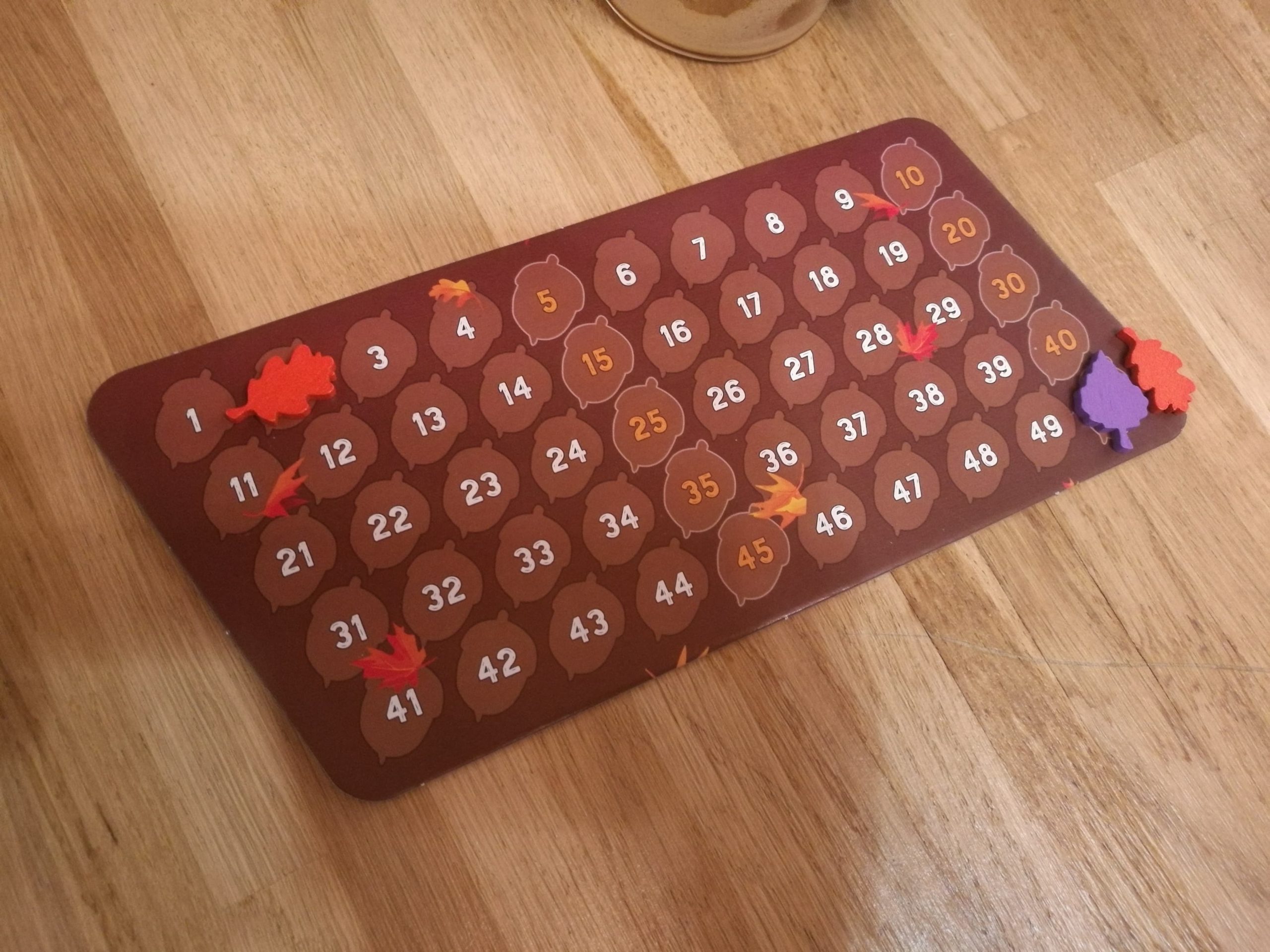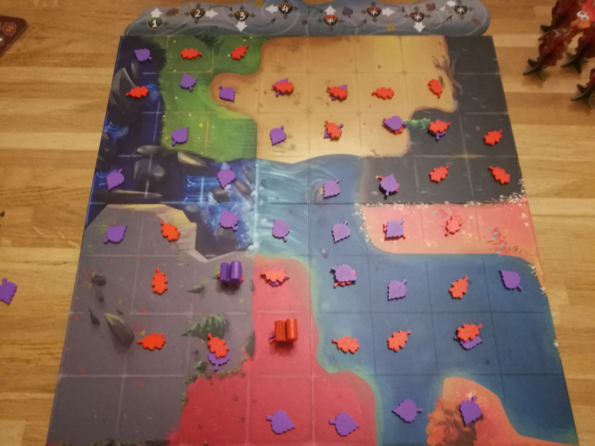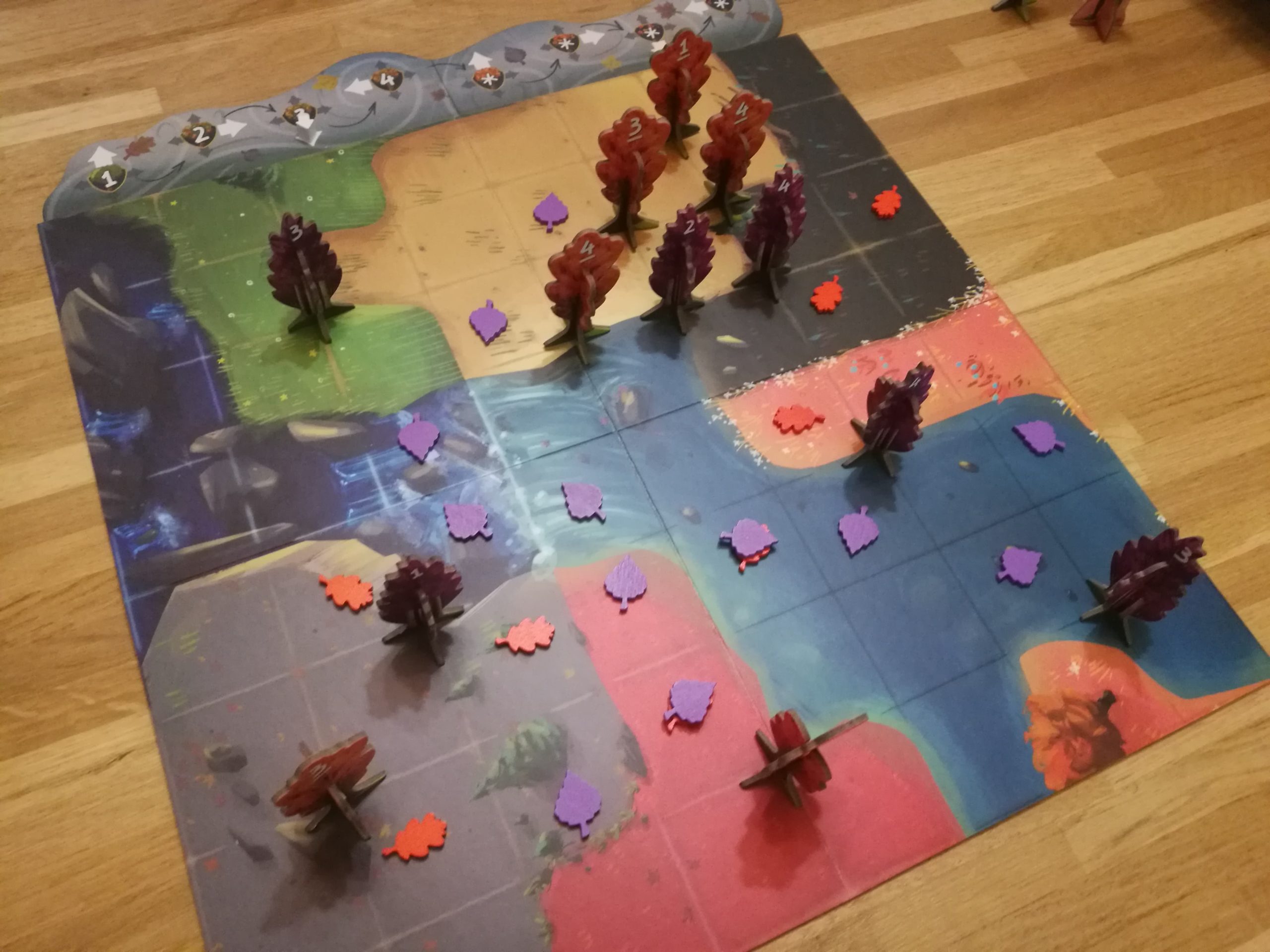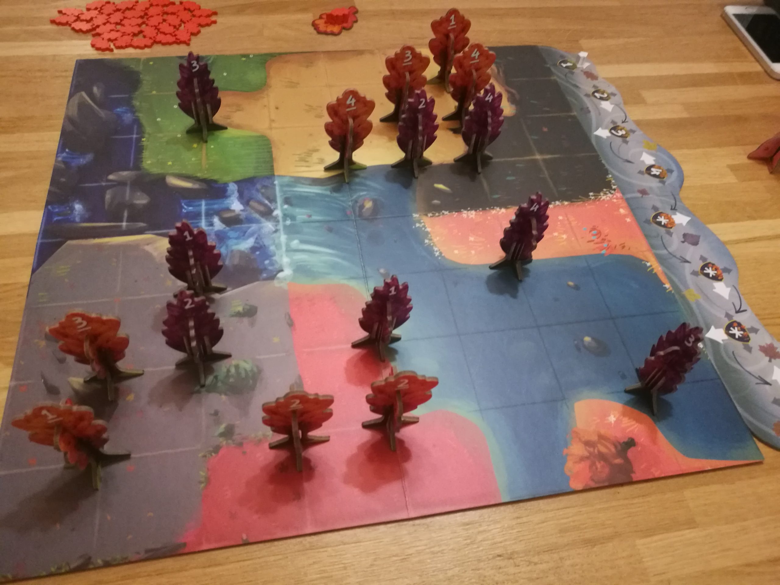 Une fois toutes les feuilles placées sur le plateau et tous les arbres retirés, on compte quel joueur possède le plus de feuilles dans une zone et on calcule les points d’après les indications de la règle, de la même manière qu’au printemps, les égalités et les rares cas où vous seriez seul sont évoqués dans la règle.