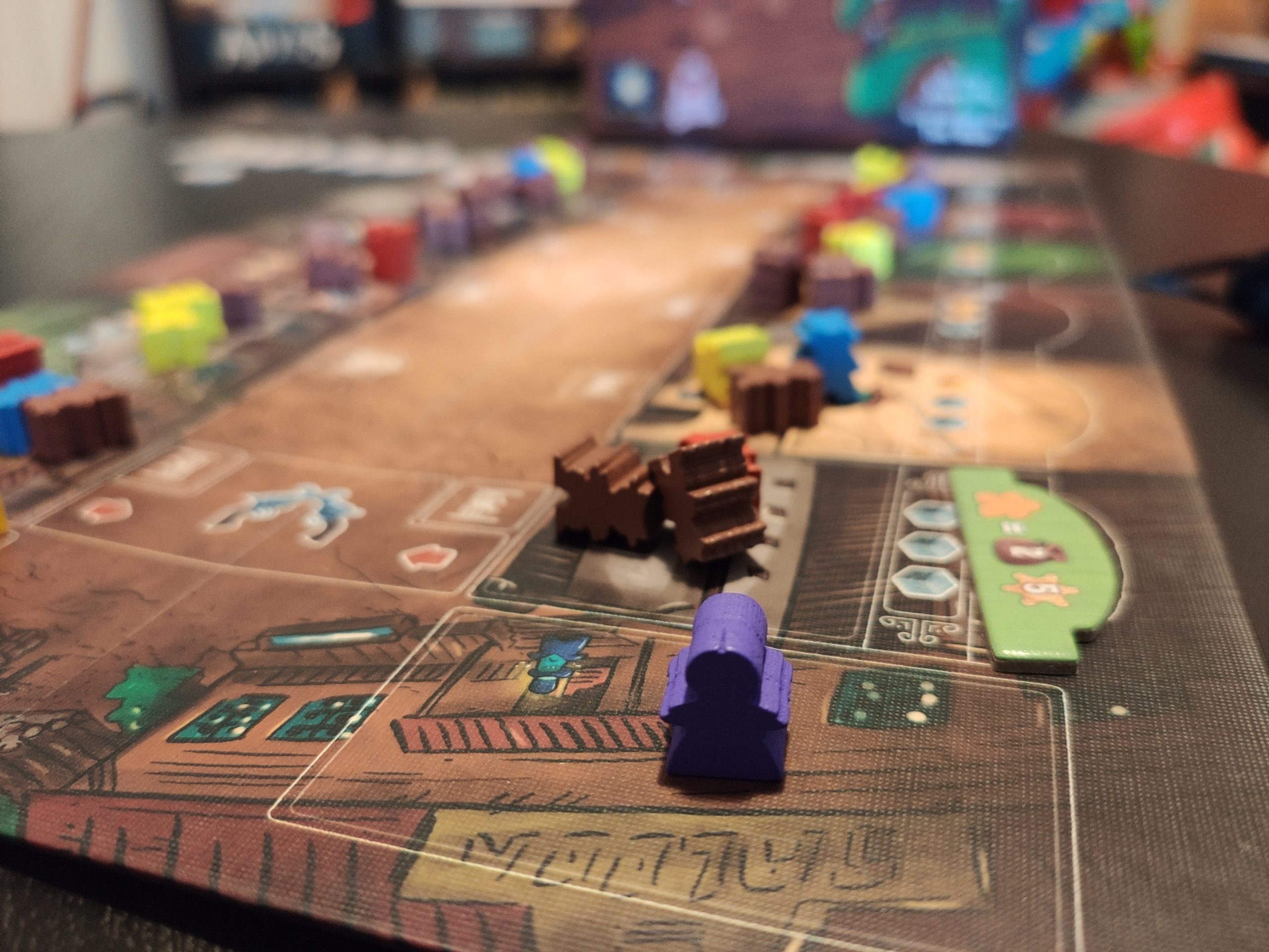 Dans ce jeu de placement, on va égrainer des meeples le long de la rue sur les bâtiments adjacents, et déclencher les actions correspondant à la couleur du meeple.