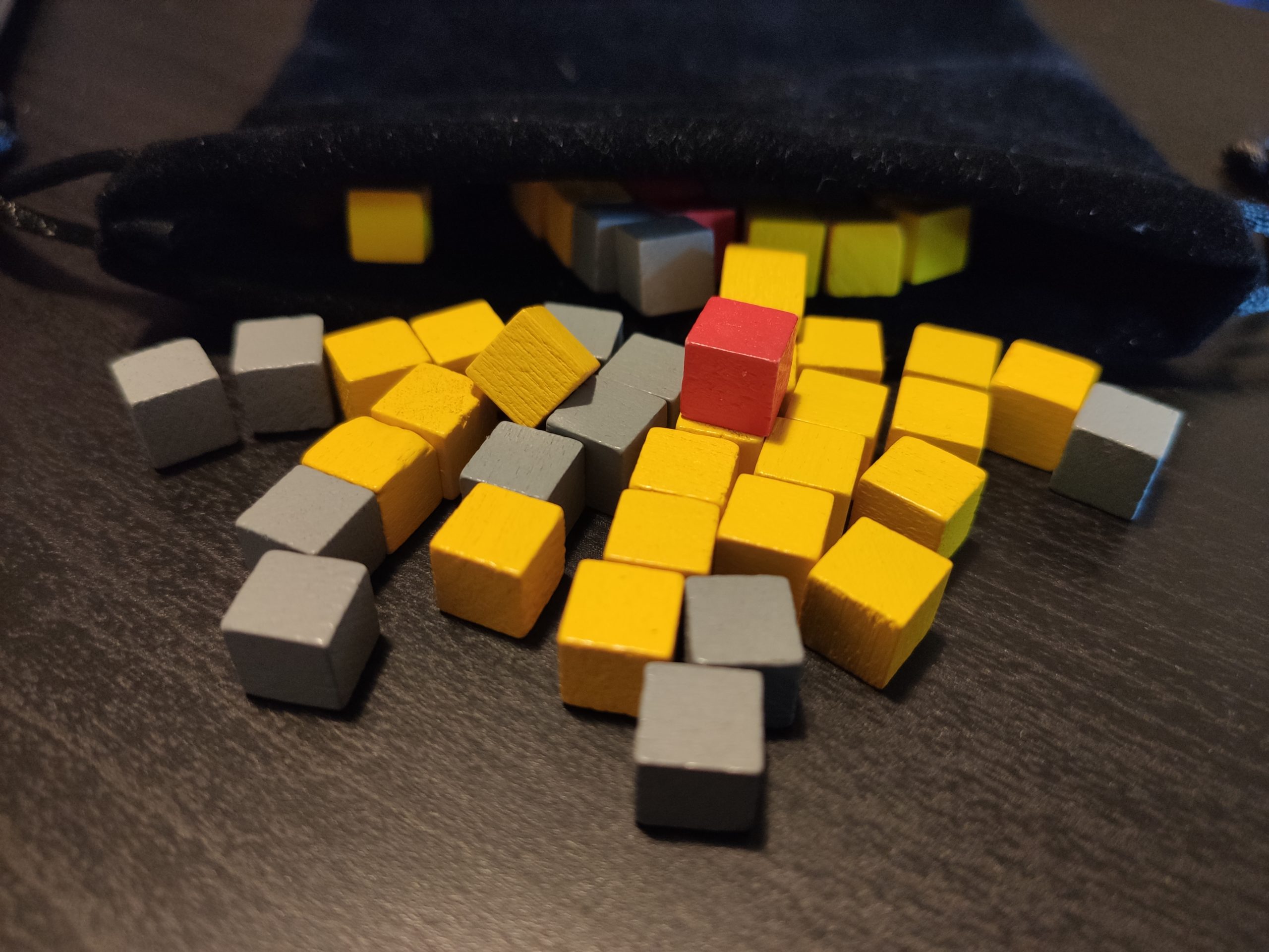 Les cubes ressources représentant l’or et la pierre – et qui sont nécessaires pour construire les chapiteaux sur les bâtiments, et convertir l’or en lingots pour obtenir + de points de victoire – sont placés dans un sac de minage dans lequel les joueurs iront piocher au hasard les cubes.