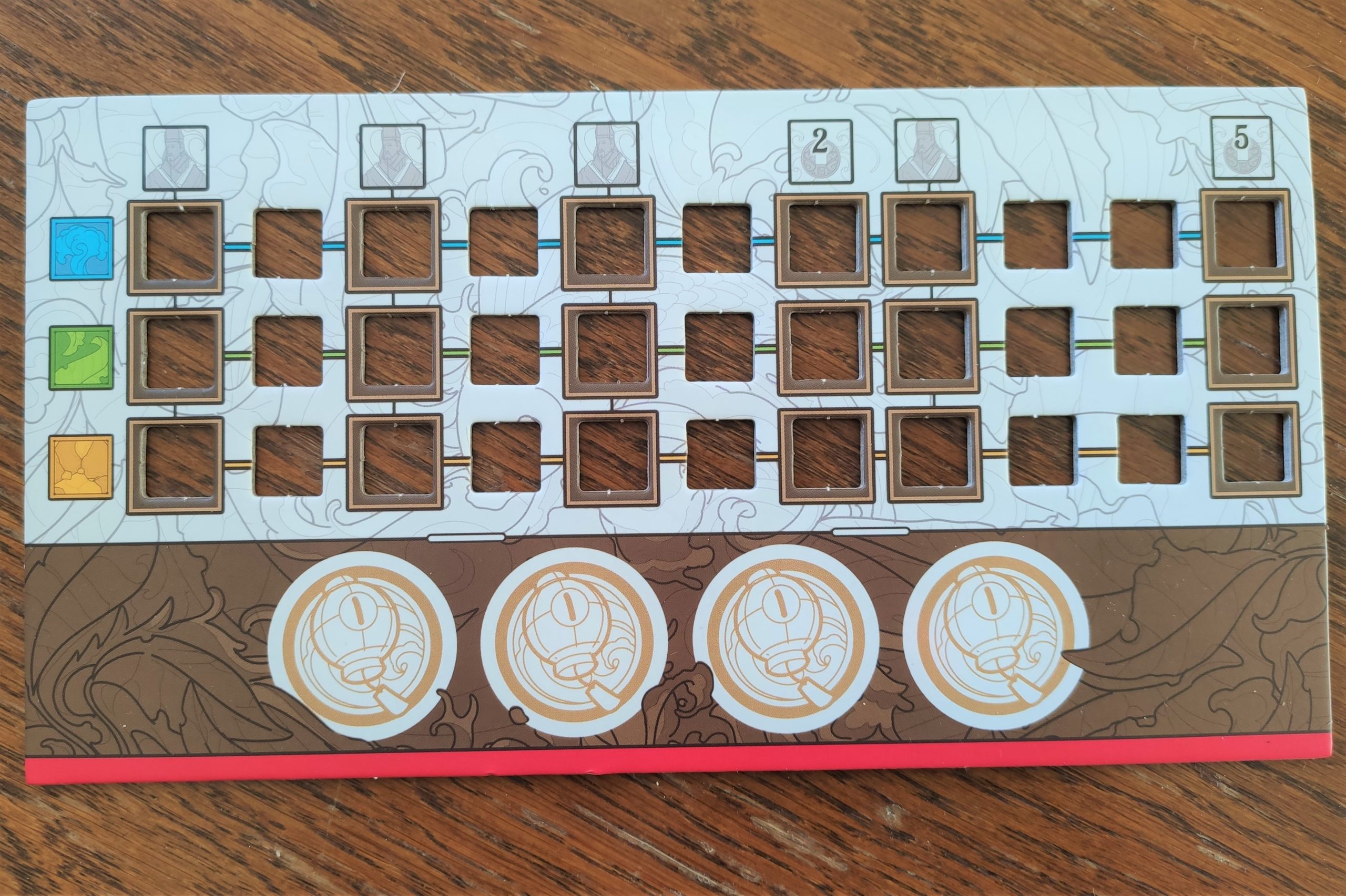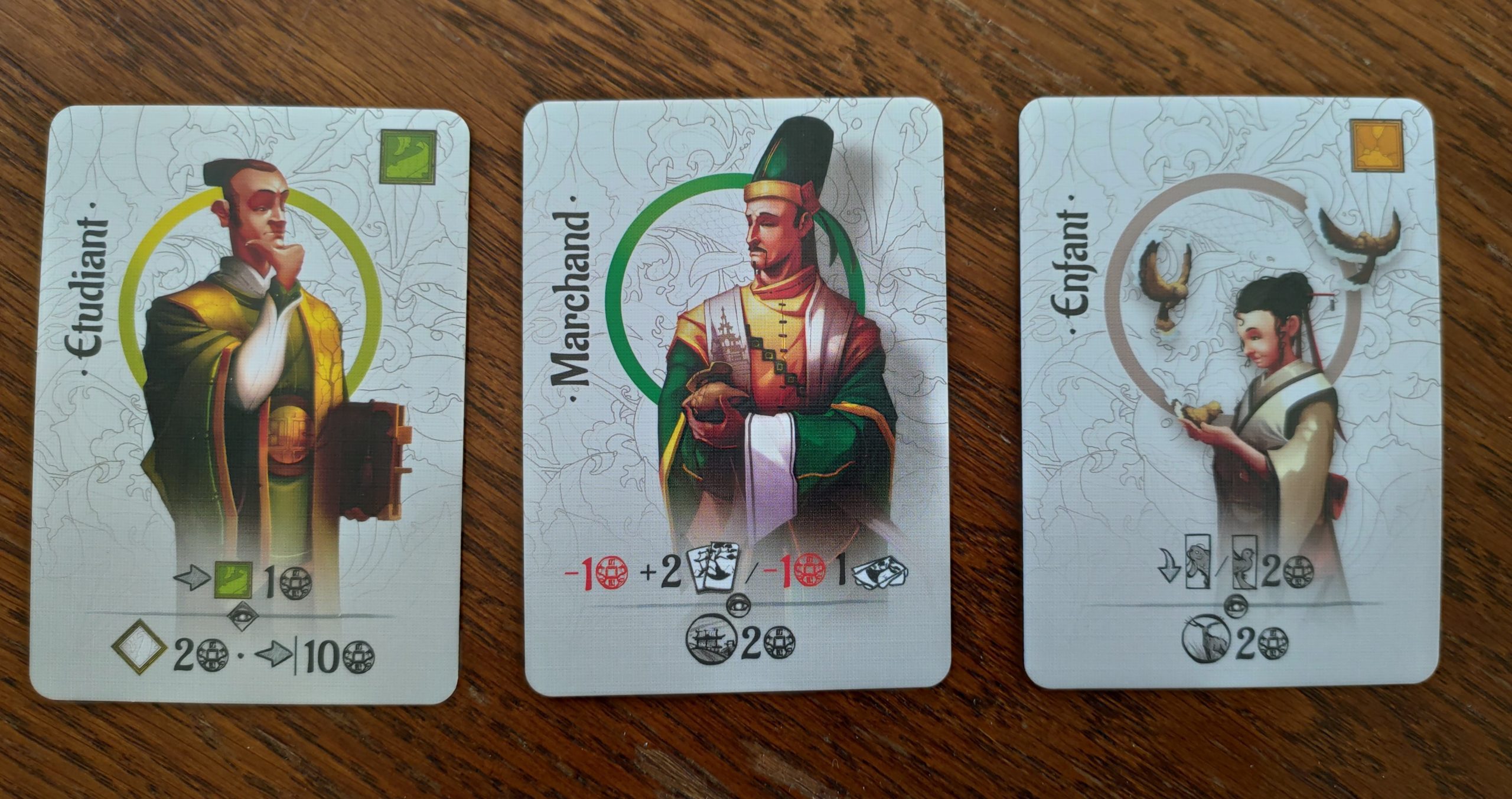 A la fin de la partie, on fait le décompte des points en prenant en compte les pièces gagnées avec les cartes décoration et les personnages.