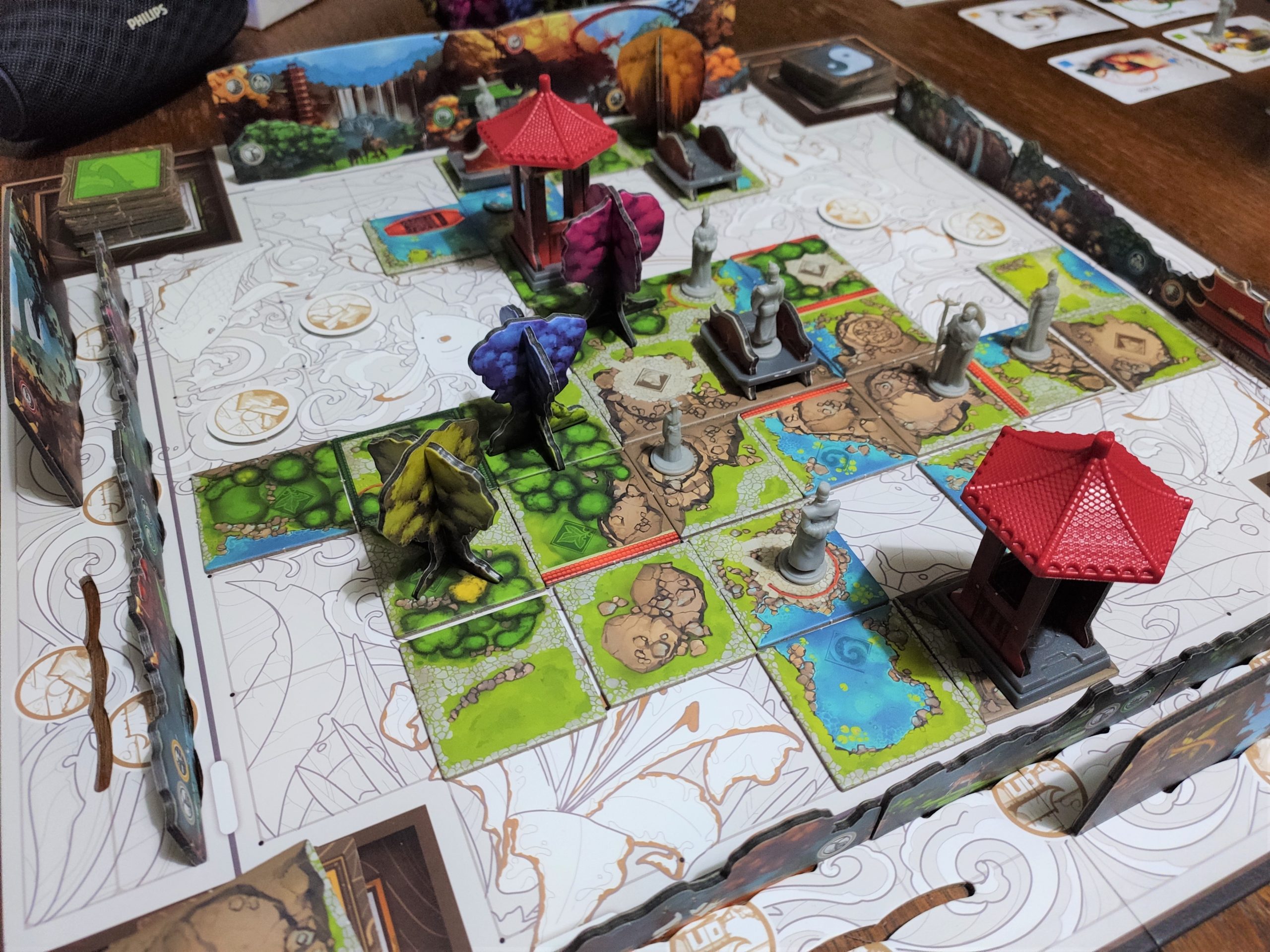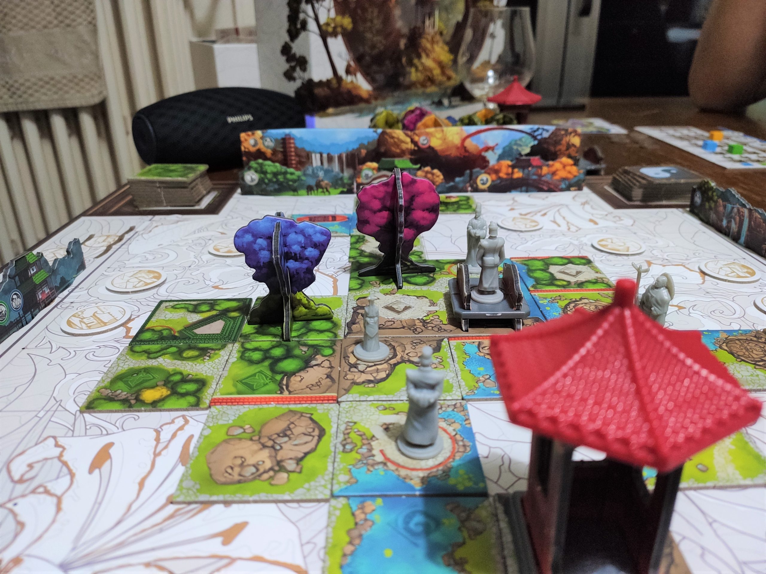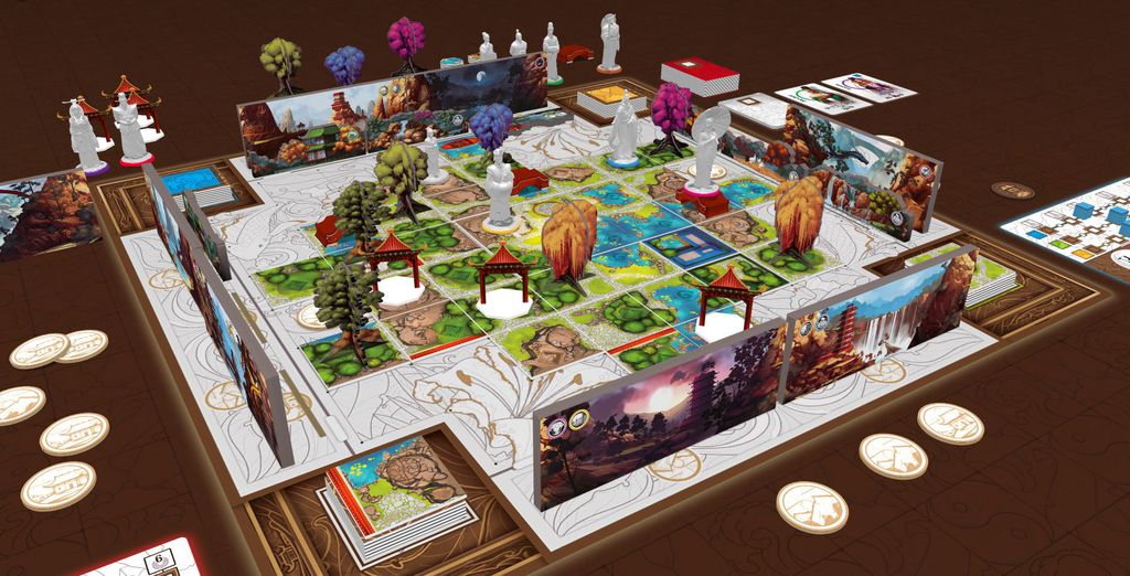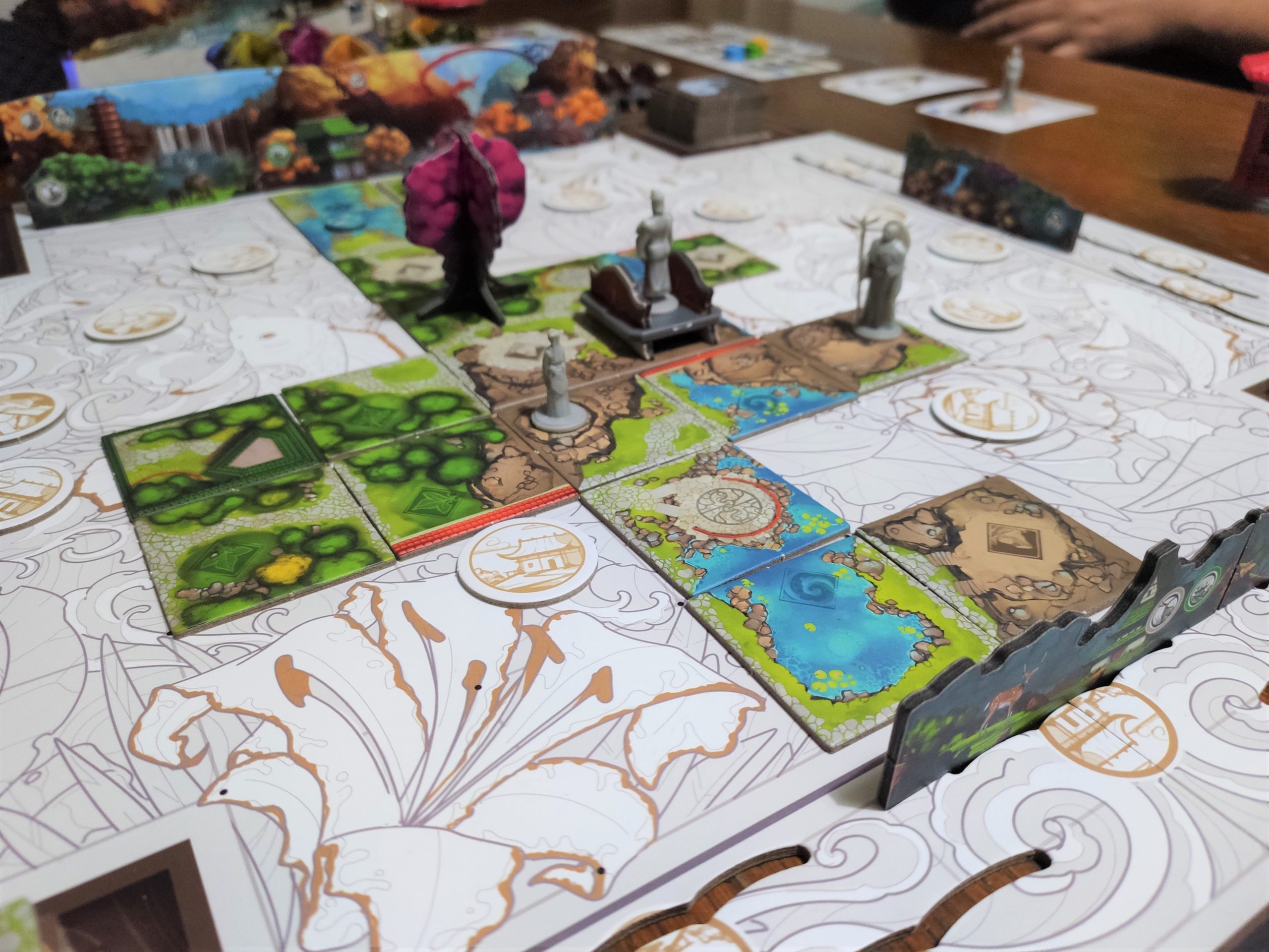 La partie est fluide et les tours peuvent s’enchaîner si les joueurs savent à peu près ce qu’ils veulent faire. Ça peut durer en longueur si les joueurs tâtonnent mais c’est généralement le cas pour les jeux lors de la 1ère partie. Voir le jardin se construire et se remplir au fur et à mesure de la partie est très intéressant. On part vraiment d’un plateau central vide avec juste une seule tuile de départ, et lorsque la partie se termine, les éléments de décors en 3D, les personnages, les différentes tuiles formant des lacs, forêts, sentiers et autres sont visibles. Le jardin est alors entouré par les tuiles paysage et lorsqu’on se place à hauteur des personnages pour étudier leur ligne de vue, on observe alors un plateau de jeu très riche et fourmillant de détails.