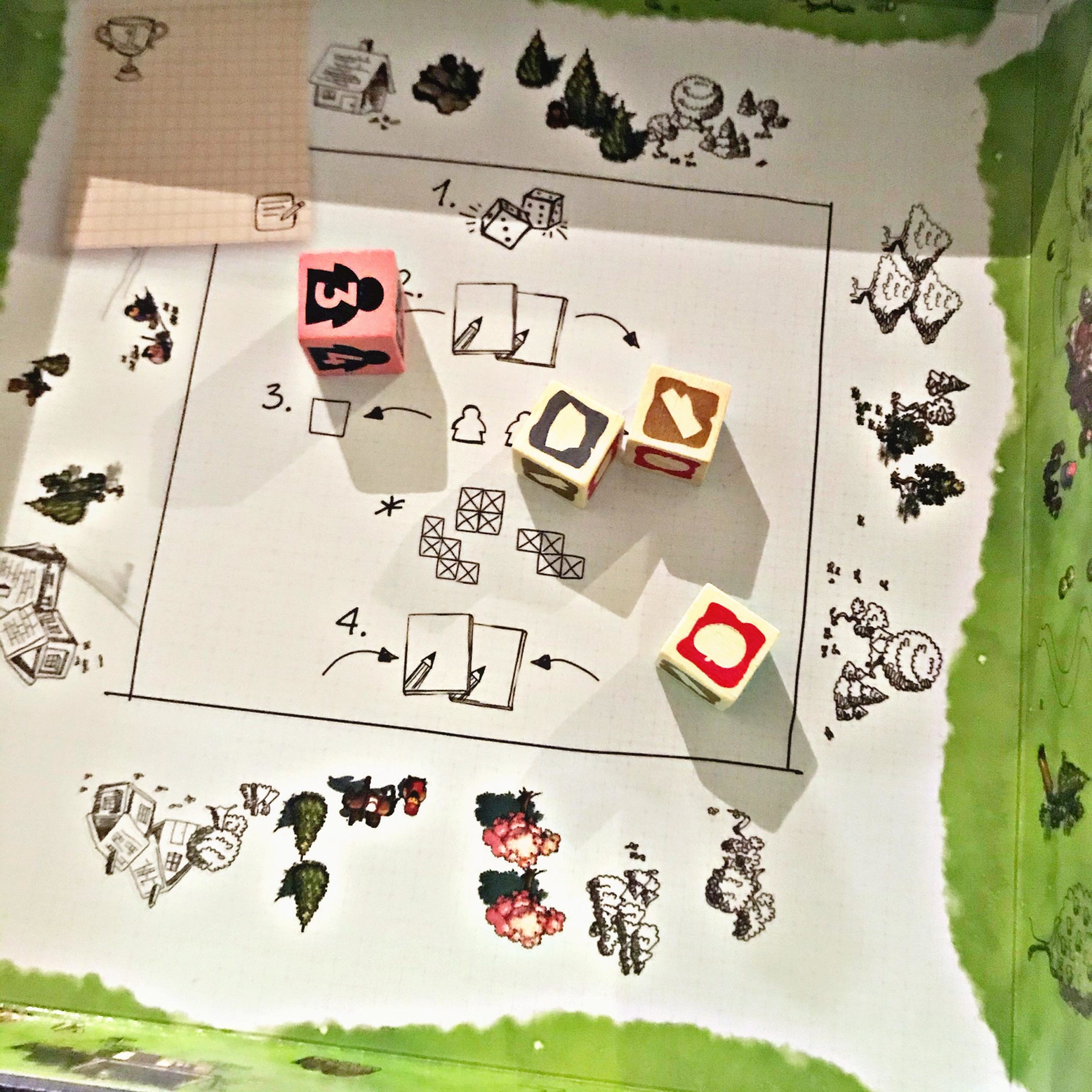 Le matériel est très beau et de bonne qualité – seul bémol pour les crayons fournis avec, mais bon, il suffit d’en prendre d’autres et c’est oublié 😊 Les tuiles Faveur sont réalisées dans un carton épais et les dés sont trop mignons. Le tout est rangé dans une boite où le fond de la boite est joliment décoré. Et le must, un résumé des règles y est aussi inscrit.