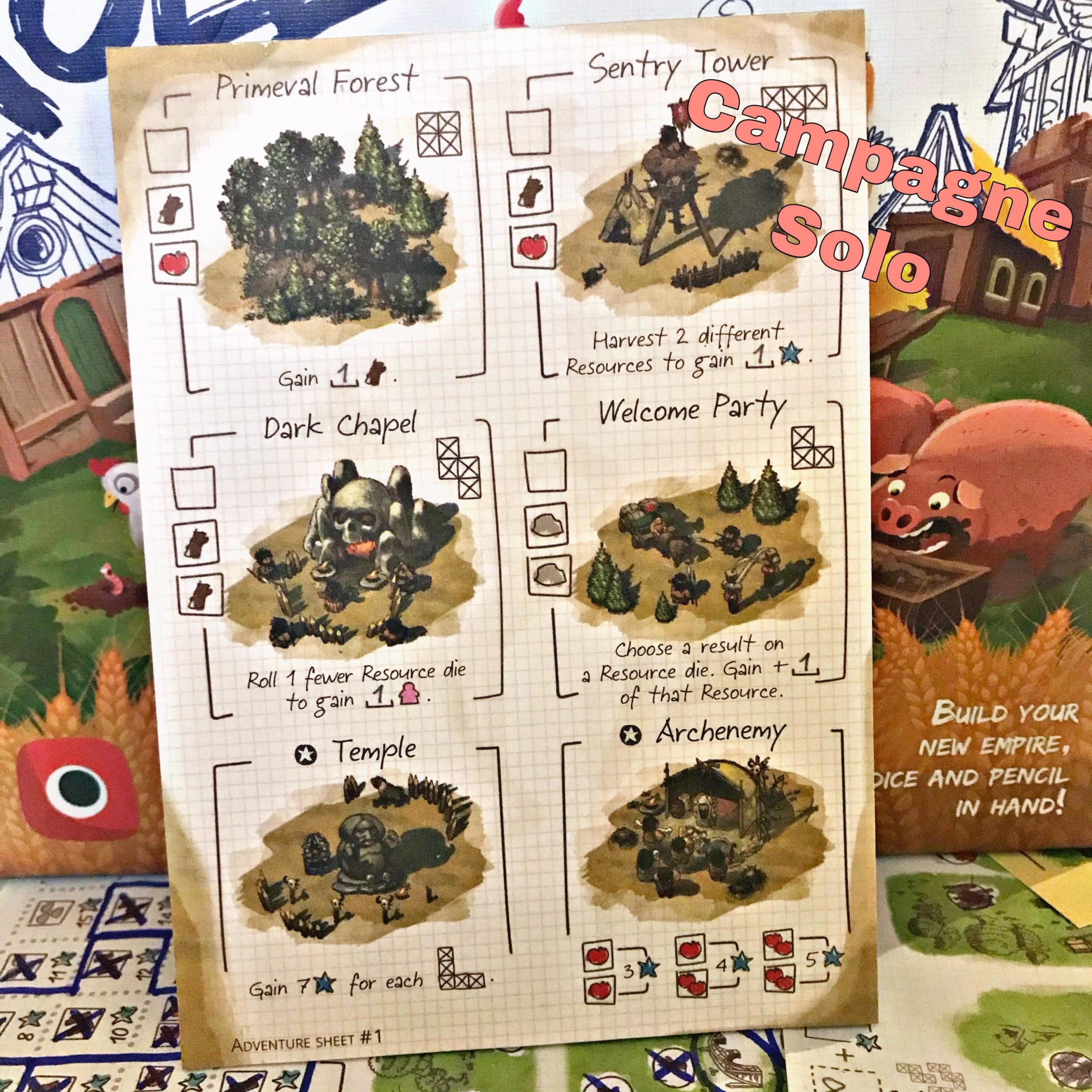 Le must have est le mode aventure du mode solo ! 48 villages à explorer, tous différents. Un vrai régal ! L’objectif : dépasser les 80 points pour être sacré Empereur. Bon, même si vous n’atteignez pas ce score, d’autres titres vous attendent ^^. L’interaction étant quasi inexistante, ce jeu tire tout son potentiel dans ce mode.