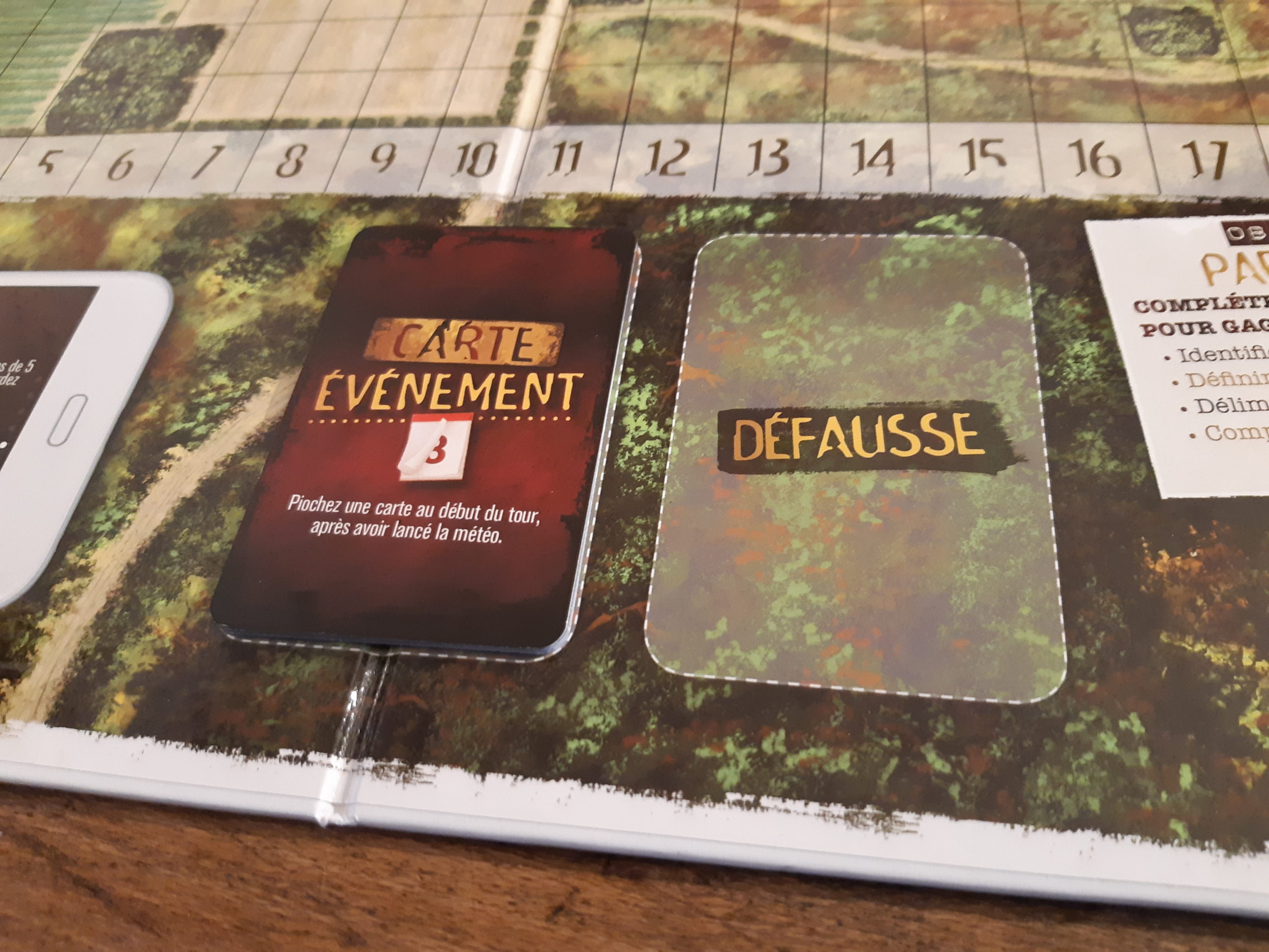 Puis un joueur retourne une carte Evénement et la lit : elle représente le tour en cours. (Eh oui, en mode Famille, ces cartes ne servent qu’à compter les tours. On ne les lit qu’en mode Expert.)