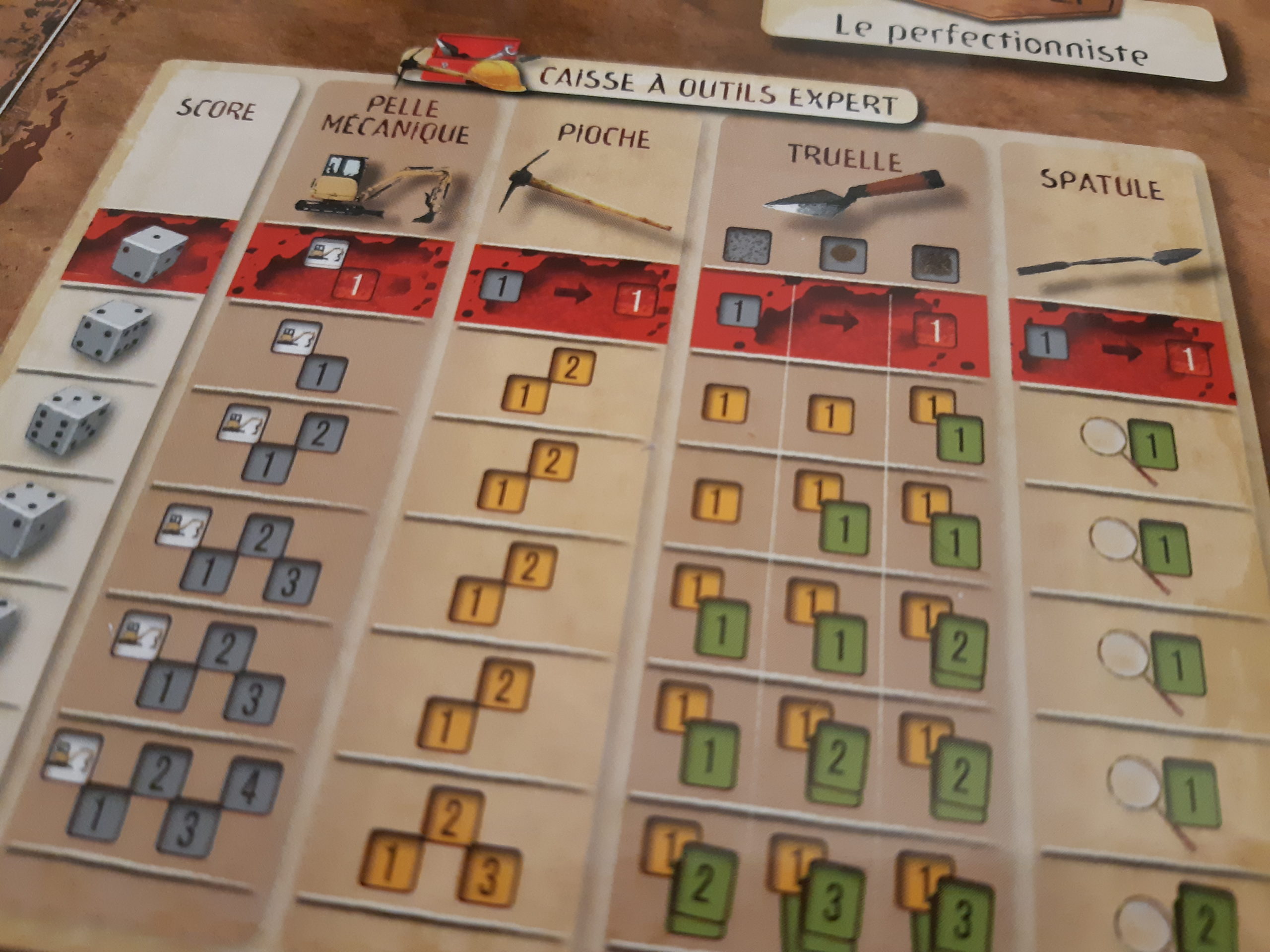 Savoir où creuser n’est pas forcément évident au début car, de mon point de vue, certains points des règles ne sont pas forcément très clairs. Ou alors je vieillis mal et je comprends moins bien… Pelle mécanique = cases adjacentes orthogonalement ou en diagonale, c’est pourtant simple ! 😉