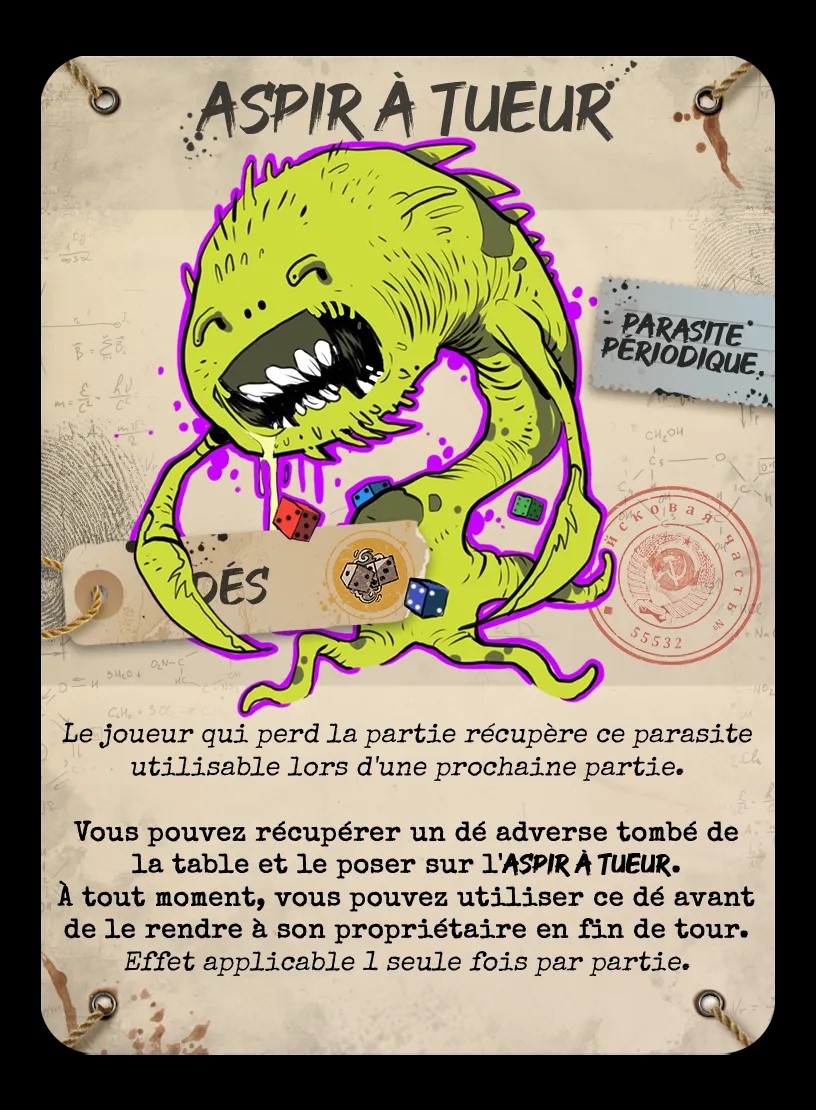 Quel que soit le type de parasite, qu’il soit périodique ou permanent, qu’il ne s’utilise qu’une fois dans la partie, à vous seul, ou à tous les joueurs, qu’il soit le butin du perdant de la partie, le parasite viendra revisiter votre façon de jouer, viendra mettre de la folie dans votre partie « sérieuse », du chaos dans votre équilibre ludique.