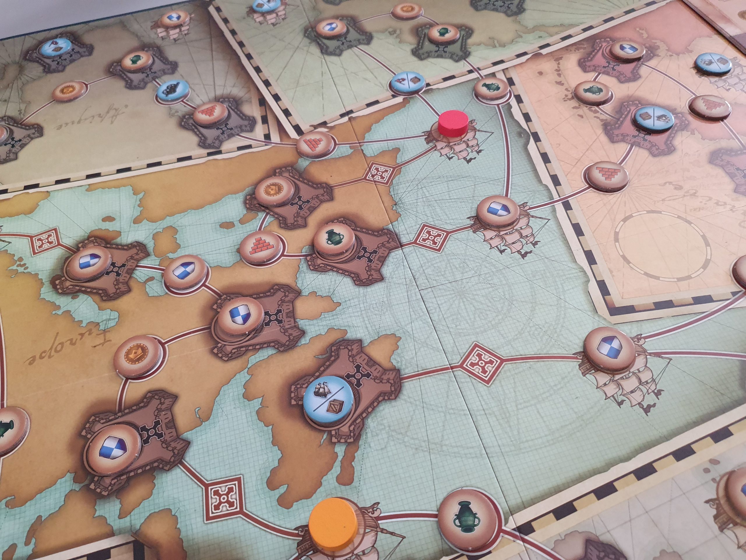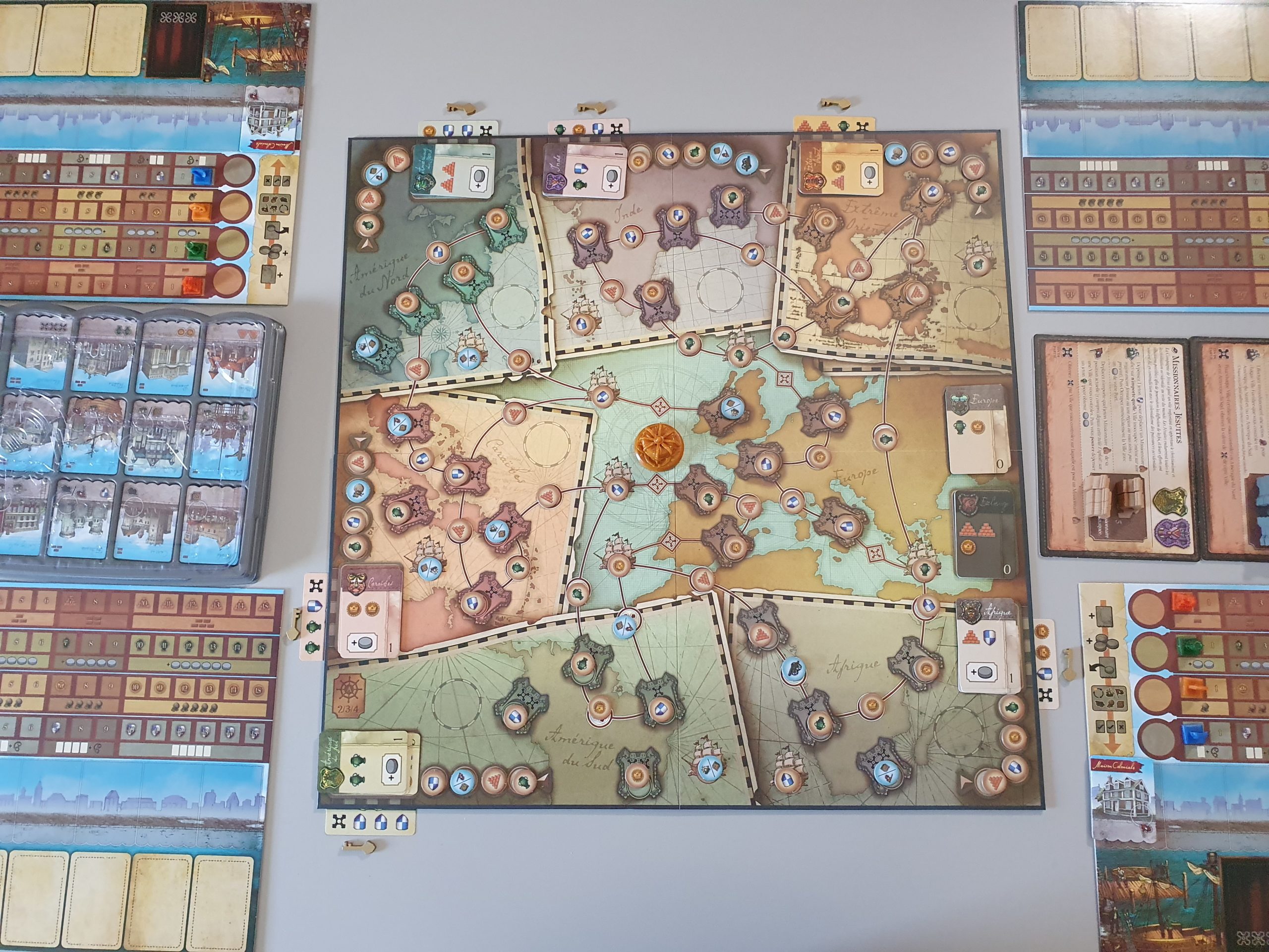 Le plateau central représente donc la carte et les 7 zones dont seule l’Europe est accessible au début de la partie. Chaque région dispose de villes reliées par des liaisons, une zone de pleine mer et une piste d’expédition avec son paquet de cartes.