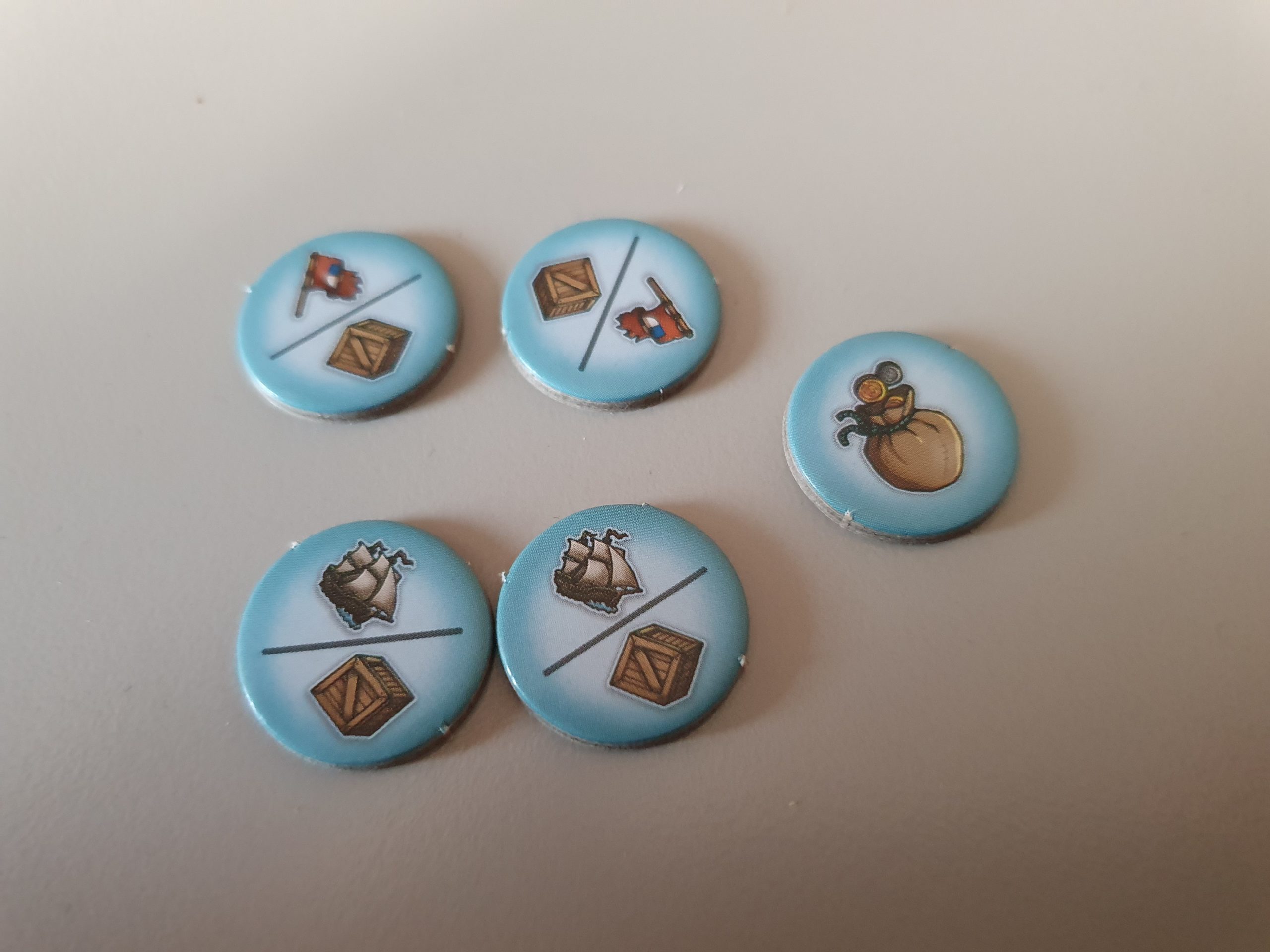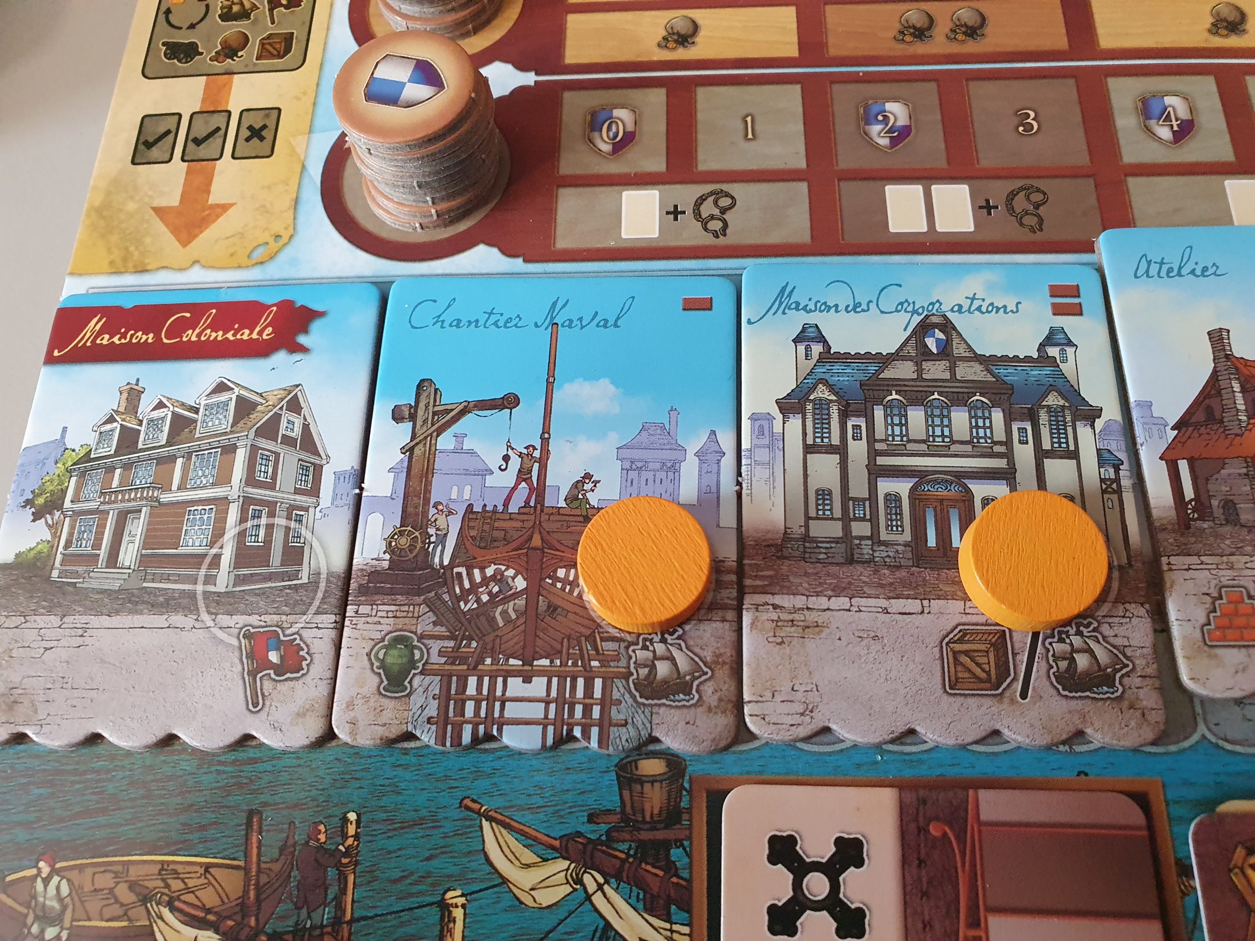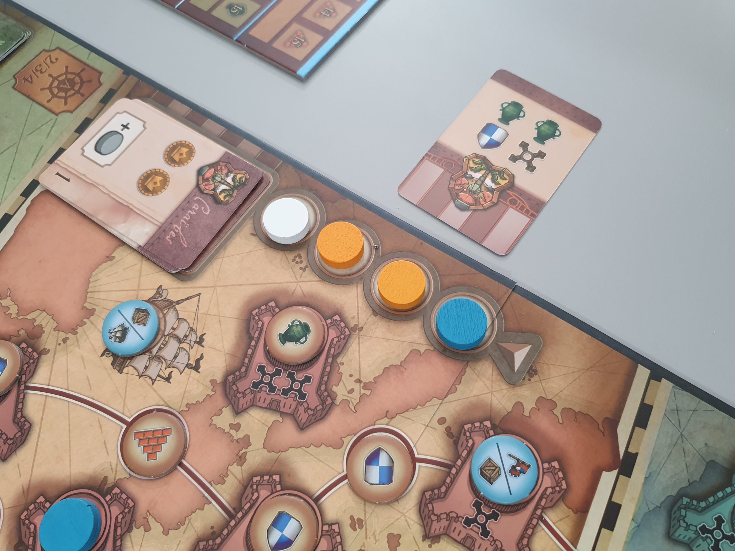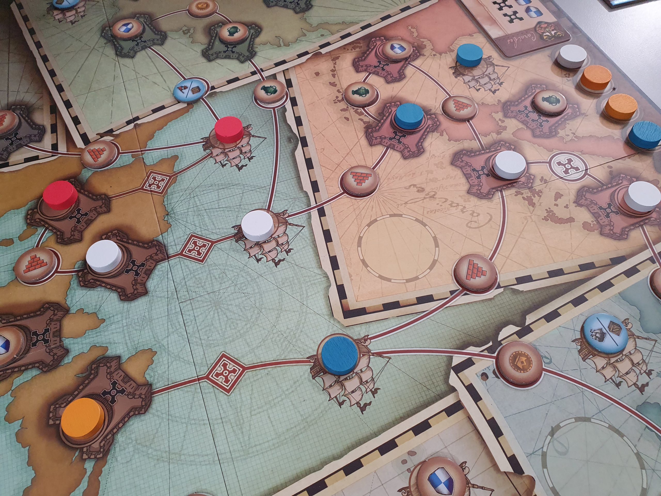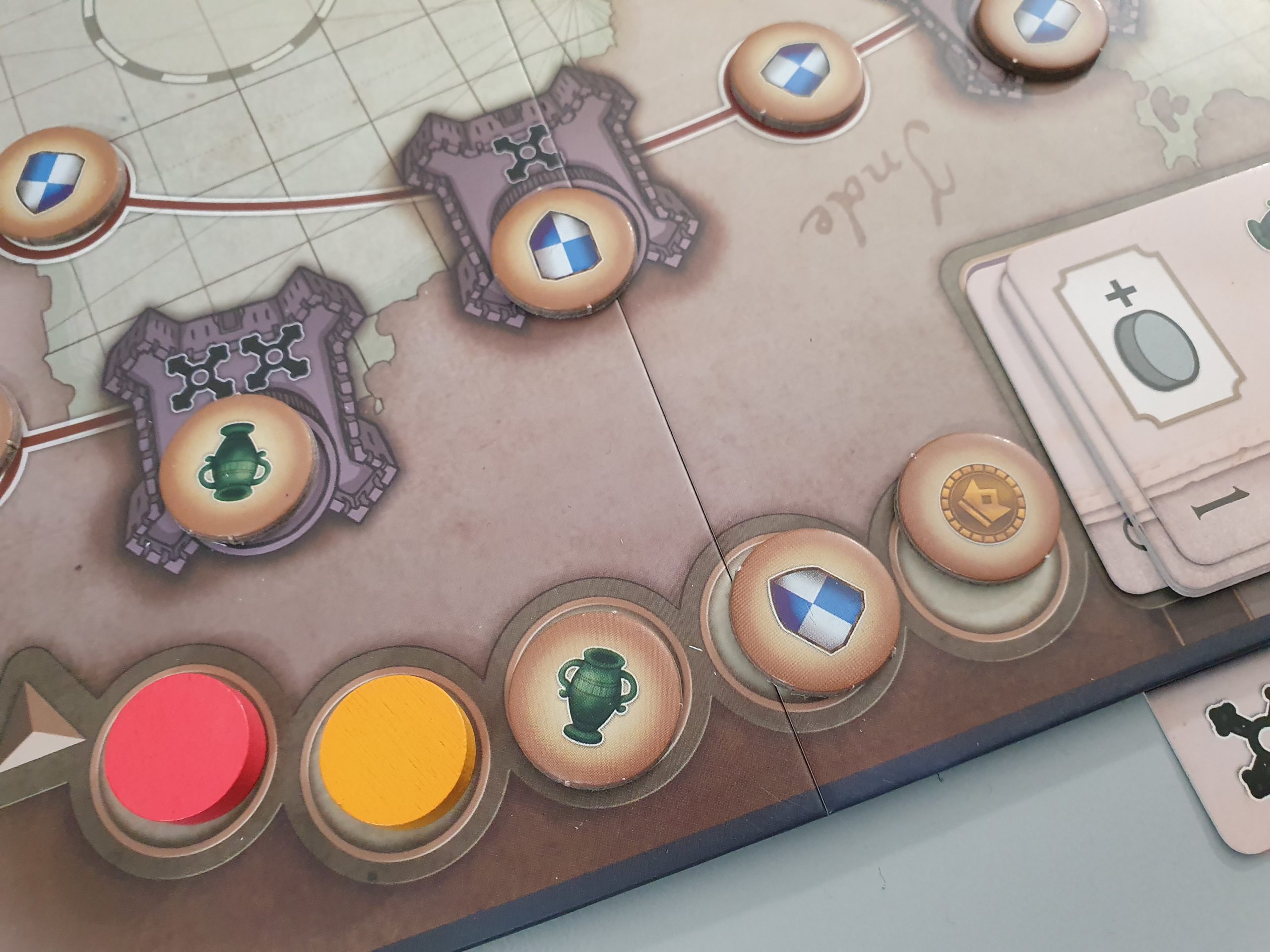 La carte double face est vraiment belle et vous plonge dans cette période de découvertes maritimes. Les tuiles bâtiment sont très joliment illustrées, et l’ensemble très homogène et immersif.