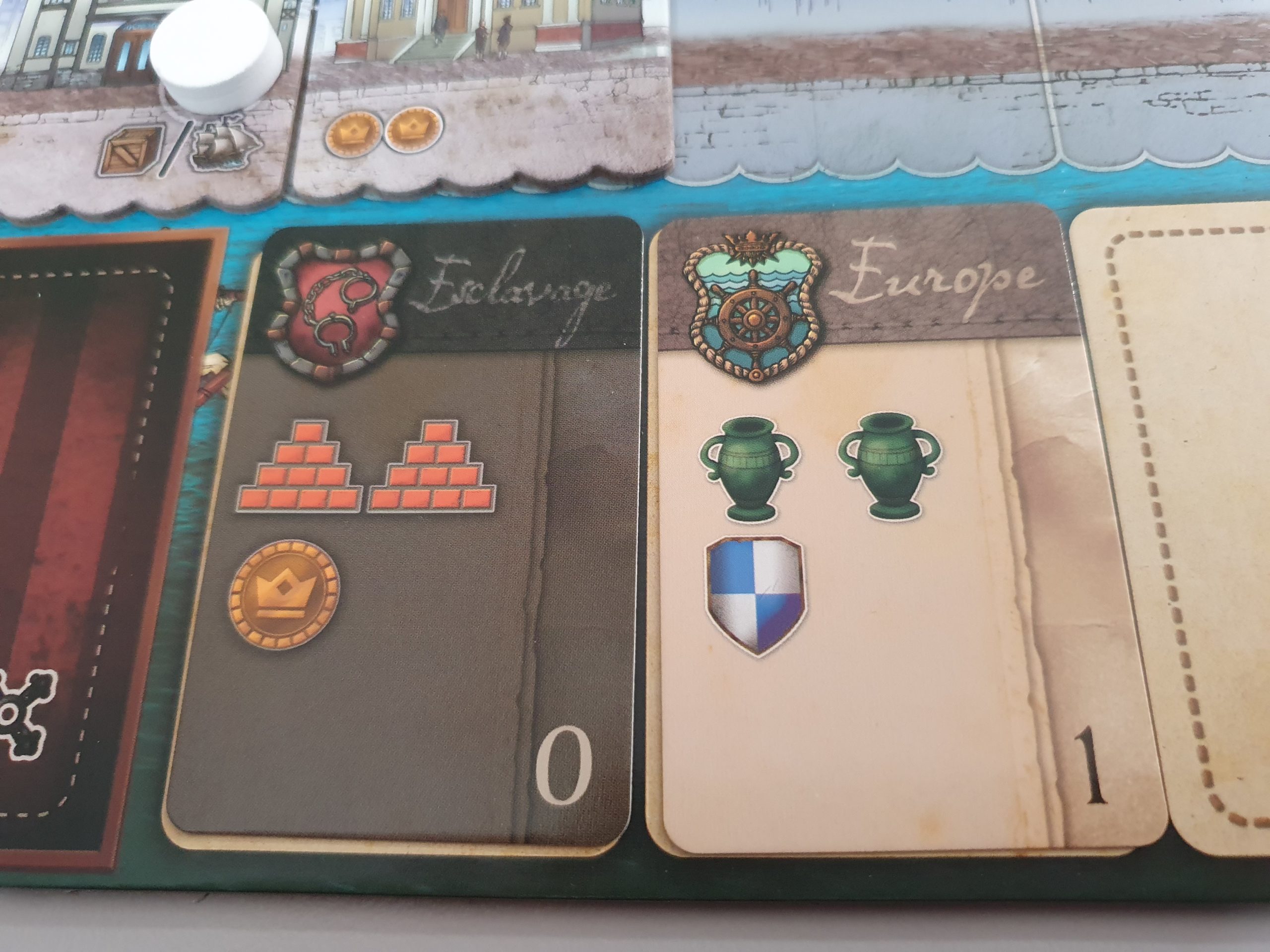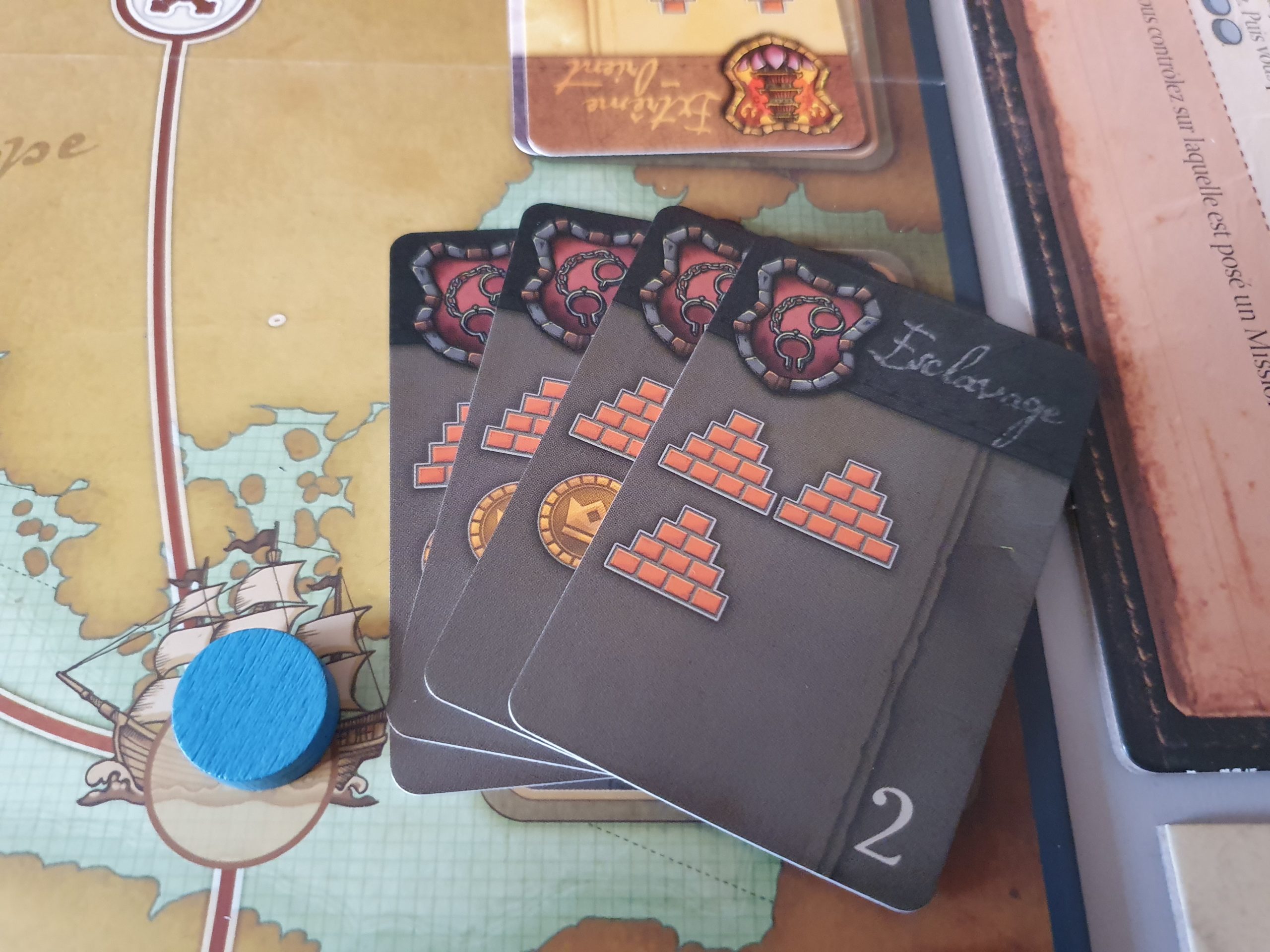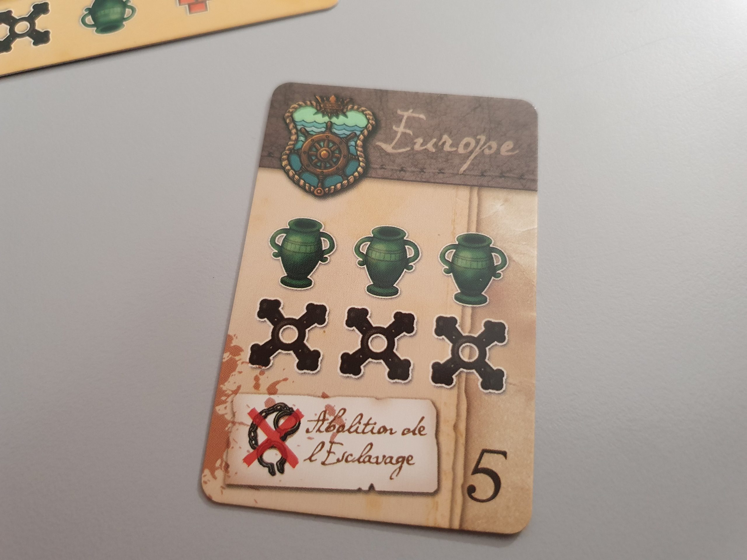 Il y a donc une deuxième pile de cartes avantage dans la région Europe, dans laquelle les joueurs peuvent piocher. Très clairement, les bonus de ce paquet de cartes sont assez balèzes et tentants ! Par contre, et c’est là toute l’intelligence des auteurs selon moi, c’est qu’à un moment de la partie, lorsque la carte de valeur 5 de l’Europe est obtenue, l’abolition de l’esclavage est décrétée, et les joueurs doivent mettre de côté (mais pas défausser) les cartes esclavage qu’ils possèdent. Ils réduisent aussi les caractéristiques en fonction des symboles des cartes mises de côté.
