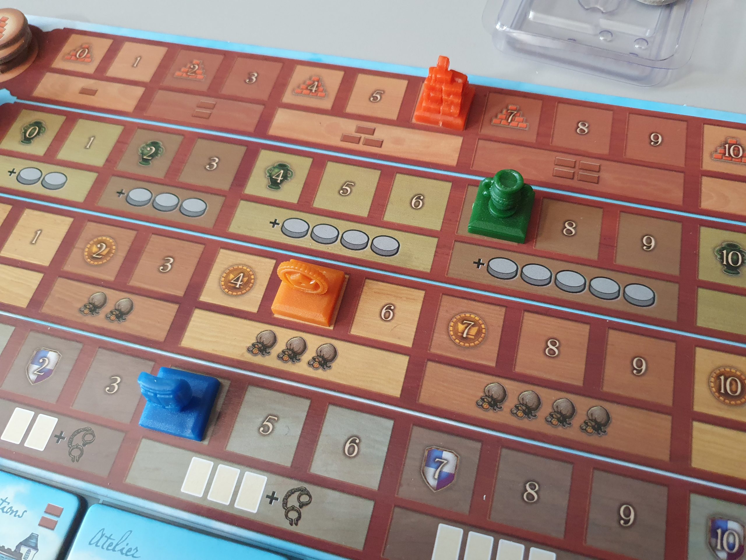 A la fin d’une manche, le jeton 1er joueur passe au joueur à gauche, et débute la prochaine manche. A la fin des 7 manches, on calcule le score de chacun avec les points des pistes de caractéristiques, des liaisons sur la carte centrale, des cartes bâtiments, cartes avantages et gouverneurs.
