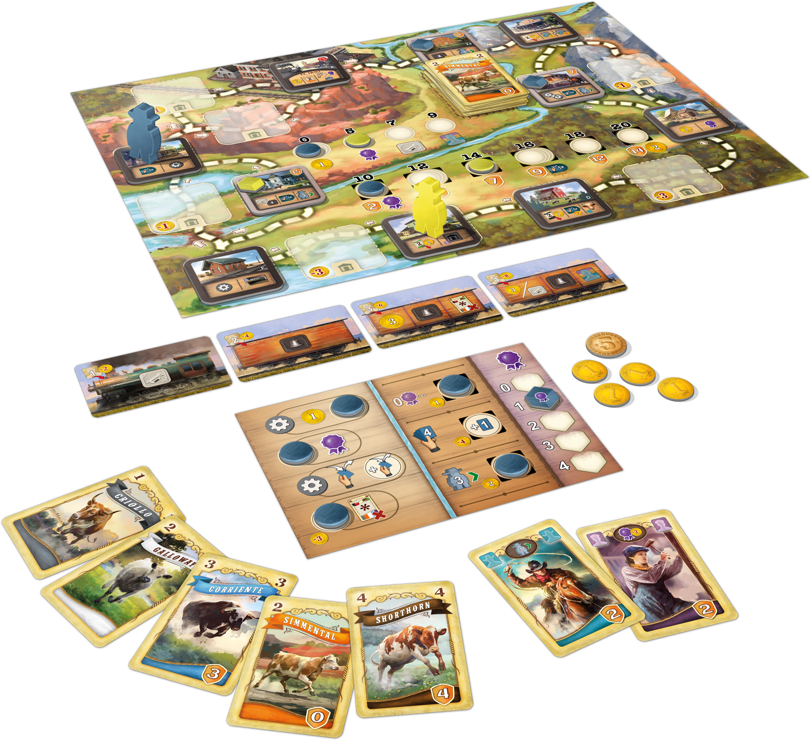Tout comme Pirate avec Maracaibo, il propose une entrée de gamme qui reprend les grands principes du jeu expert et qui s’adresse à des joueurs voulant débuter par un jeu plus court et à l’accessibilité facilitée sans pour autant souffrir de la comparaison avec son estimé ancêtre ! Car la filiation est bien réelle ! on retrouve tous les ingrédients qui ont fait le succès du premier : le bétail à vendre au marché, les bâtiments neutres et ceux que l’on va pouvoir acheter au cours du jeu, le train, et les « ouvriers » permettant en fonction de leur spécialité d’aiguiller votre stratégie.
