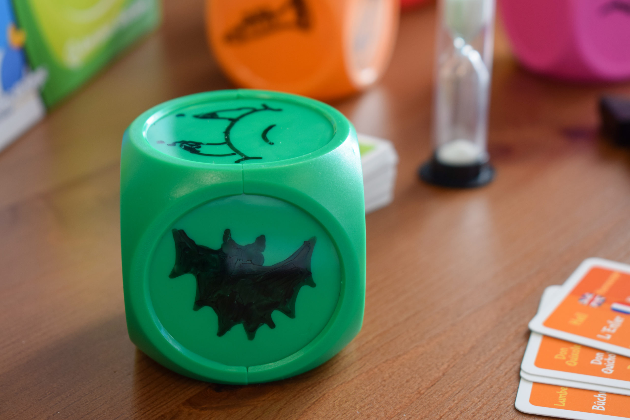 Côté matériel, les dés sont de bonne facture, on arrive à bien effacer ce que l’on y dessine et c’est tant mieux puisque si le jeu vous plait, vous risquez d’écrire souvent dessus. Petit bémol concernant les feutres qui ont selon moi des mines un peu trop épaisses, d’ailleurs je me demande bien qui peut dessiner les dessins que l’on voit sur l’illustration de la boîte avec des mines aussi épaisses !!! Mais ça ne gâche rien au plaisir du jeu puisque de toute façon, peu de personnes savent aussi bien représenter des objets ou animaux !! 😉