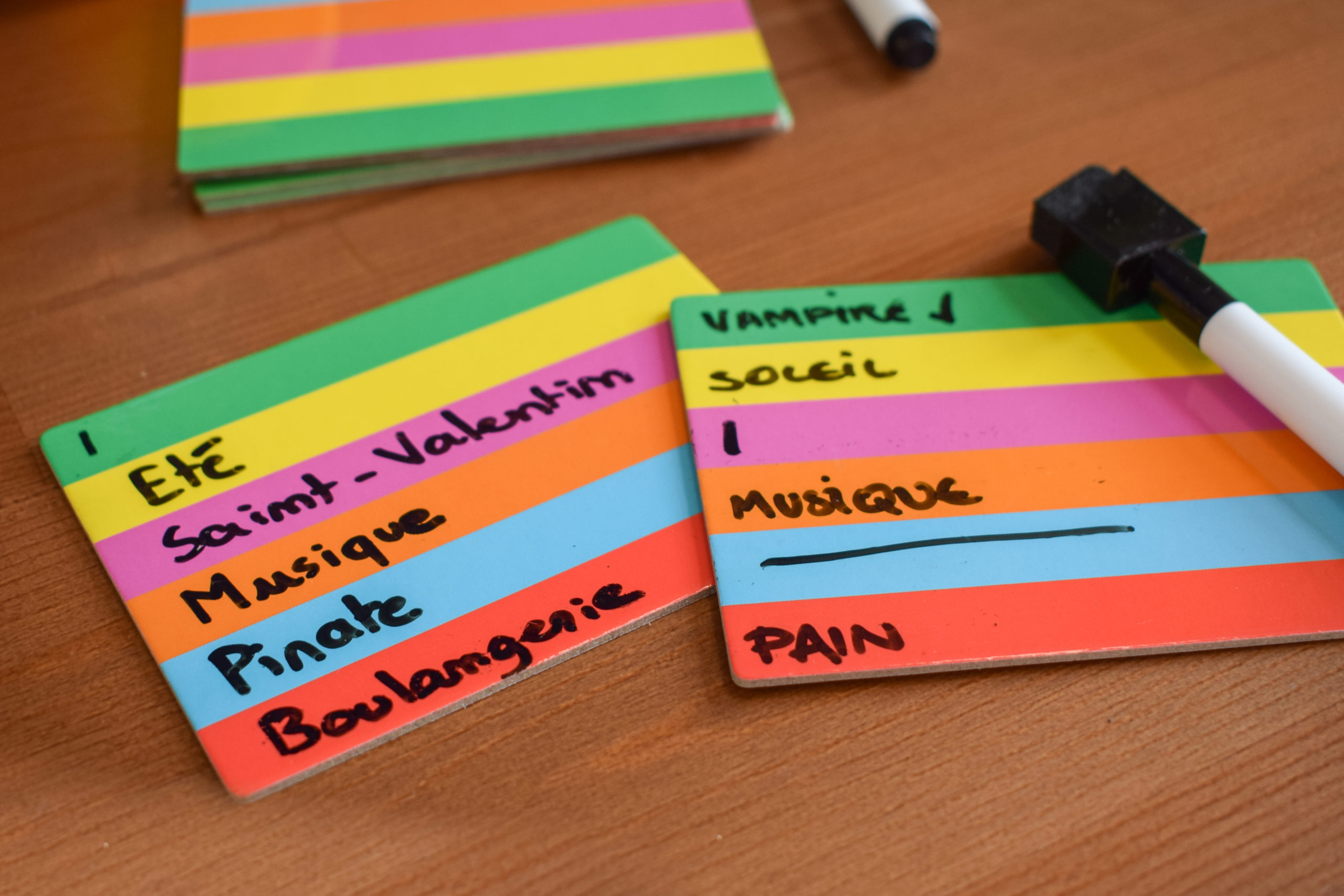 Notez-les sur votre plaquette et le 1er joueur à avoir noté tous les thèmes commence à décompter de 10 à 0, puis tous les joueurs arrêtent d’écrire.