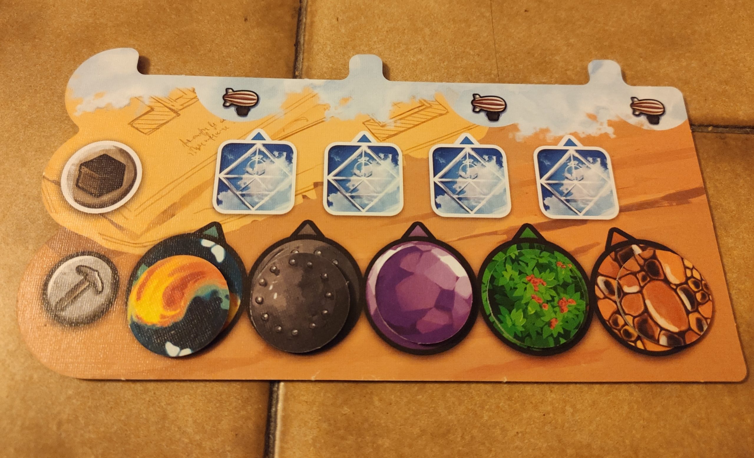 Telle une bourse céleste, le plateau central va fixer la valeur de chaque ressource. Cette valeur varie au fur et à mesure de la partie avec les actions des joueurs. Quand on récupère un chantier avec le symbole cotation, le joueur choisit de retourner un jeton ressource sur son autre face ressource, et donc le déplace dans la zone correspondante. Il fait donc diminuer de 1 la valeur de la ressource de départ, et augmente de 1 la valeur de la ressource de la nouvelle face du jeton.